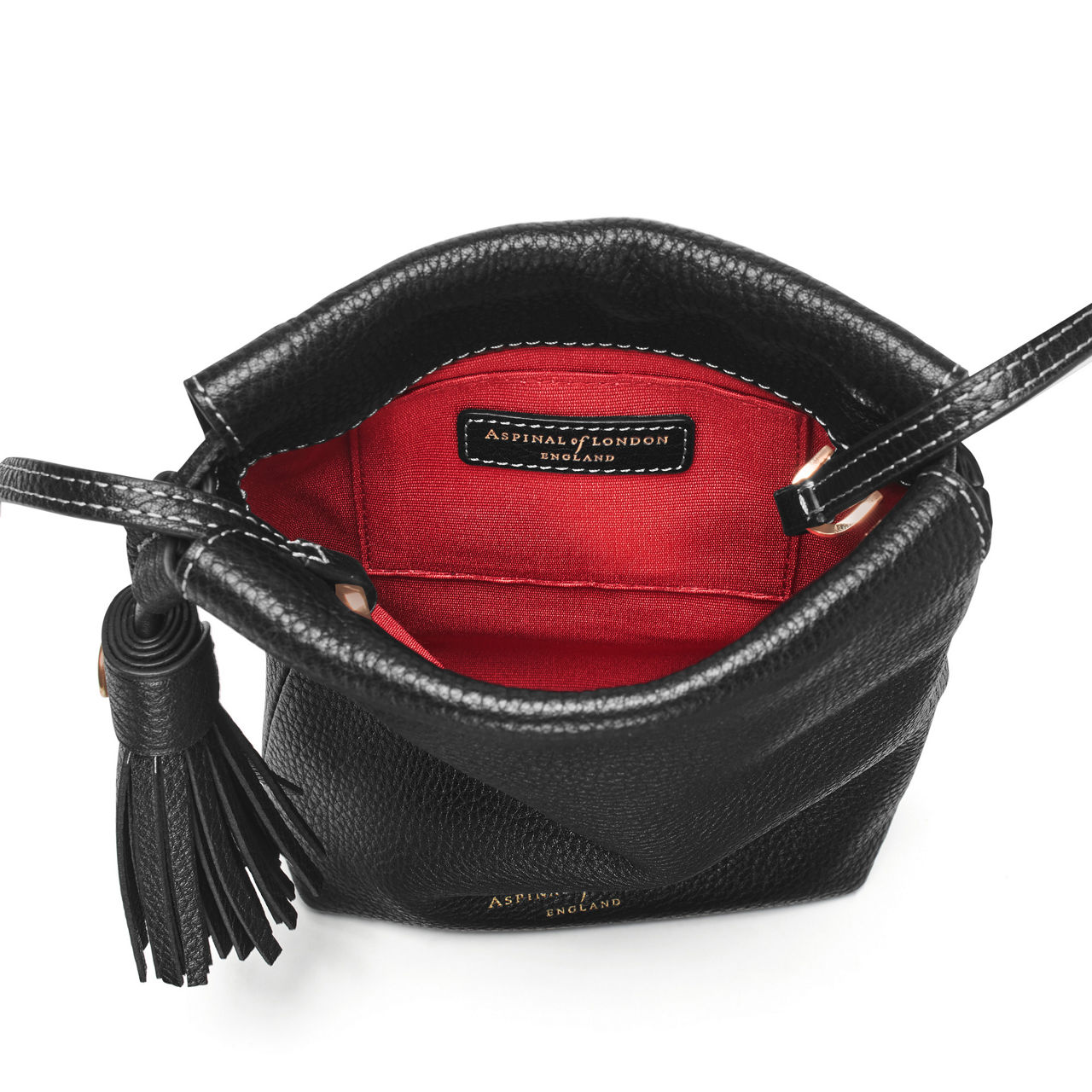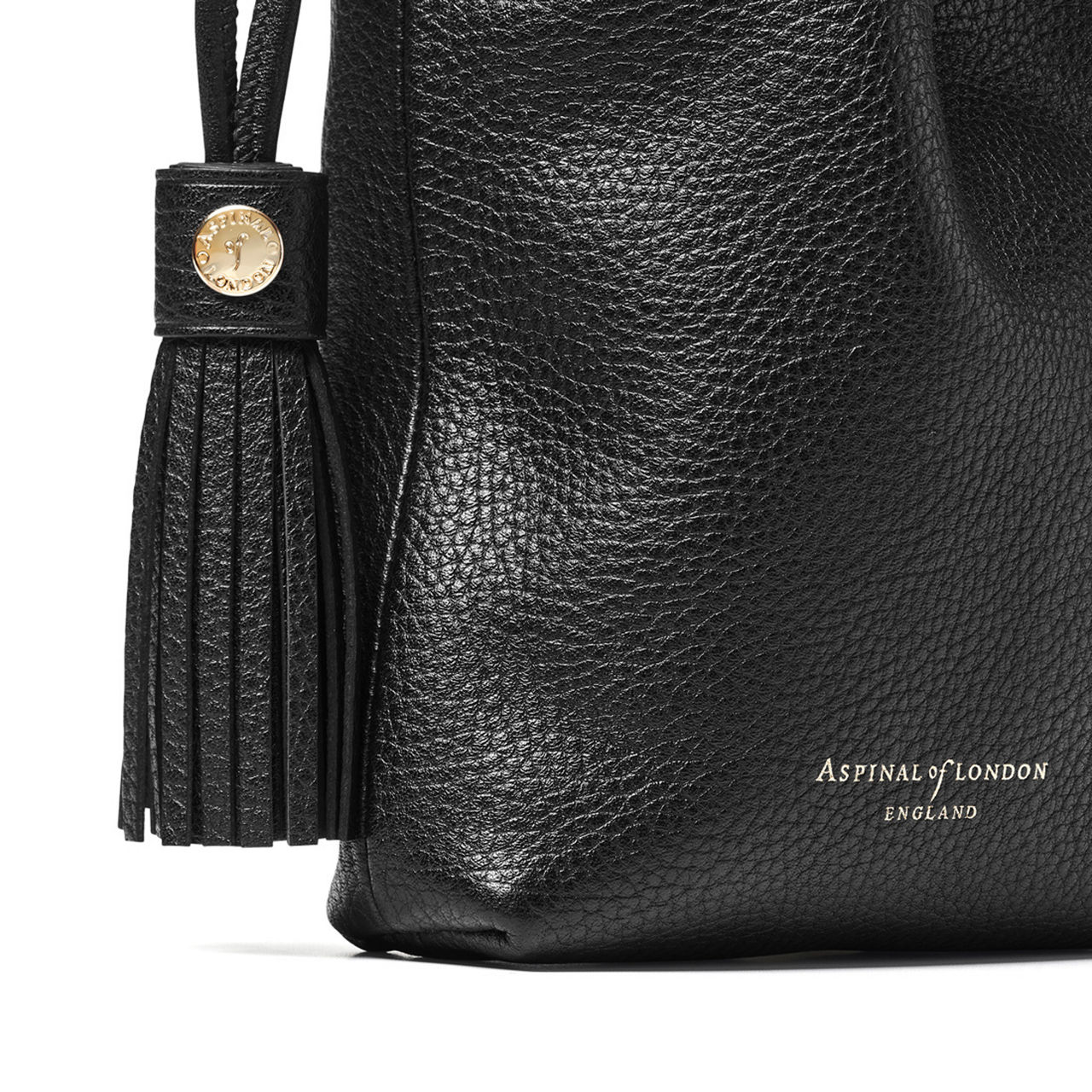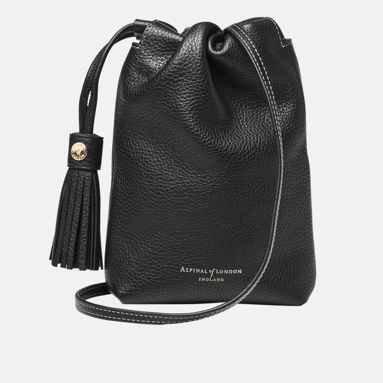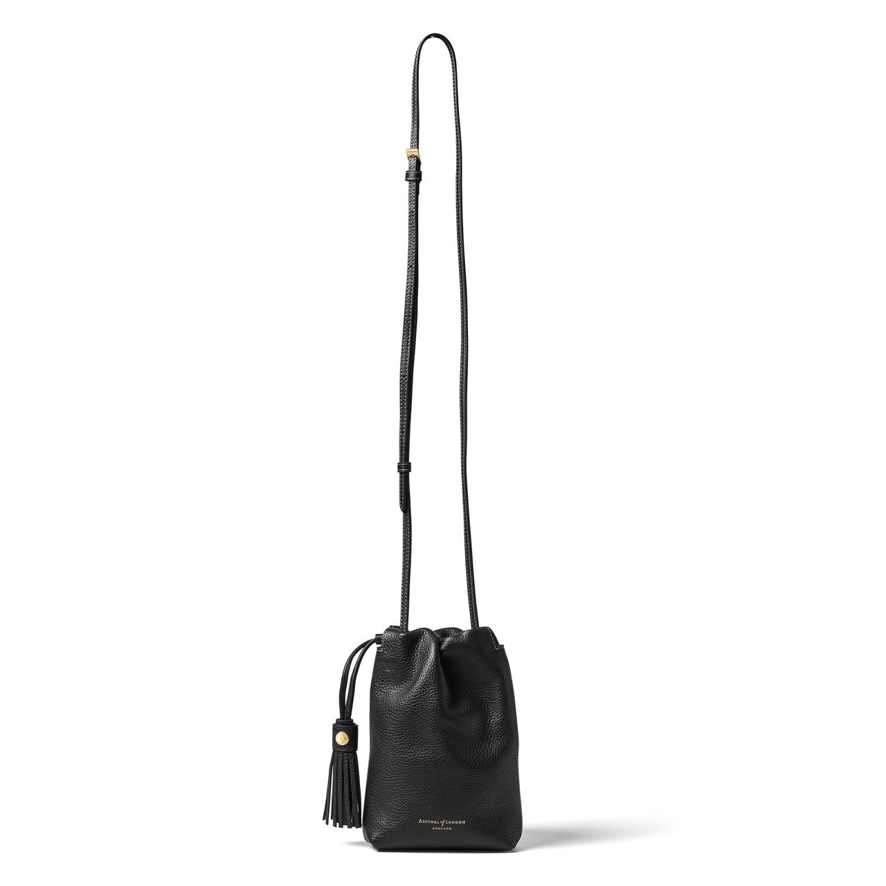 - Drawstring closure, leather tassel, handcrafted from pebbled leather, soft-feel, crossbody strap, lining, logo detail, signature hardware