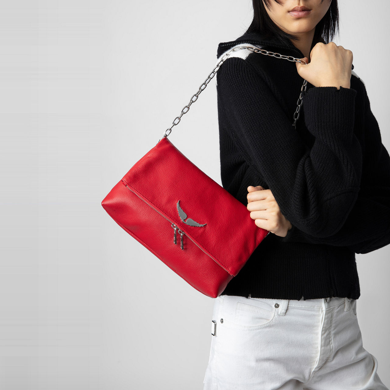 - Zip fastening, several compartments, one large interior pocket with zip fastening, removable metal chain, removable and adjustable leather shoulder strap, mirrored metal wing design, grained leather finish, carry on the shoulder or across the body