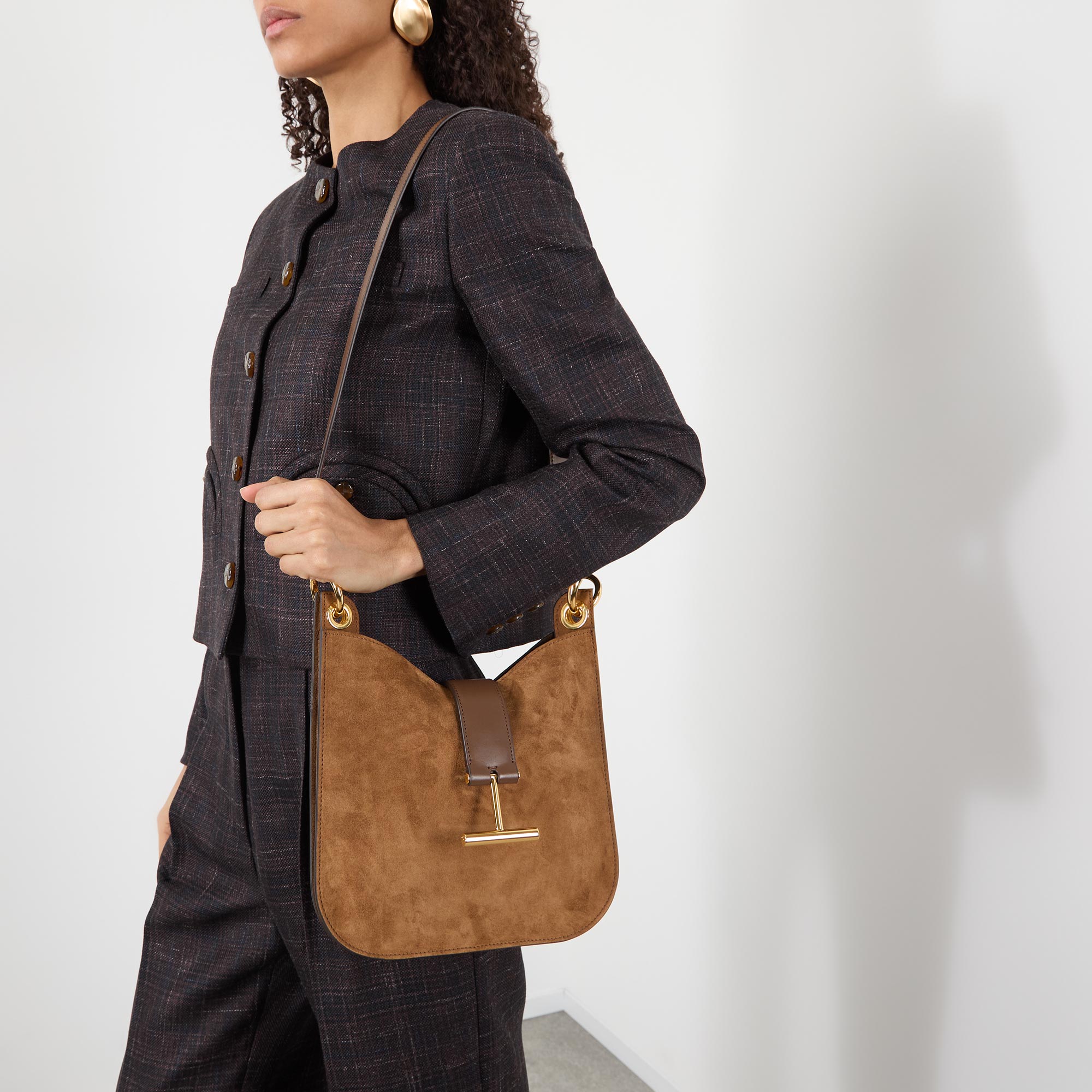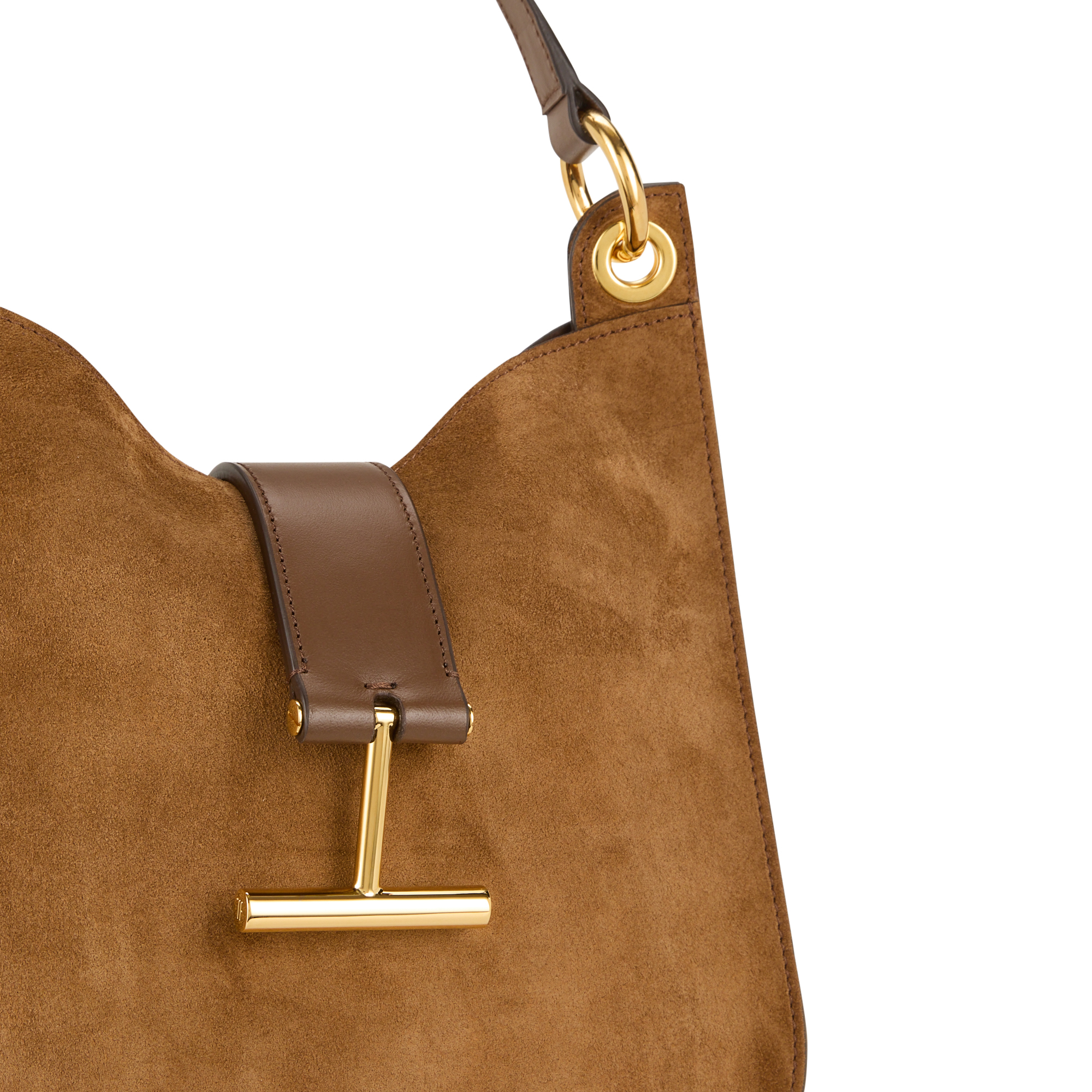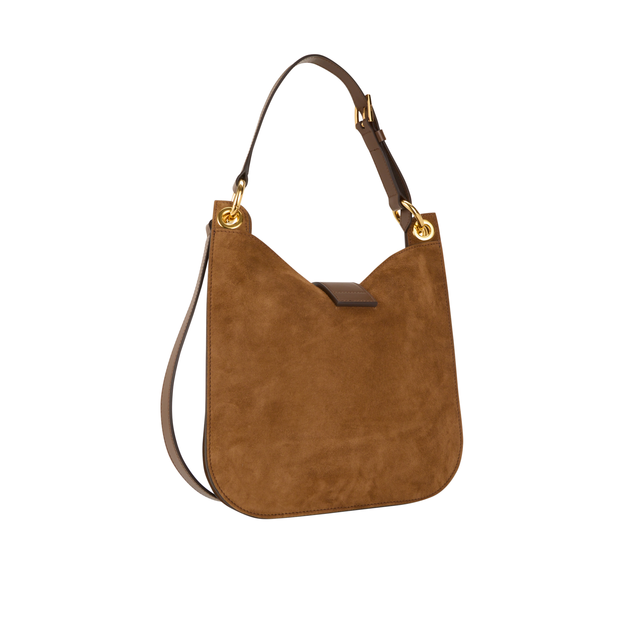 • Strap with magnetic dot fastening, detachable and adjustable shoulder and crossbody straps, gold-tone hardware, curved edges, suede finish