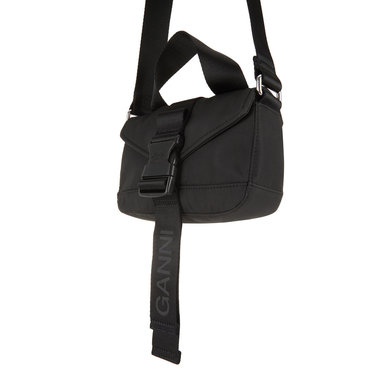 - Top handle, flap closure with buckle fastening, one main compartment, webbing logo detailing