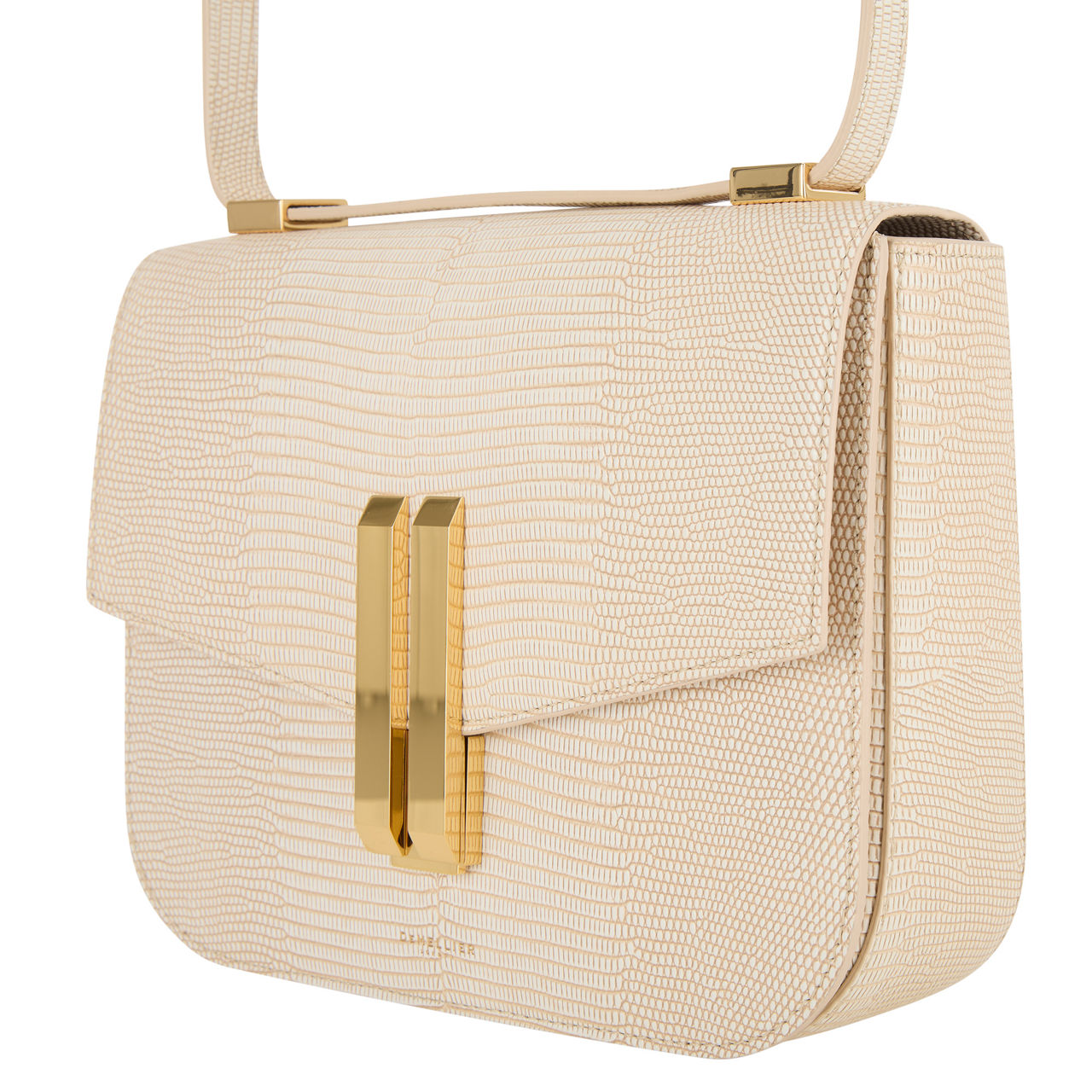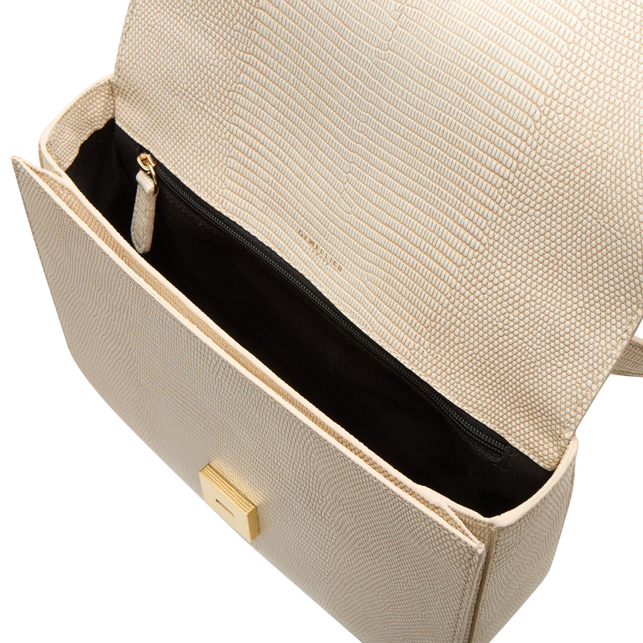- Flap closure with clasp fastening, adjustable crossbody strap, gold-tone hardware, tonal stitching, lizard-embossed leather finish, rounded edges, logo detail