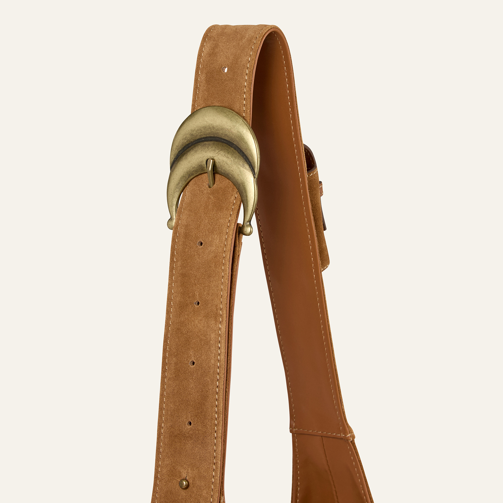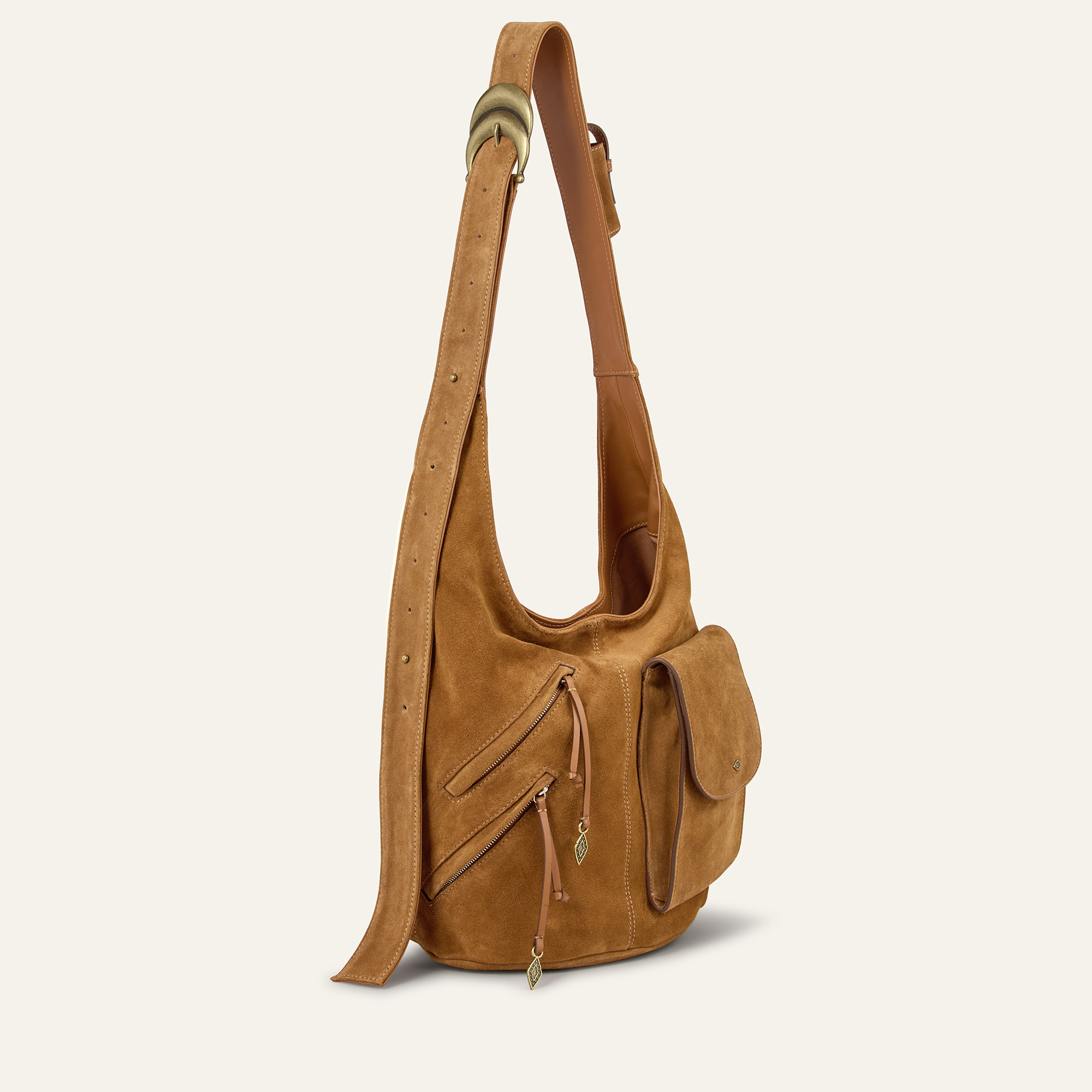 - Premium suede construction, wide adjustable strap, signature metal buckle hardware, shoulder or cross-body wear, concealed press-stud fastening, functional outer pockets