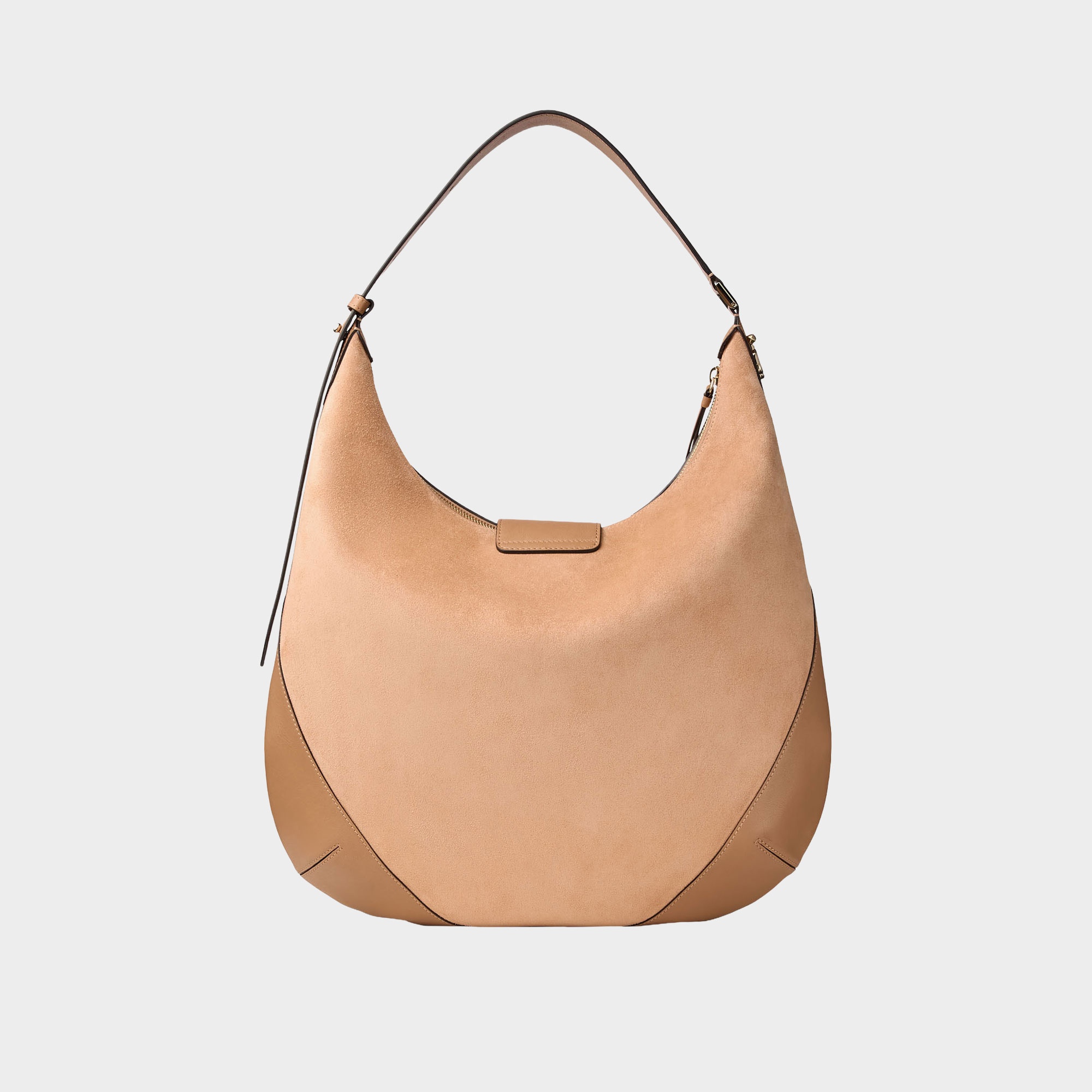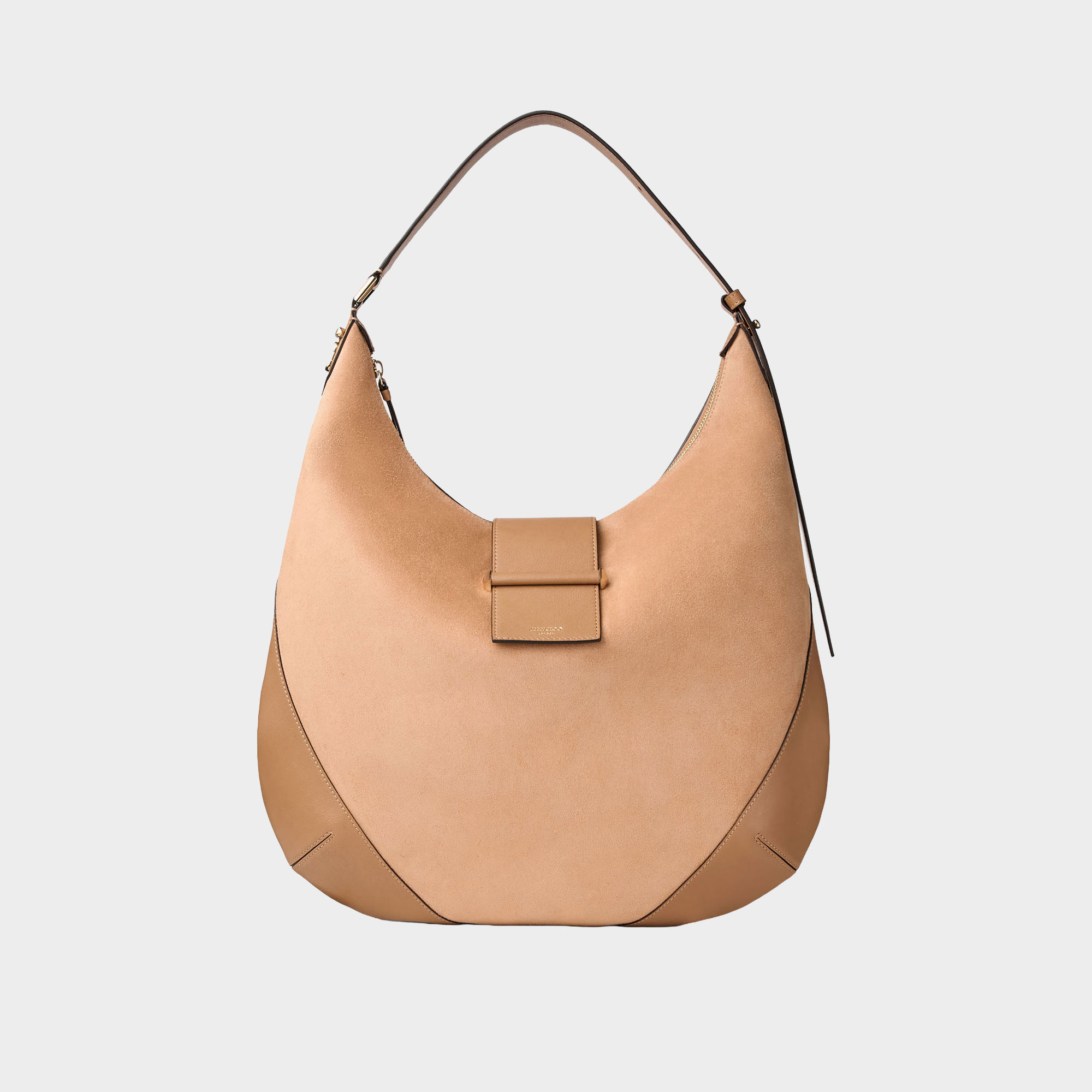 - Suede finish, polished gold-tone bar, logo monogram, adjustable shoulder strap, leather trims