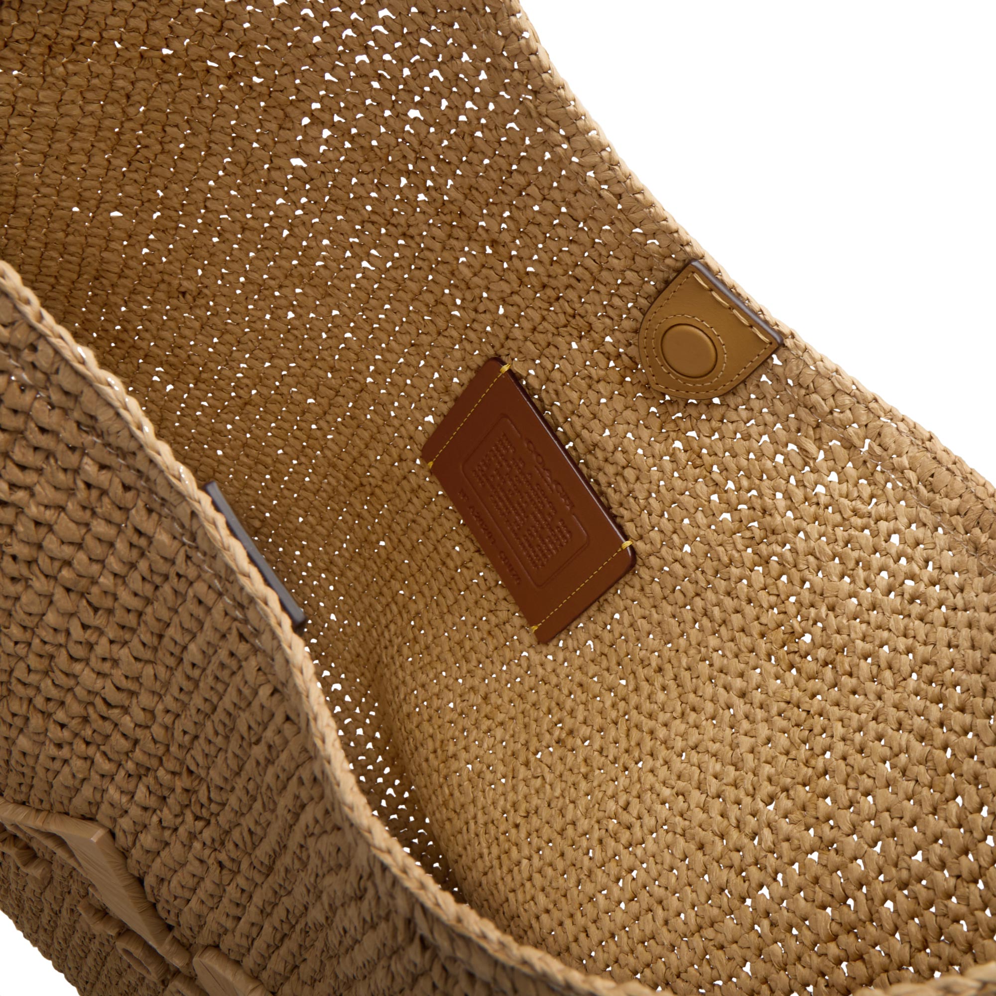 - Weave straw texture, hobo silhouette, wide shoulder strap, magnetic snap closure, tonal logo, interior pocket