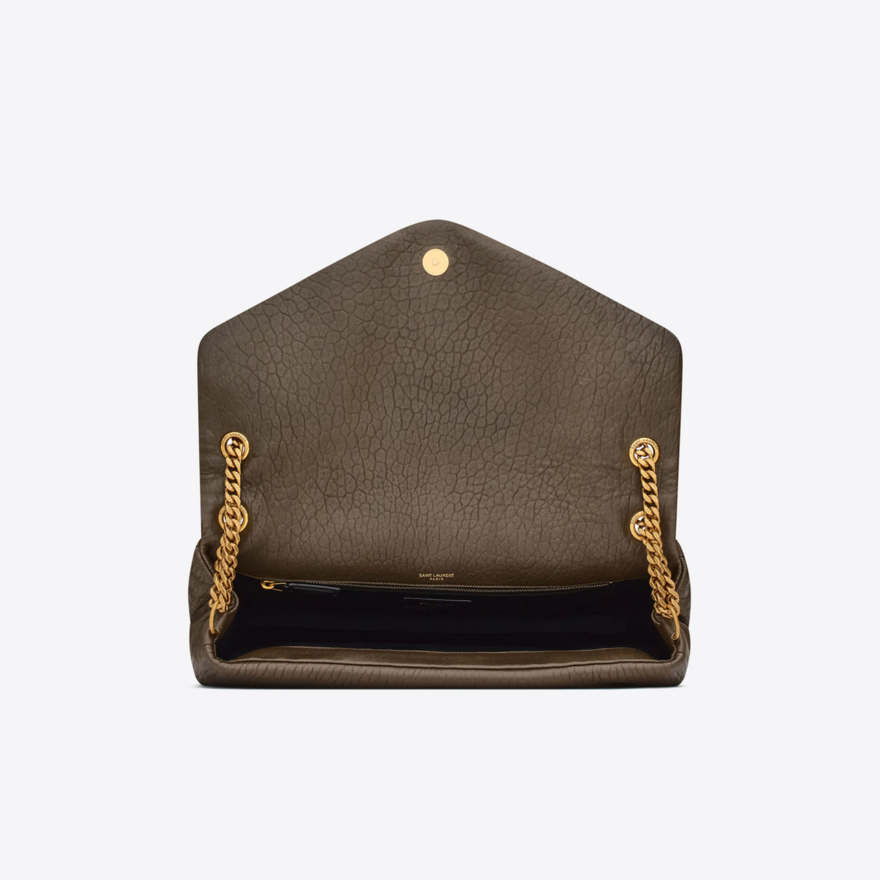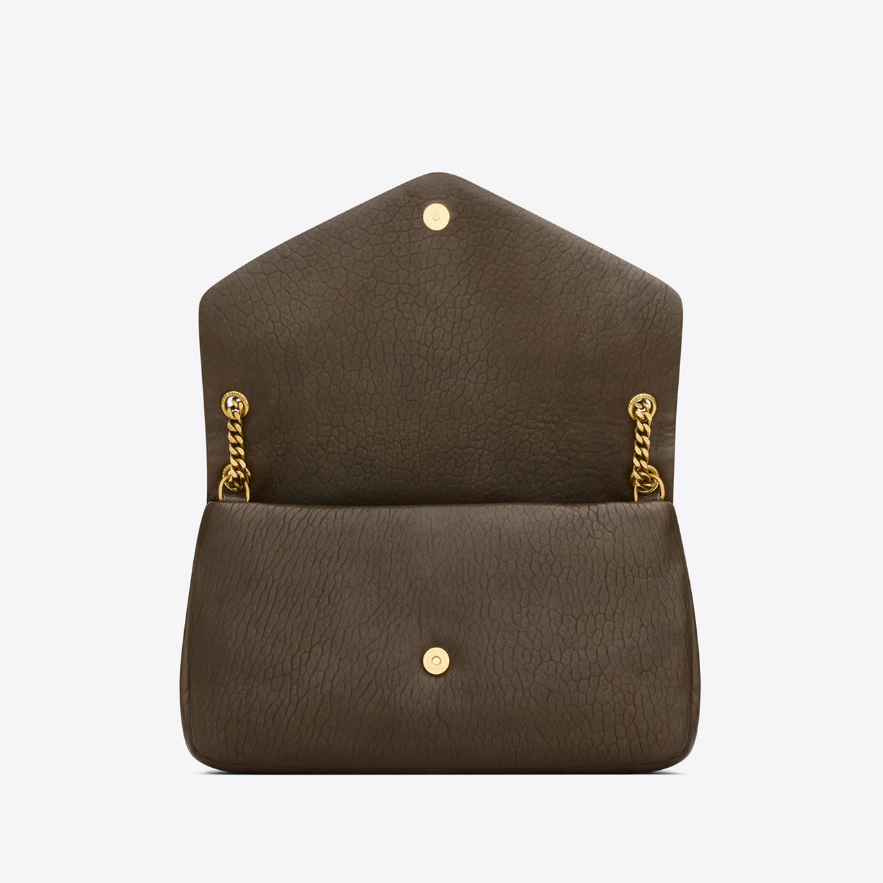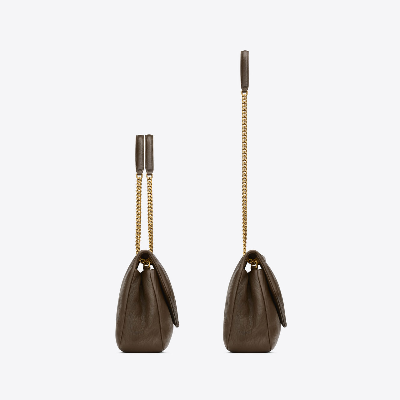 • Flap fastening with snap-button closure, adjustable sliding chain shoulder strap, grained finish, grosgrain lining, bronze-tone hardware, logo details, envelope style
