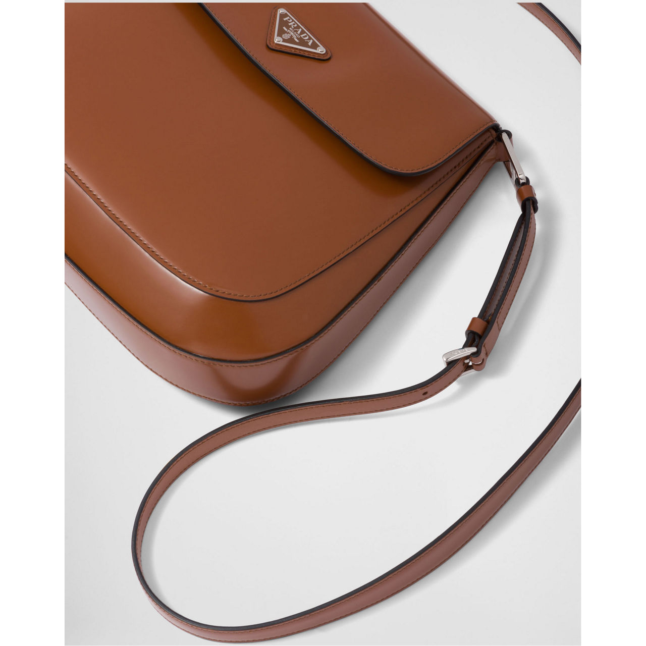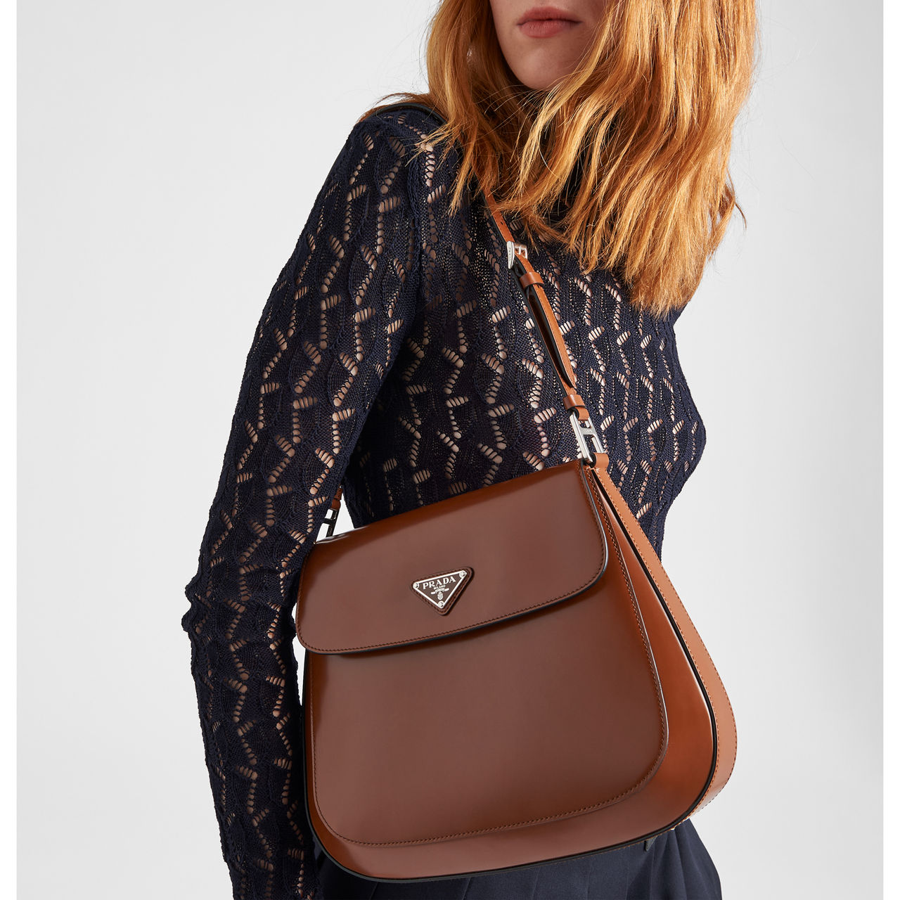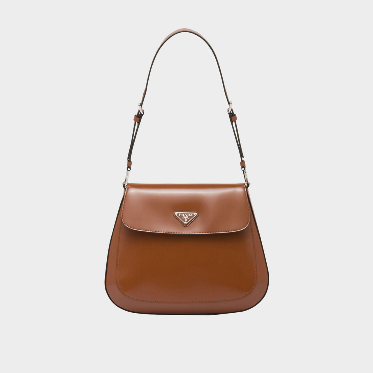 The Prada Cleo bag offers sophisticated allure, drawing on the House's extensive archives to bring a '90s silhouette to a modern and sleek design. With a rounded base and a strap that allows cross-body and shoulder wear, this style is crafted in brushed leather and finished with an enamelled triangle logo to the flap in order to craft a timeless bag with versatile style.
