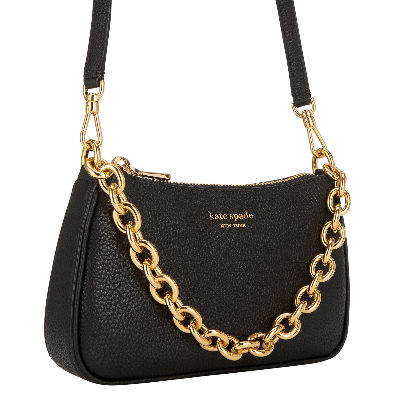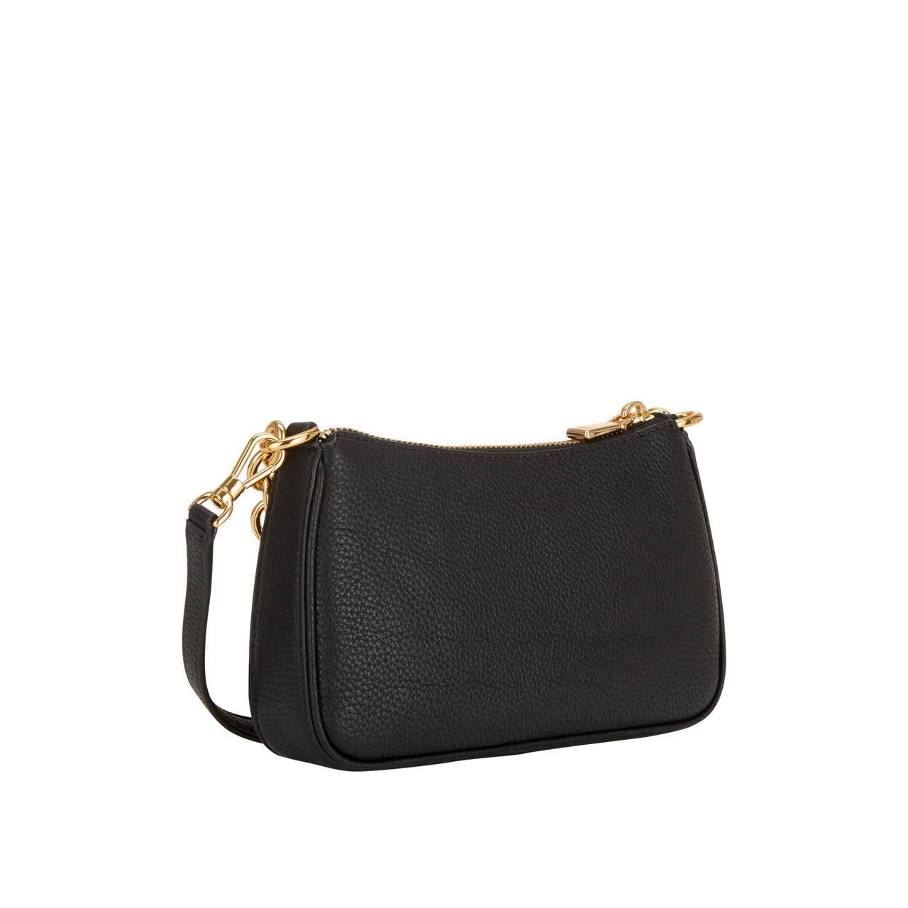 - Top-zip fastening, one main compartment, three interior card slots, chain strap, additional detachable shoulder strap, logo lettering on the front, gold-tone hardware, grained leather finish