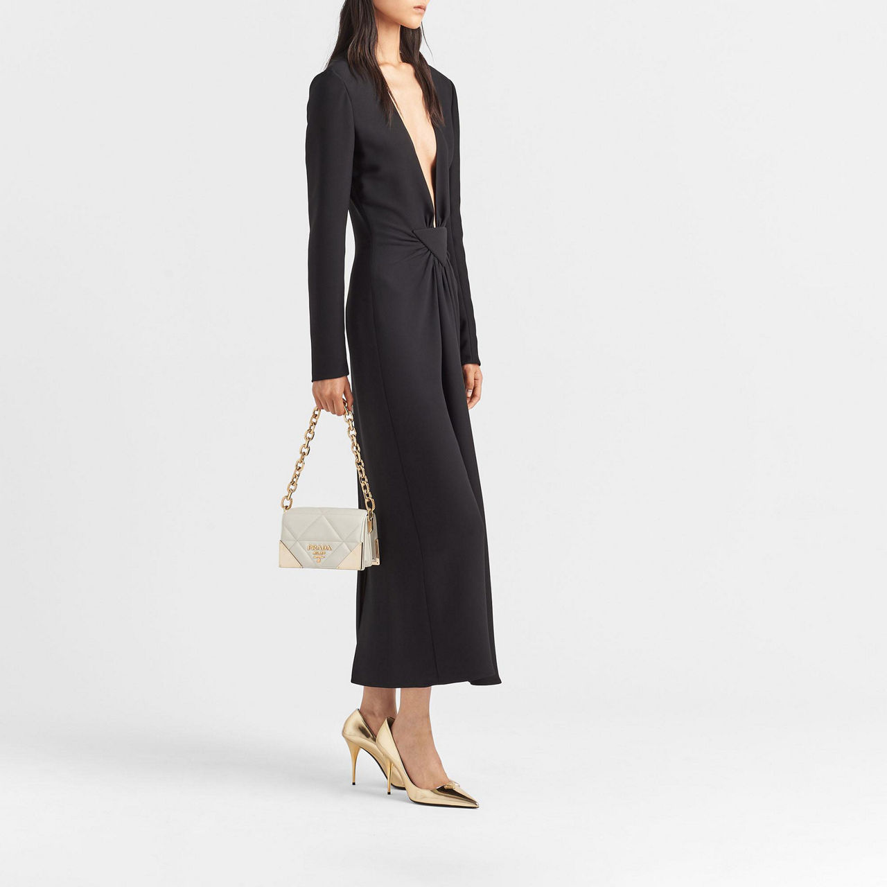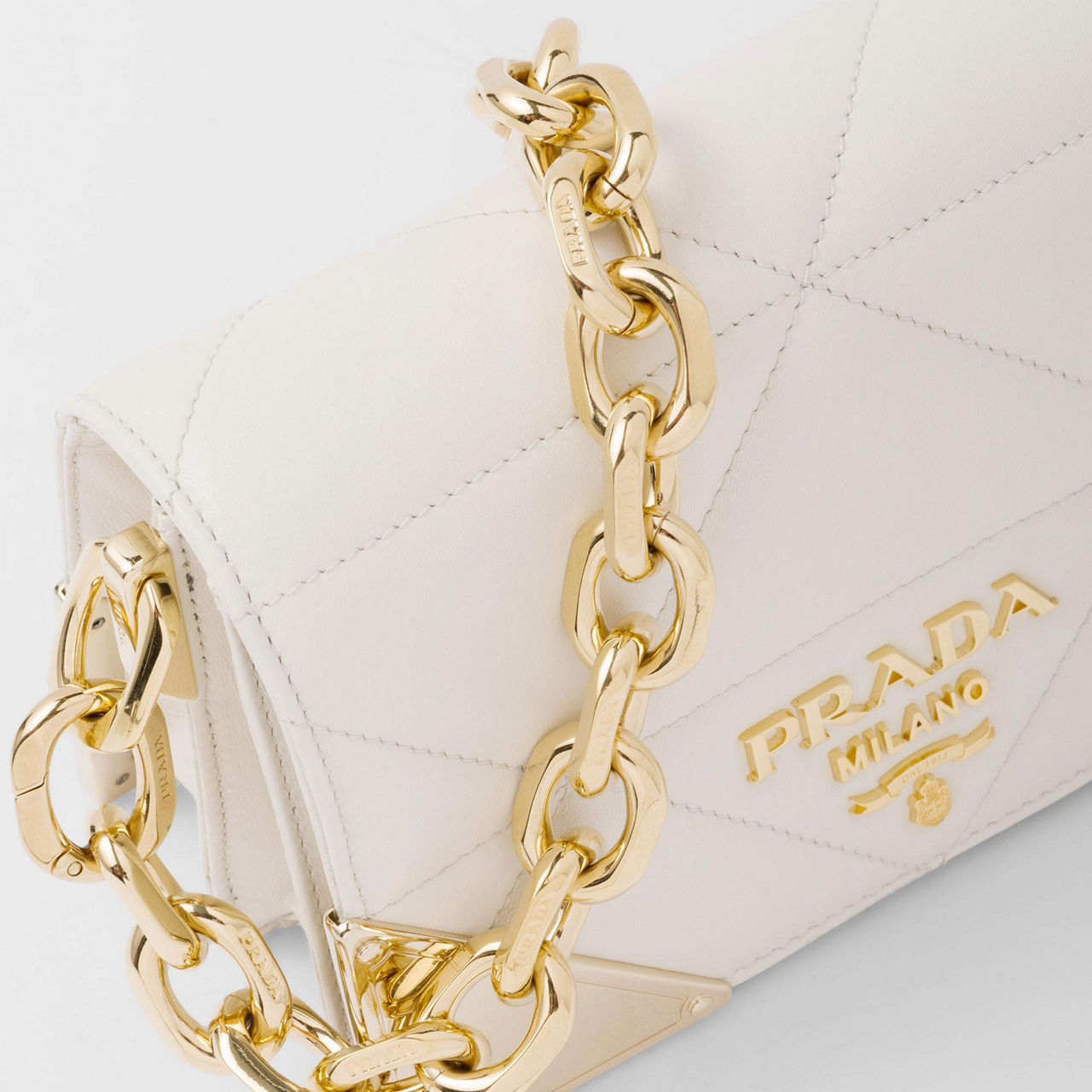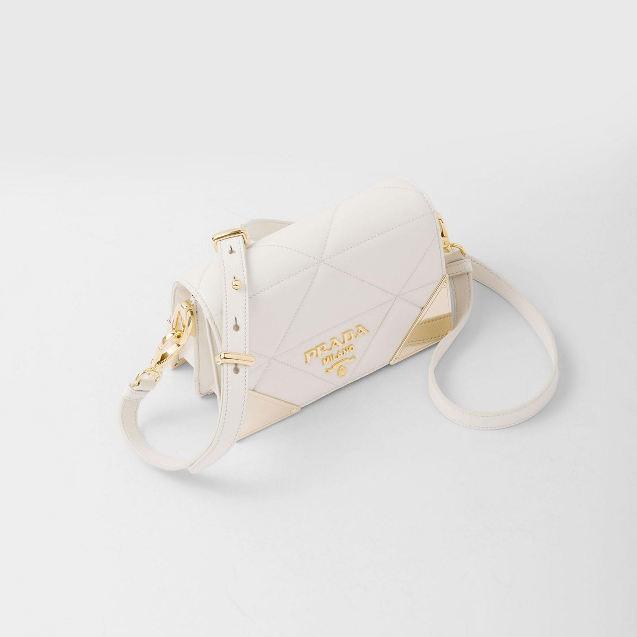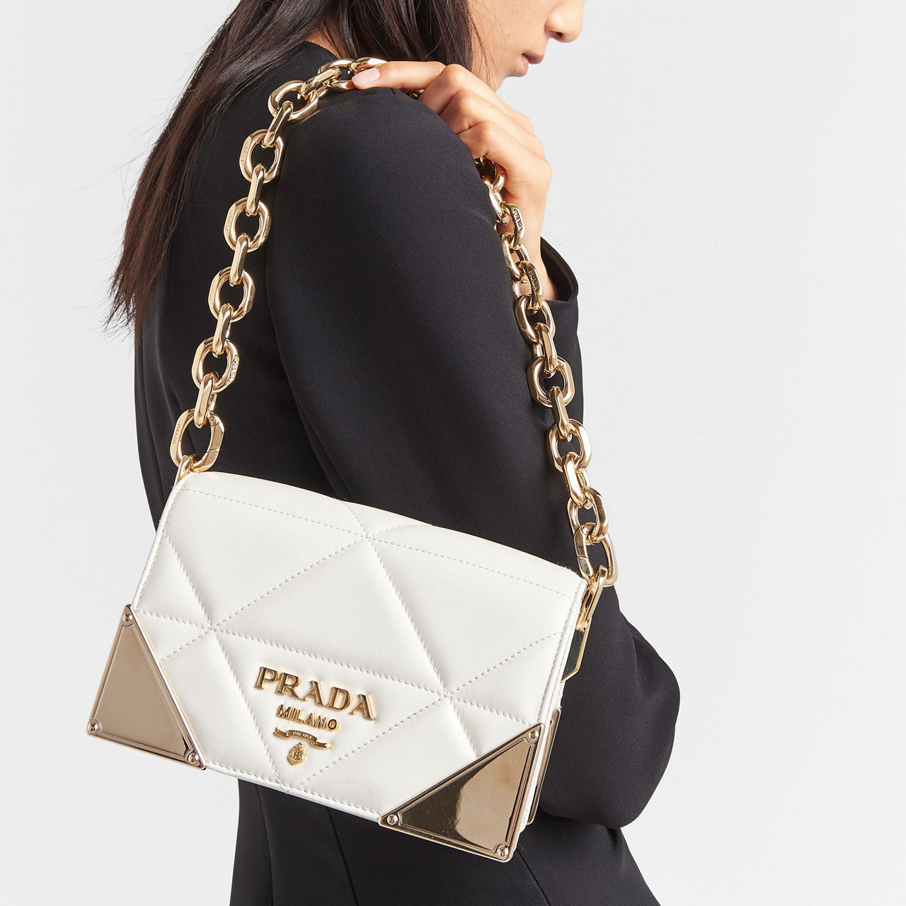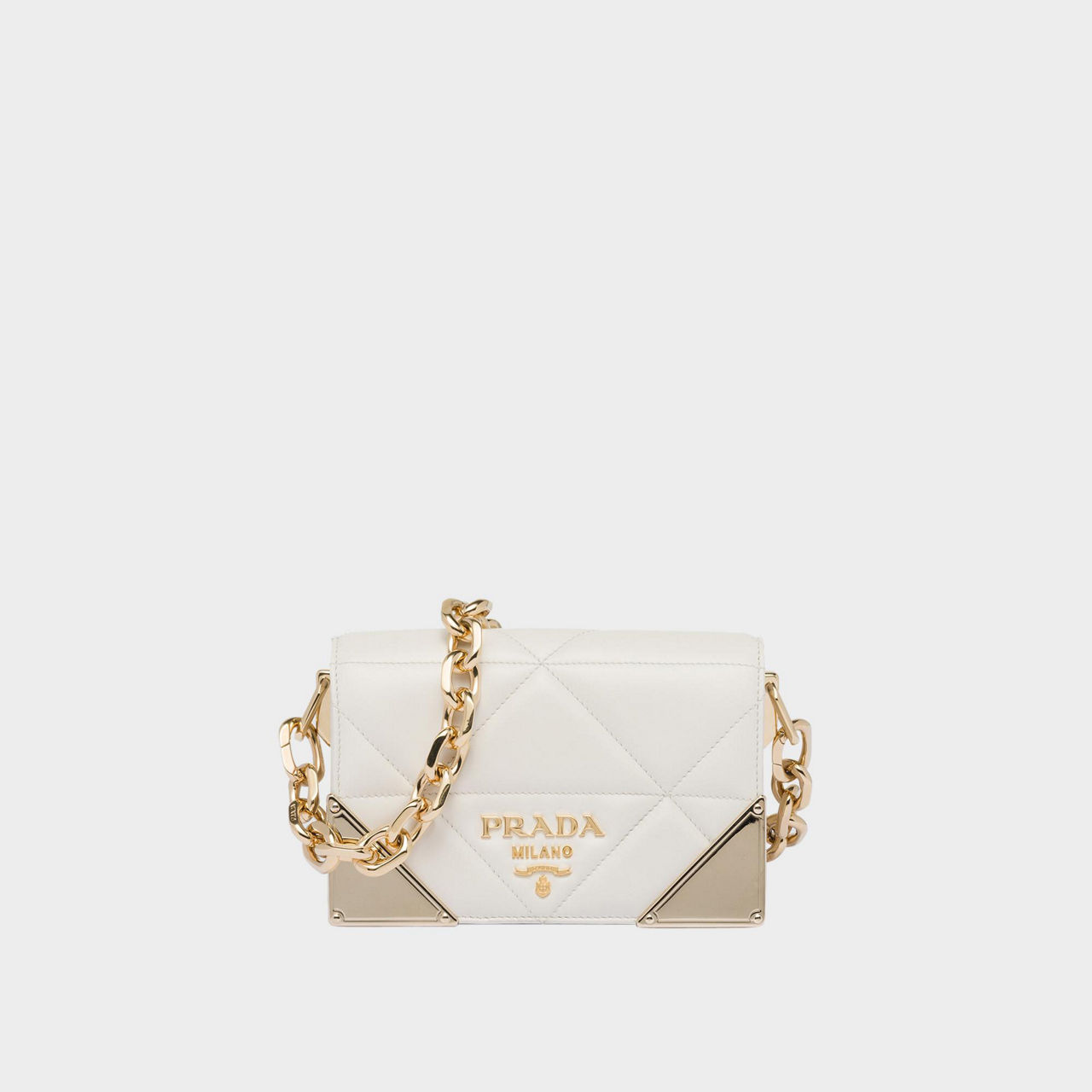 Crafted to a structured silhouette, this luxurious bag from Prada works a textural quilted leather design, further elevated by refined gold tone detailing. A play on the brand's signature triangle logo, its carefully thought out geometric finish gives this bag elegant contemporary edge. With an optional leather or chunky chain strap, this timeless piece can be worn exactly how you want to style it.
