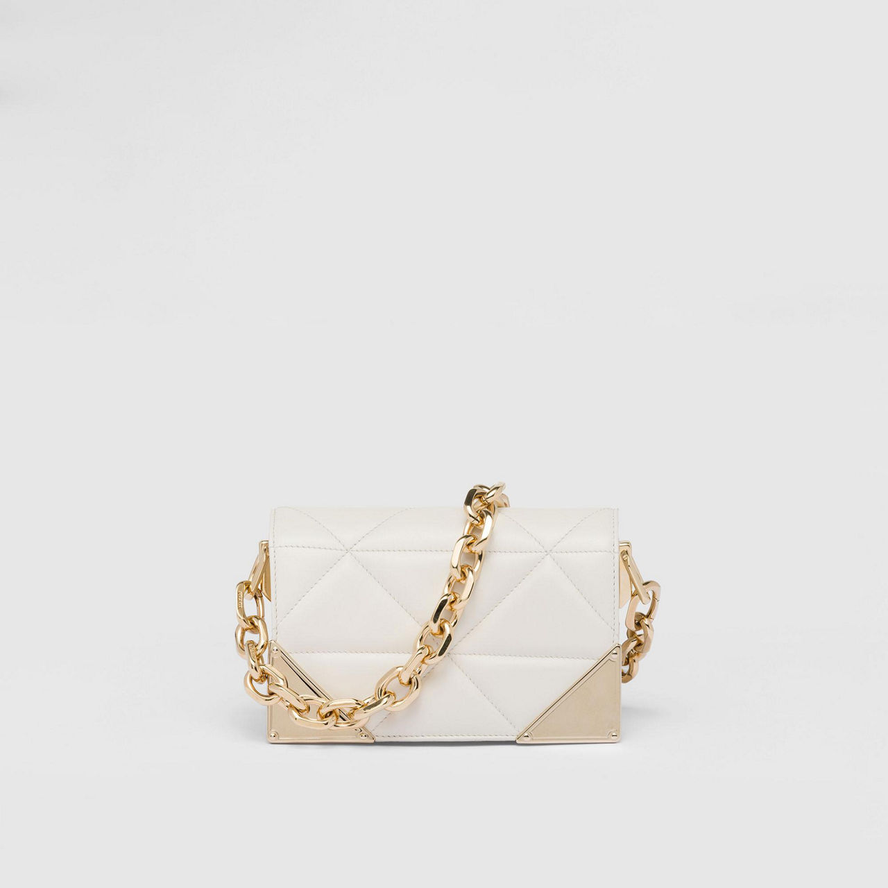 - Flap closure, magnetic fastening, gold tone hardware, detachable and adjustable leather strap, quilted finish, metal brand lettering