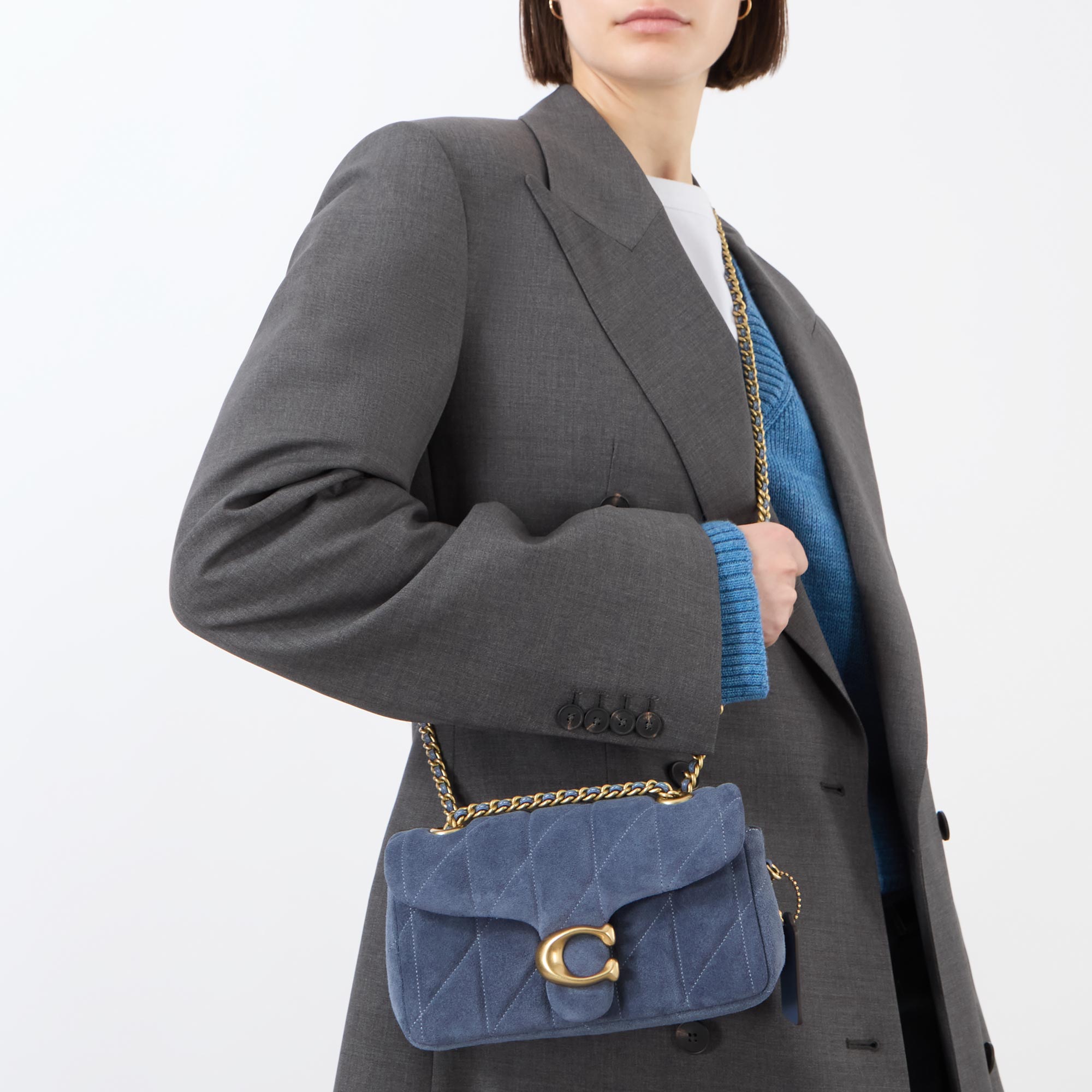 • Braided and adjustable shoulder strap, quilted, topstitch details, flap closure, logo detail, hanging branded swingtag, rear slip pocket, gold-tone hardware, suede finish
