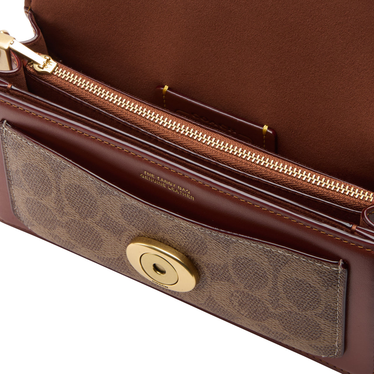 - Top handle, shoulder strap, flap closure with magnetic snap fastening, signature hardware with gold-tone finish, hanging charm, one front slip pocket in contrasting logo design, one rear slip pocket, smooth design