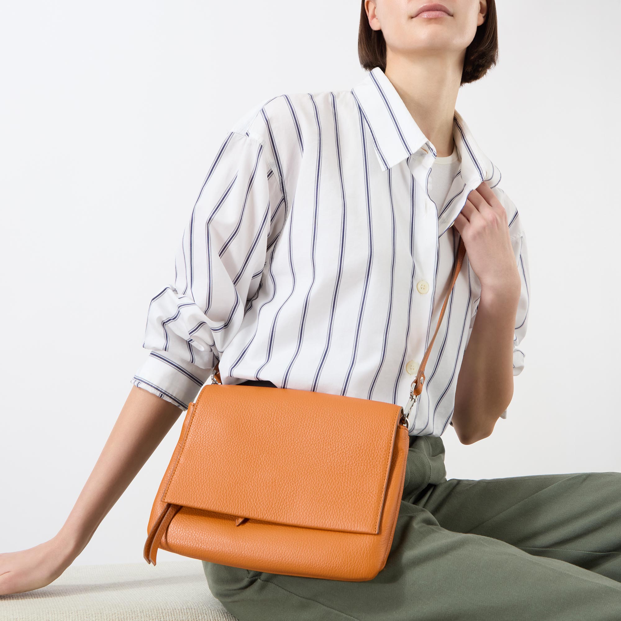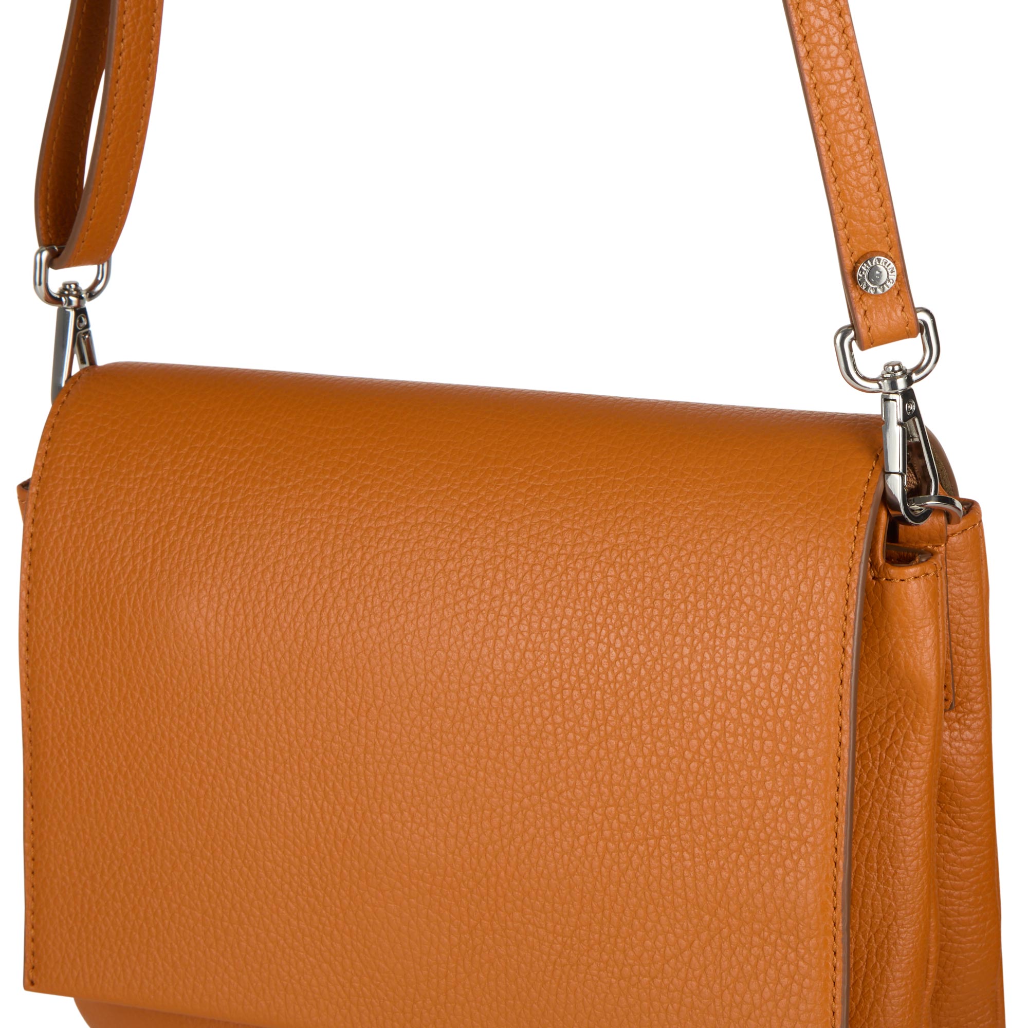 - Foldover flap closure, magnetic fastening, detachable adjustable strap that can be worn over the shoulder or across the body, rear logo branding, tonal stitching, front zip pocket hidden by flap, silver-tone hardware, textured grained leather finish