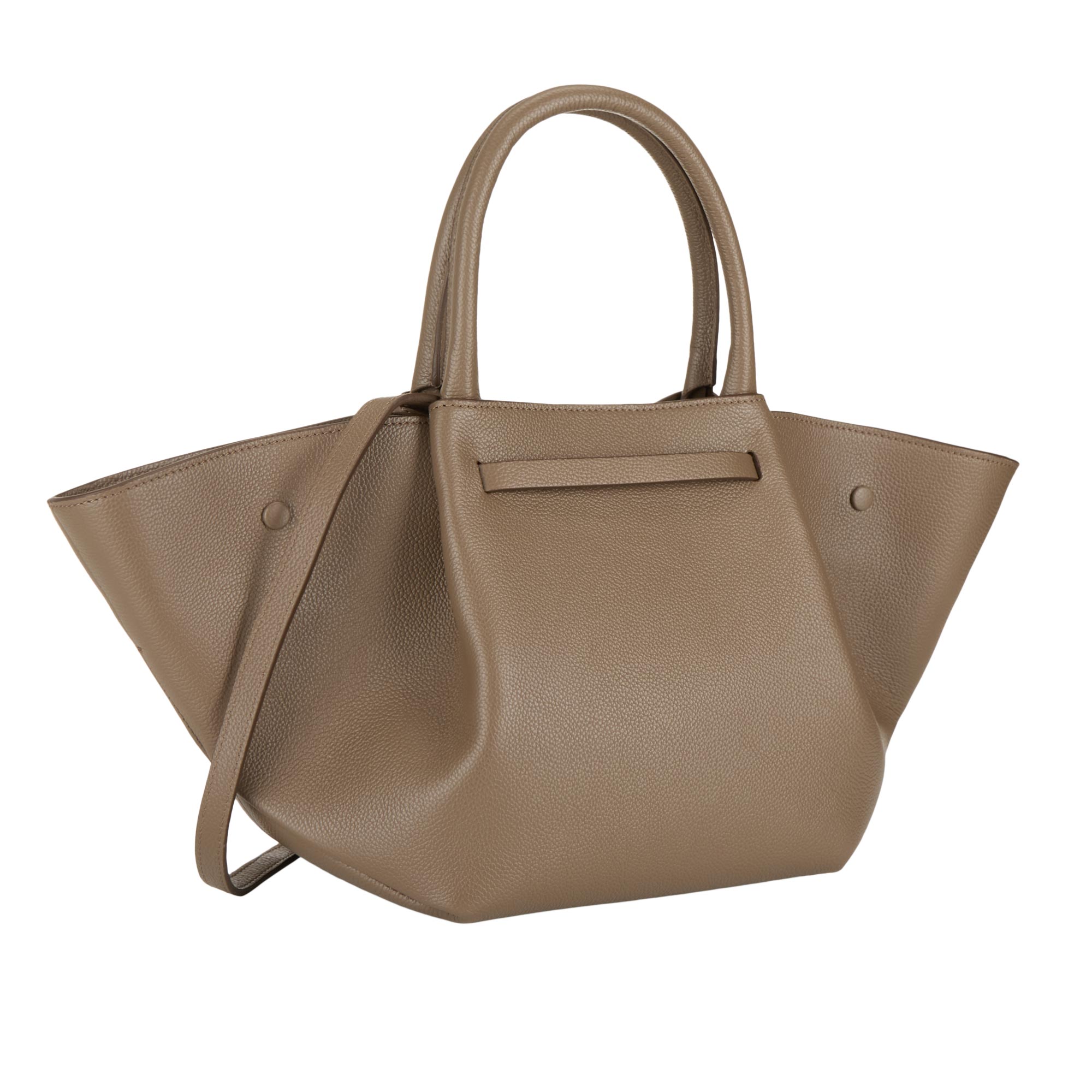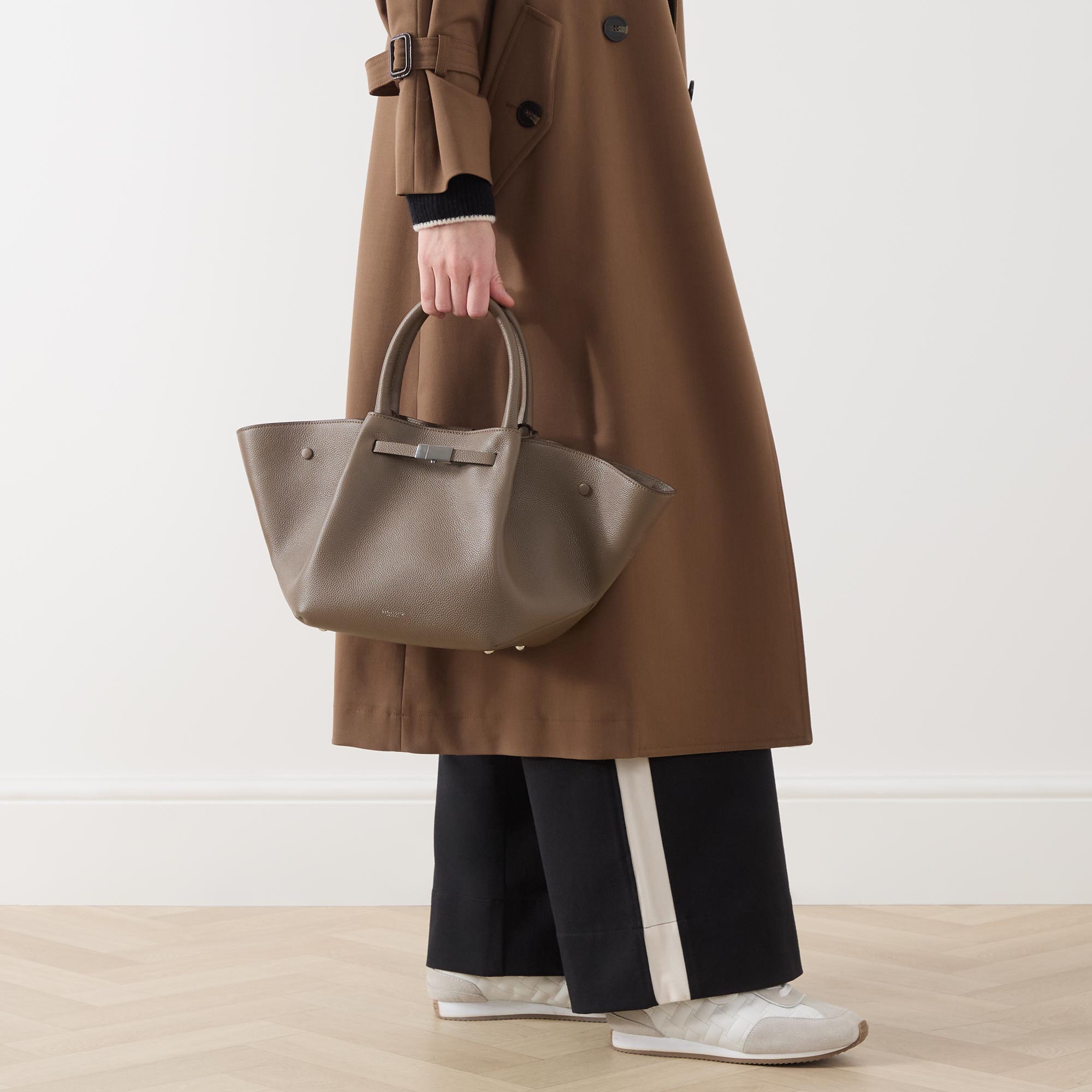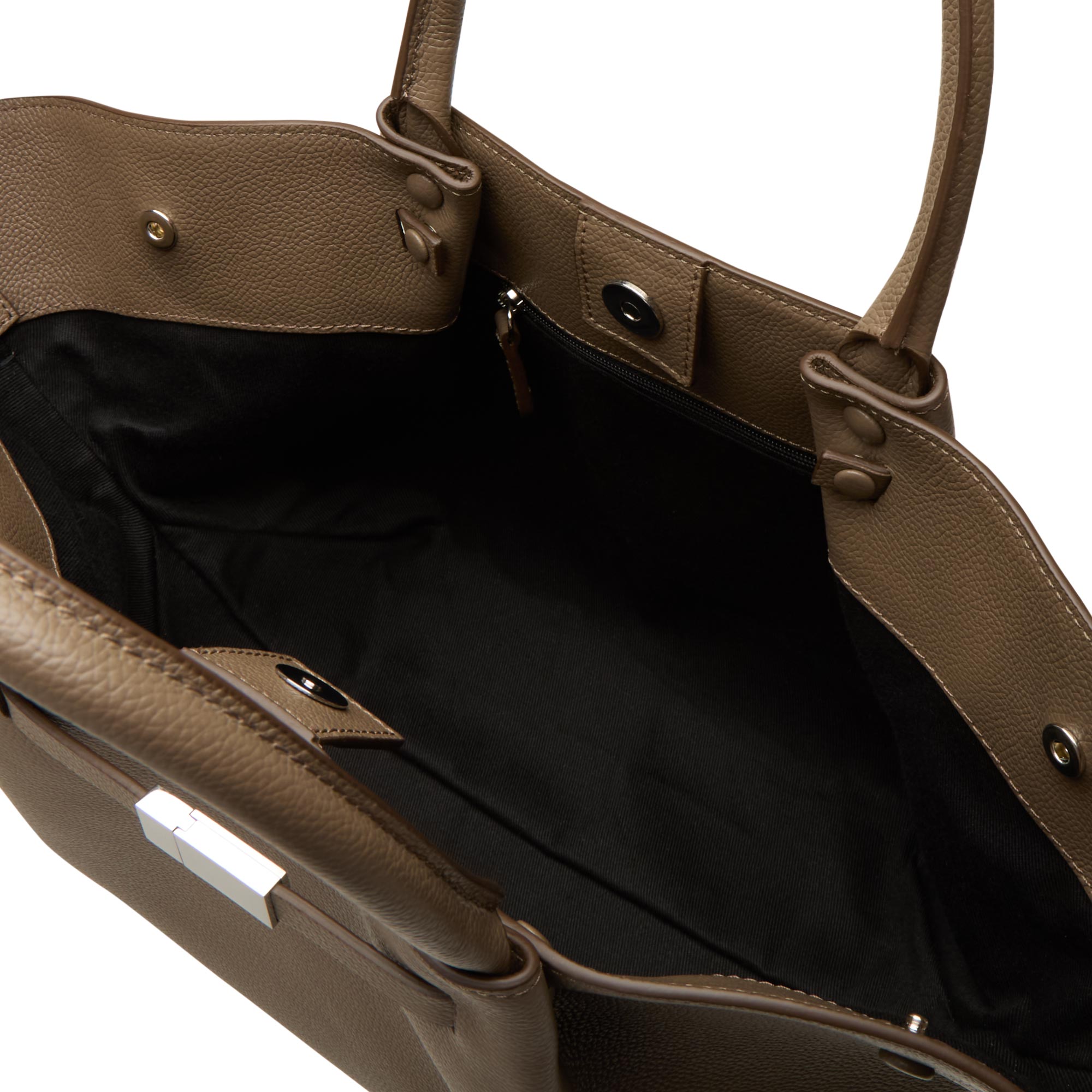 - Tubular top handles, central internal magnetic fastening, triangular folds on each side, metal foot studs, silver-tone hardware, tonal stitching, foil logo detail, grained leather finish