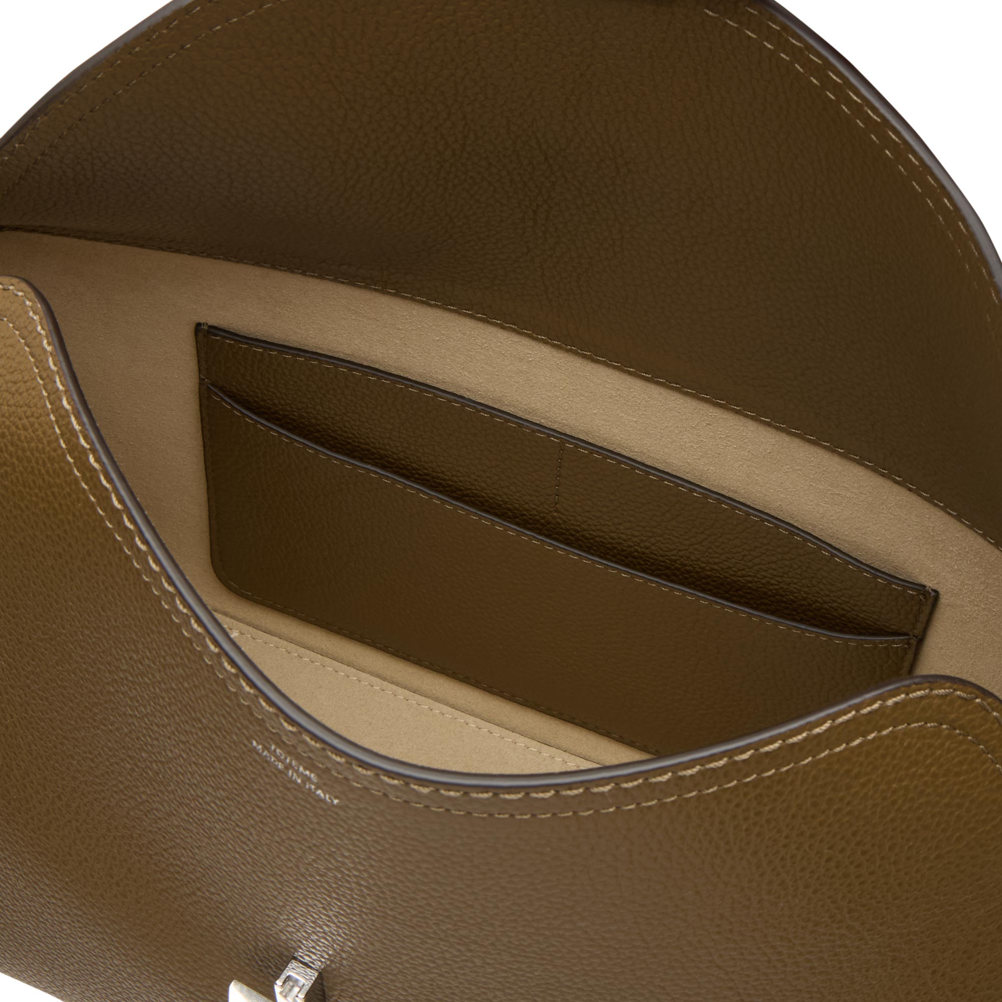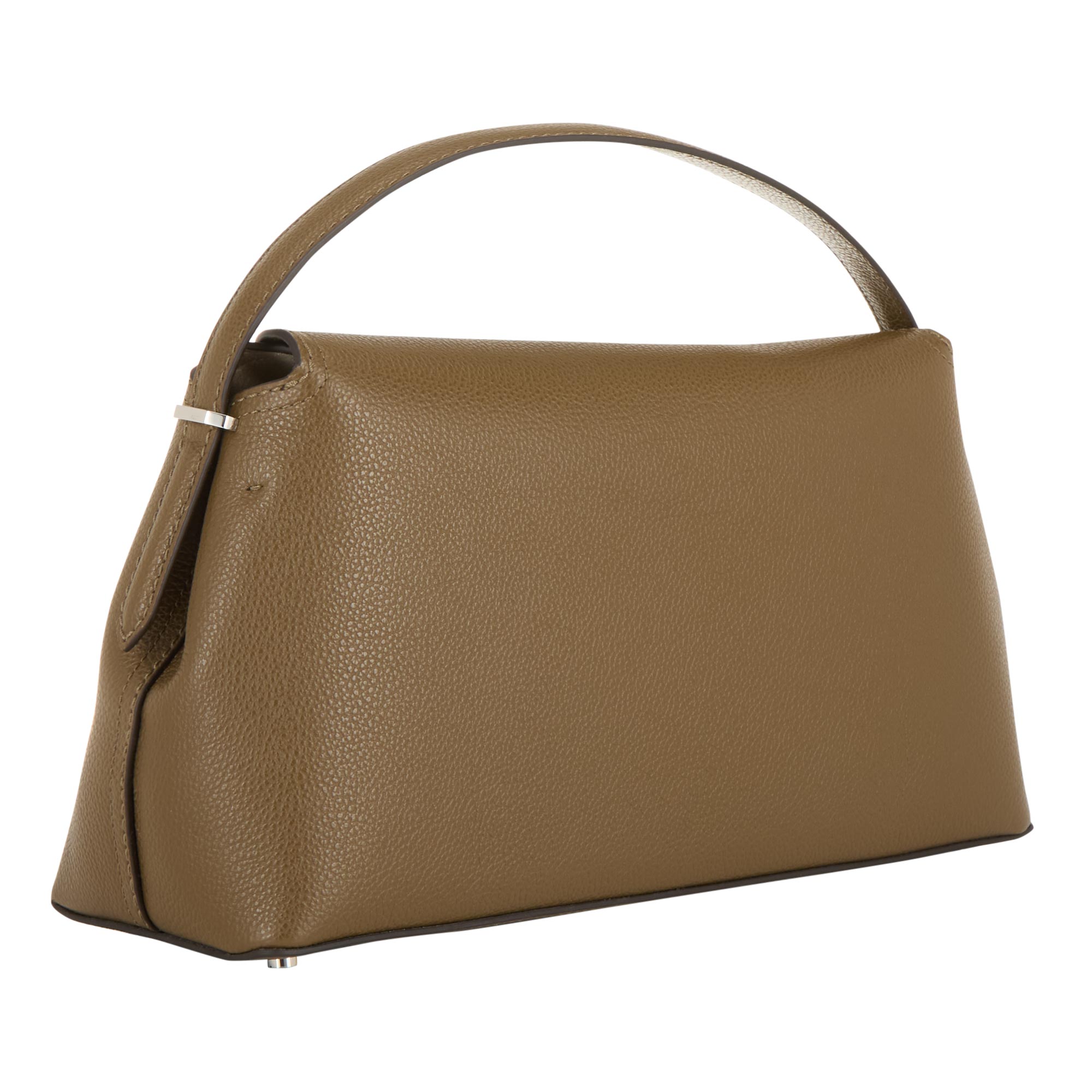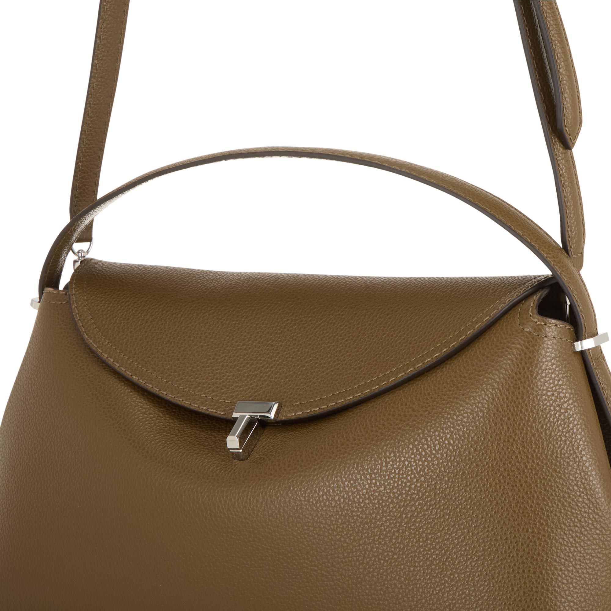• Flap closure with T-lock fastening, silver-tone hardware, top carry handle, optionable removable strap, tonal stitching, metal protective studded feet, grained leather finish