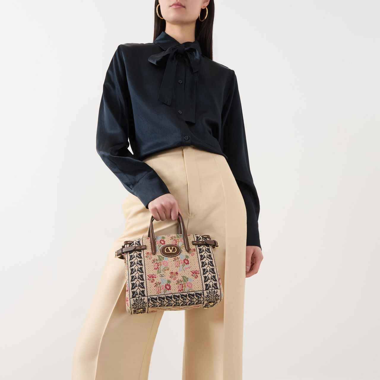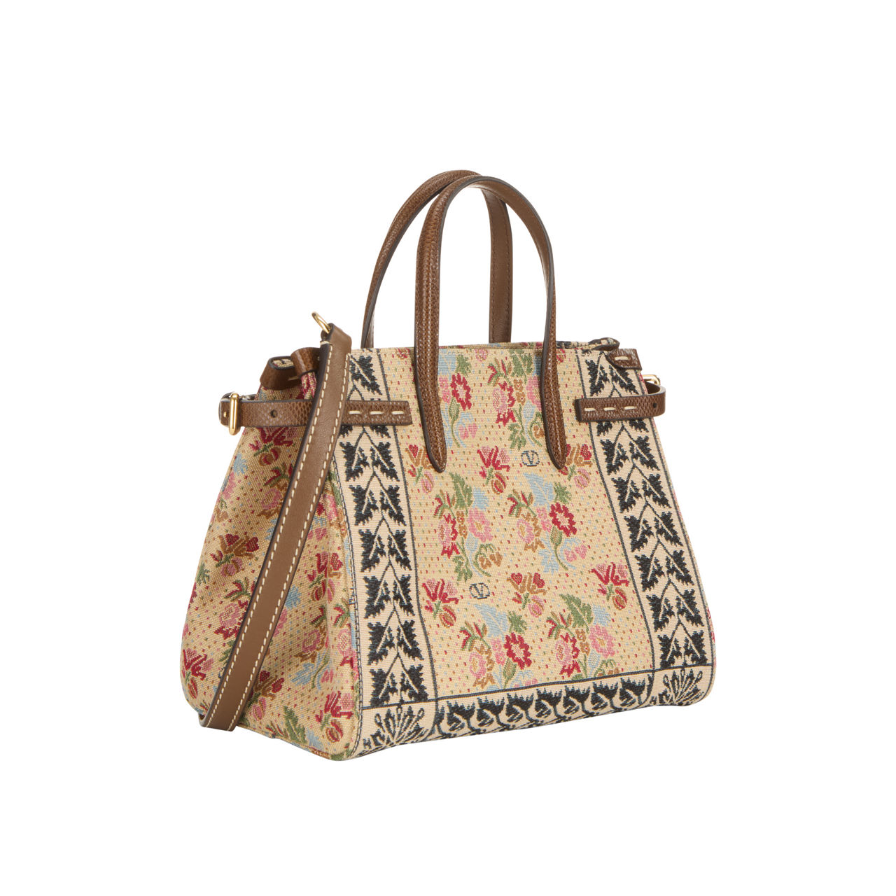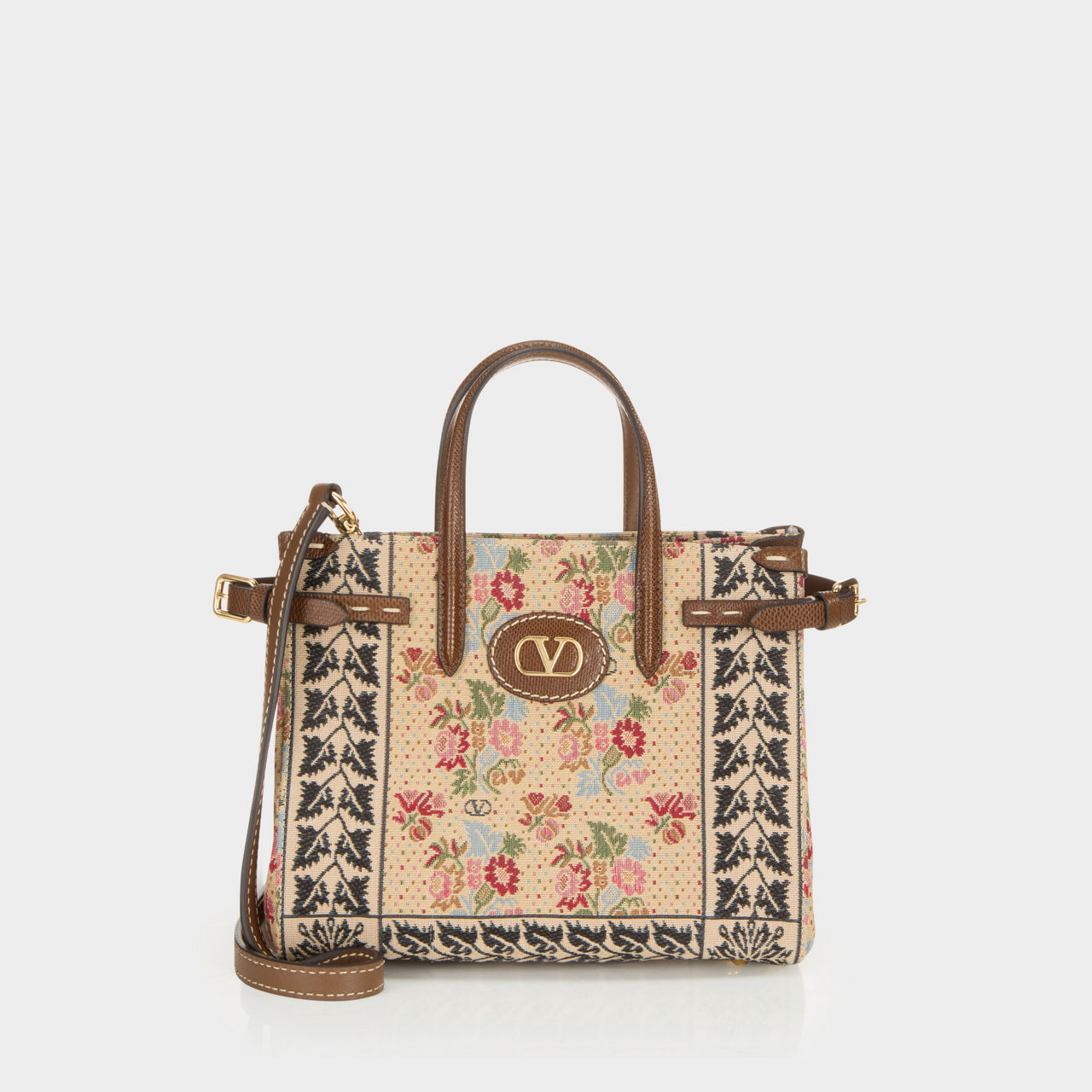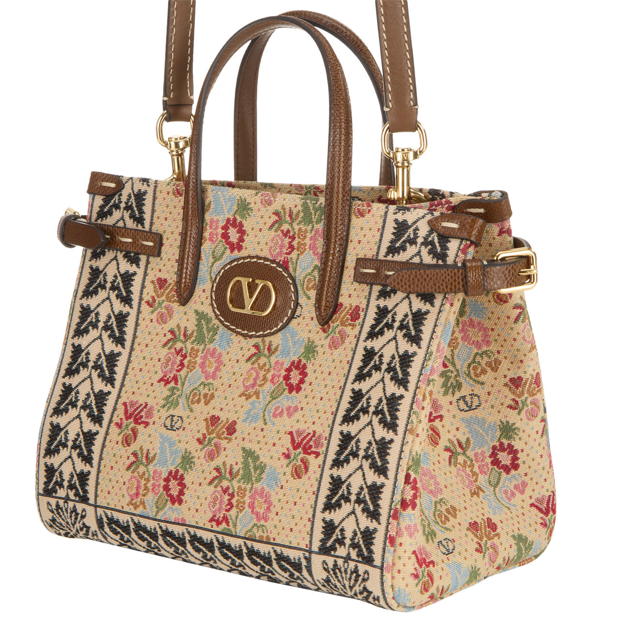 - Top carry handles, detachable crossbody strap, open top with magnetic button closure, gold-tone hardware, adjustable belted sides, V logo detailing, floral jacquard pattern