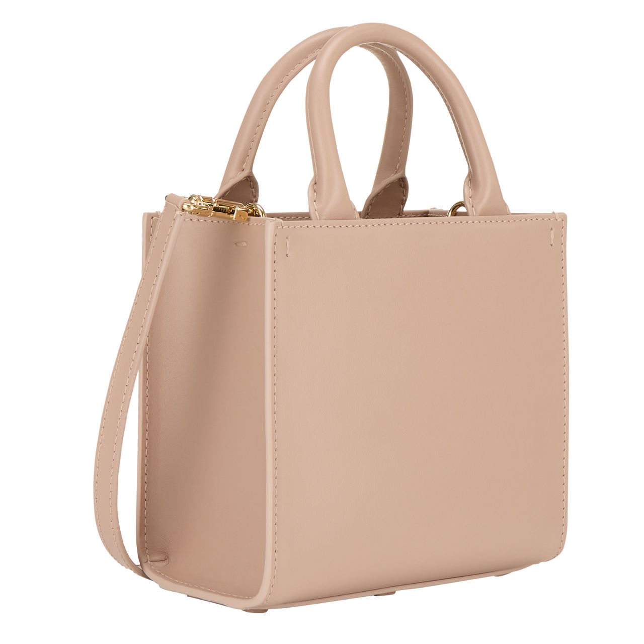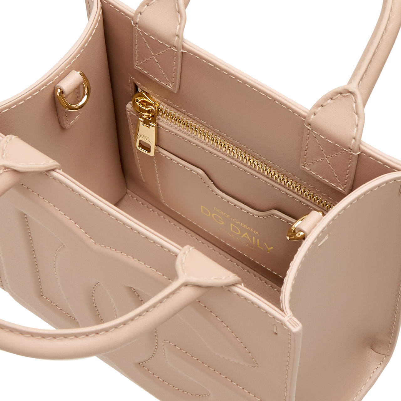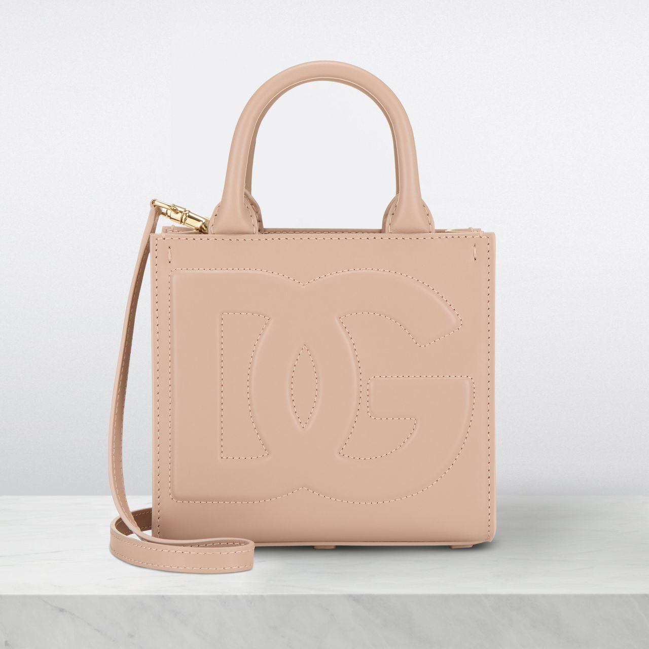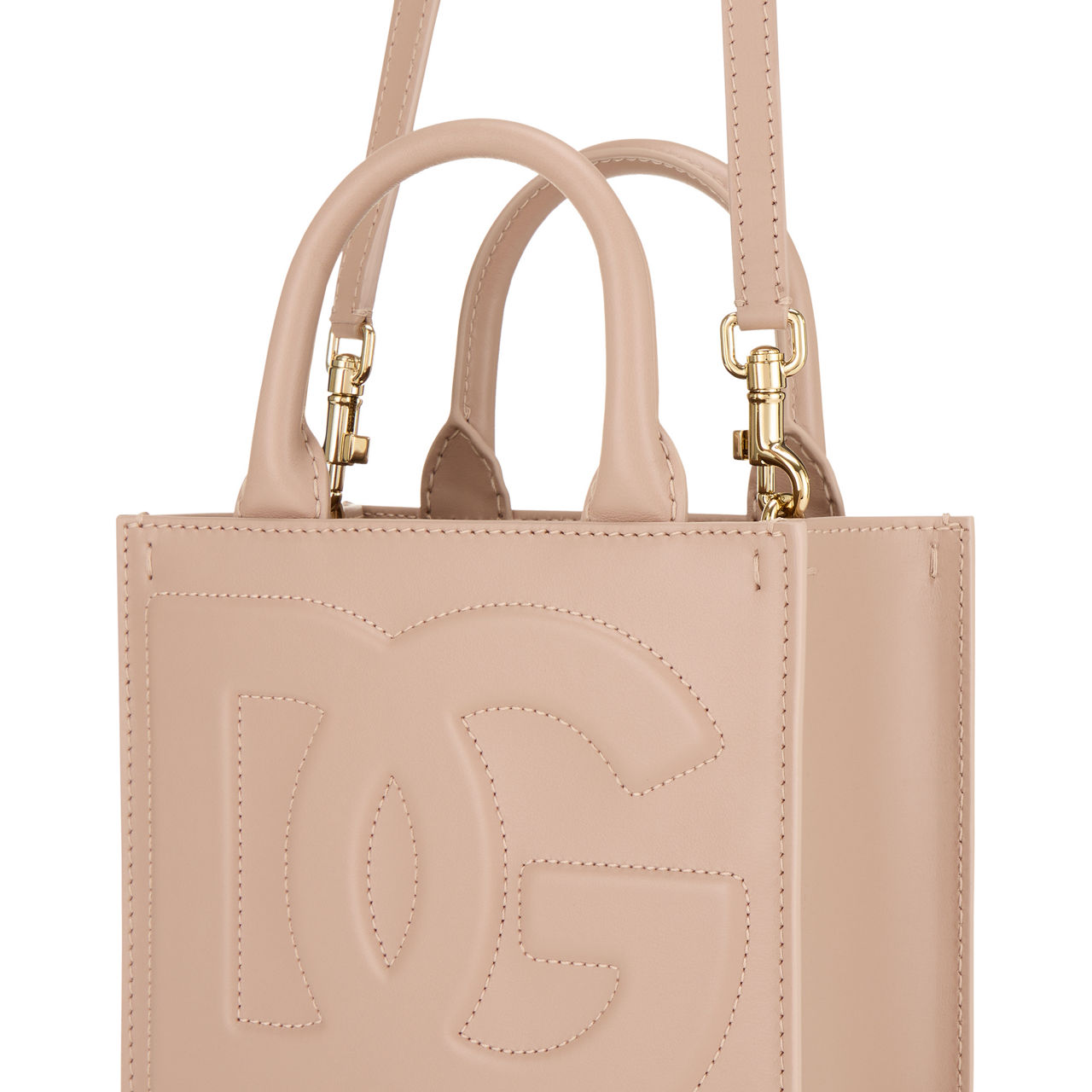 - Two top carry handles, detachable strap, gold-tone hardware, DG logo, tonal stitching, open-style top, smooth leather finish