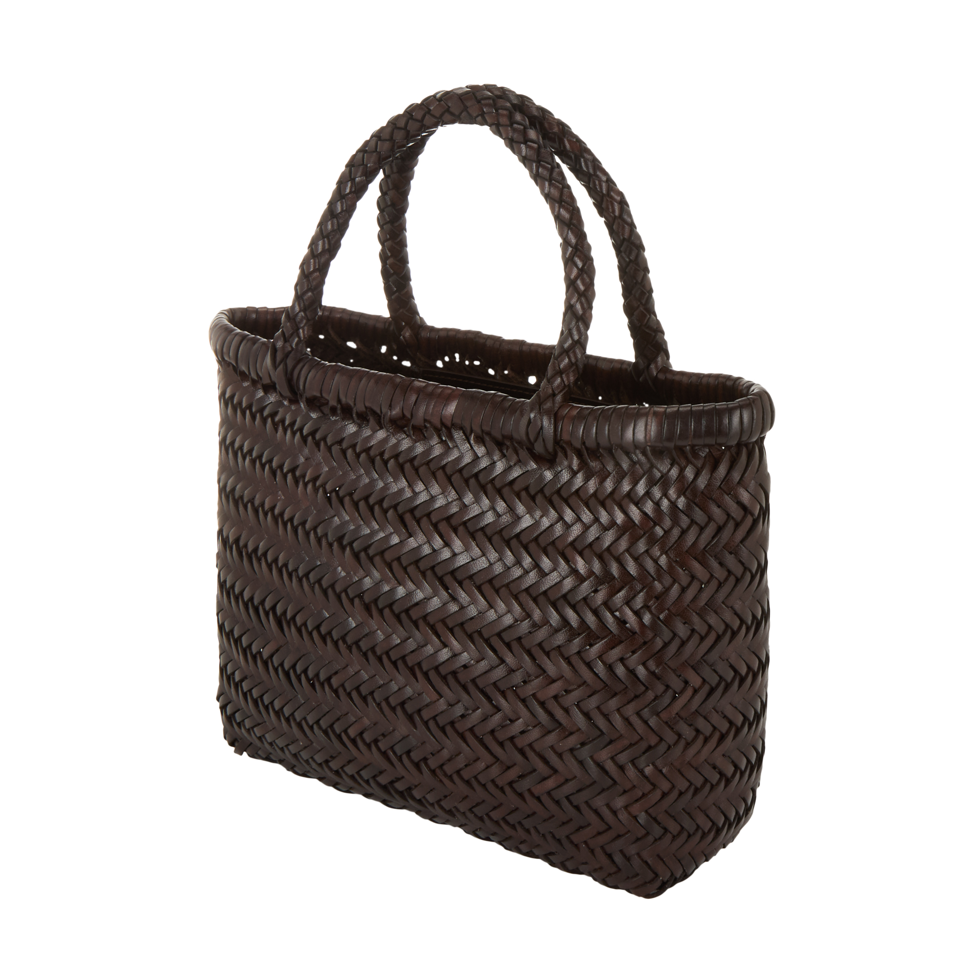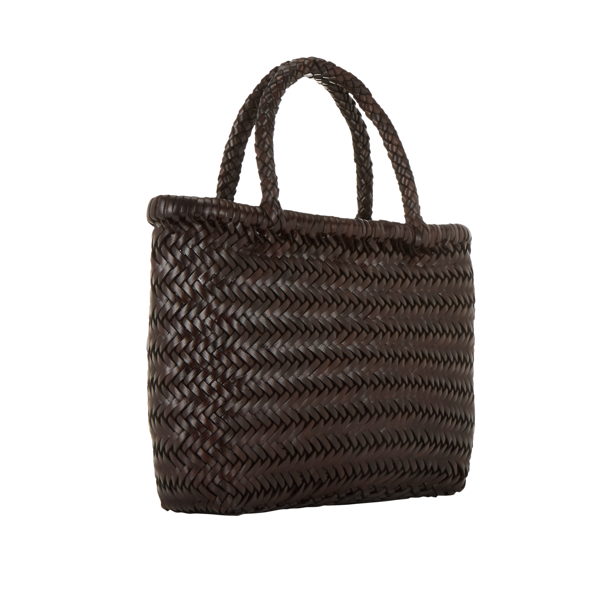- Top carry handles, woven structure, open top, boxy silhouette