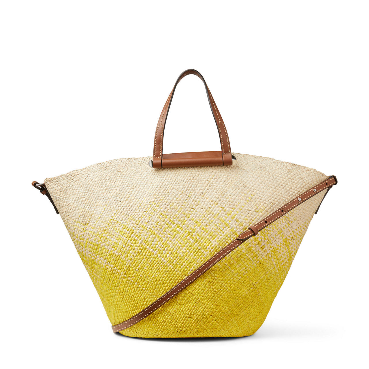 - Raffia fabrication, ombre finish, leather top handle and detachable shoulder strap, branded.