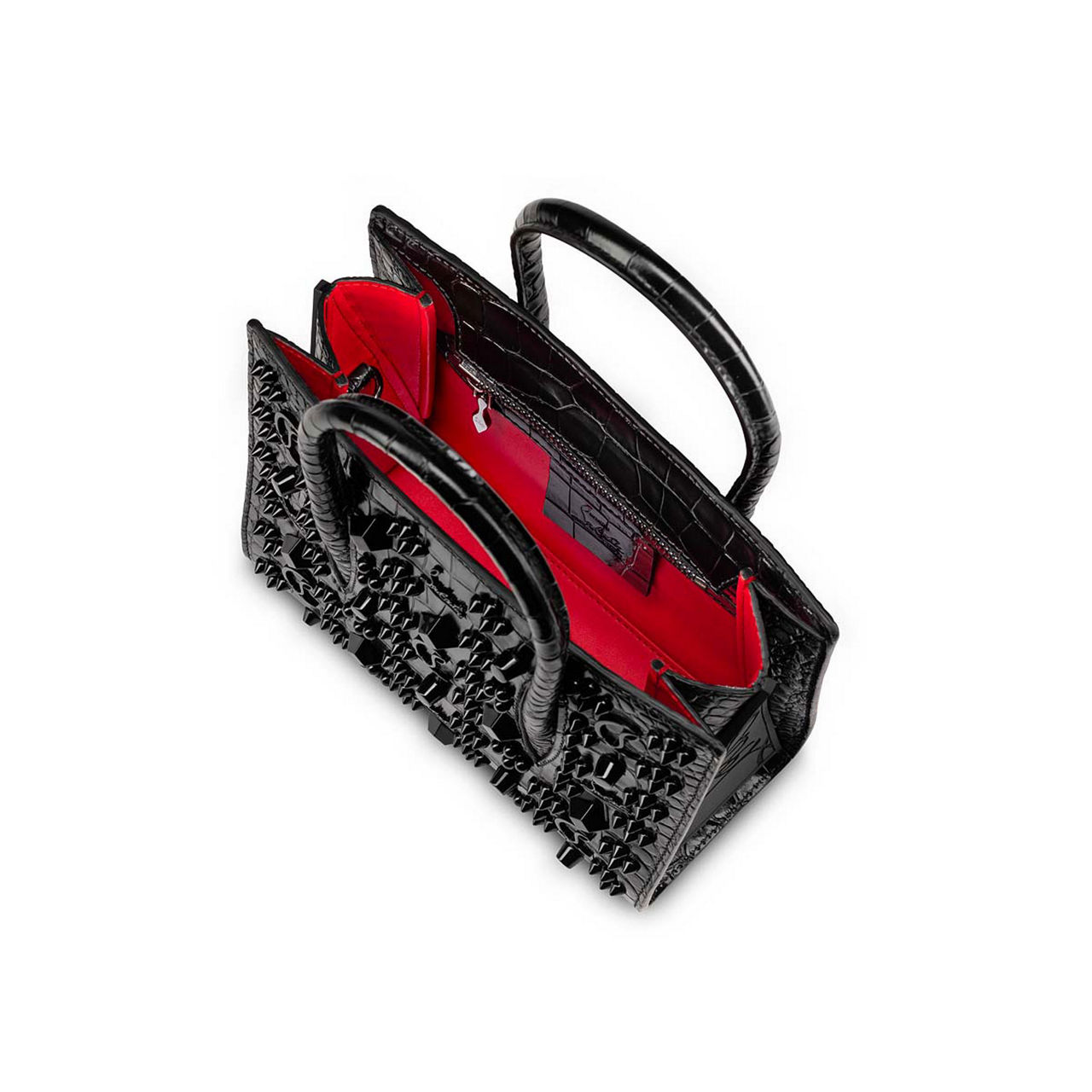 - Top handles, removable shoulder strap, crocodile-textured leather, red lining, studs, signature details, silver-tone details, feet to the base.