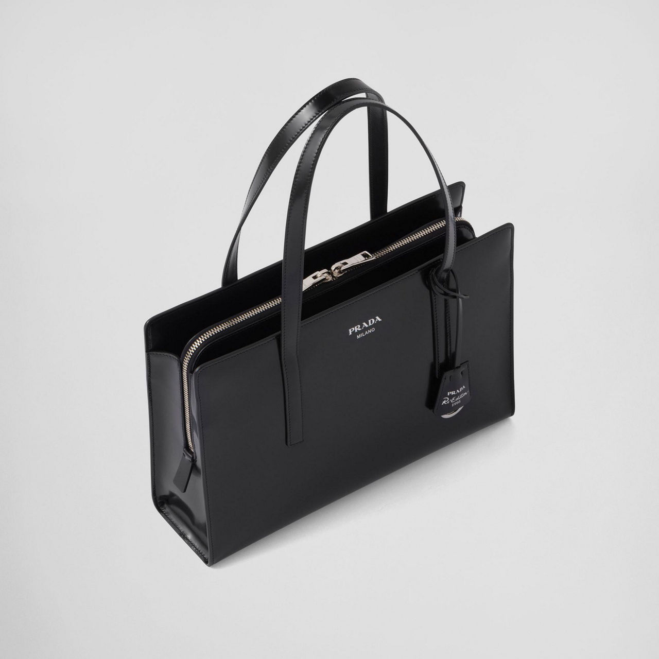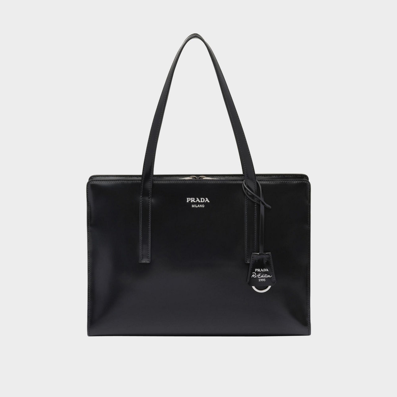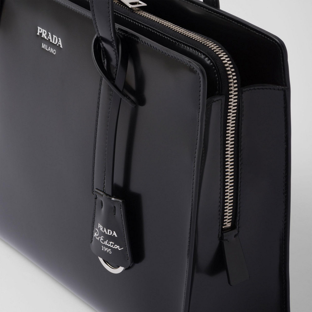 - Leather top handles, metal hardware, screen-printed lettering logo, nylon logo print lining, three compartments including one with zipper, Re-Edition 1995 keychain