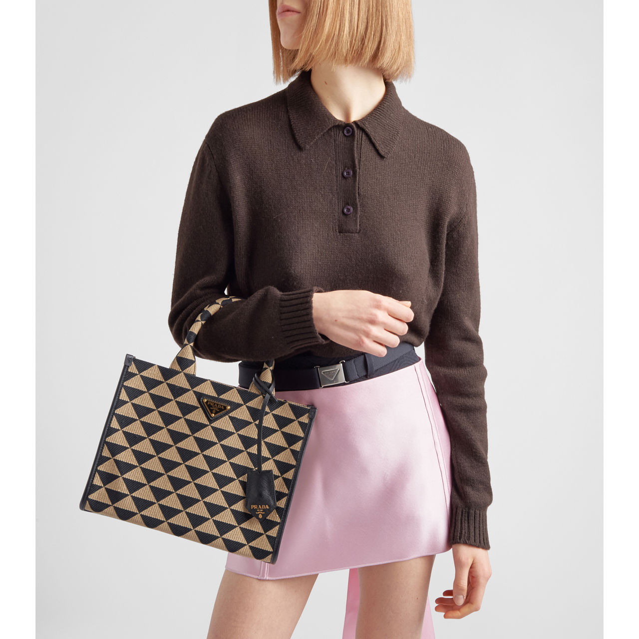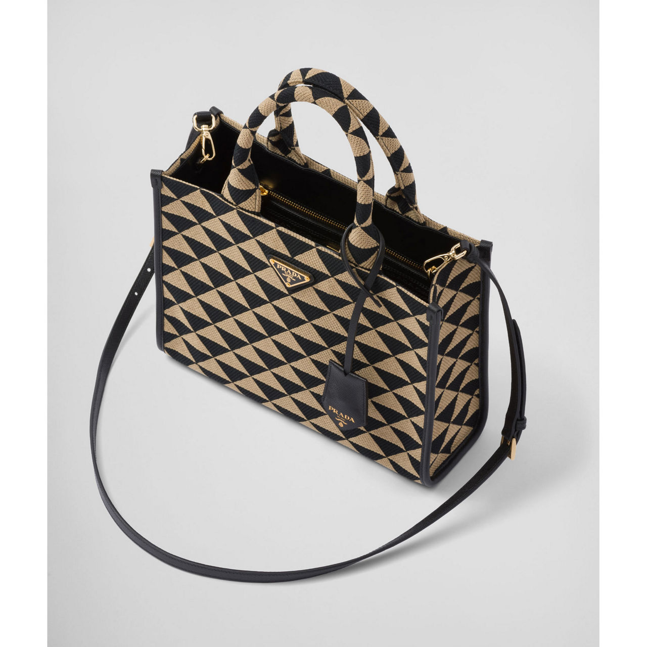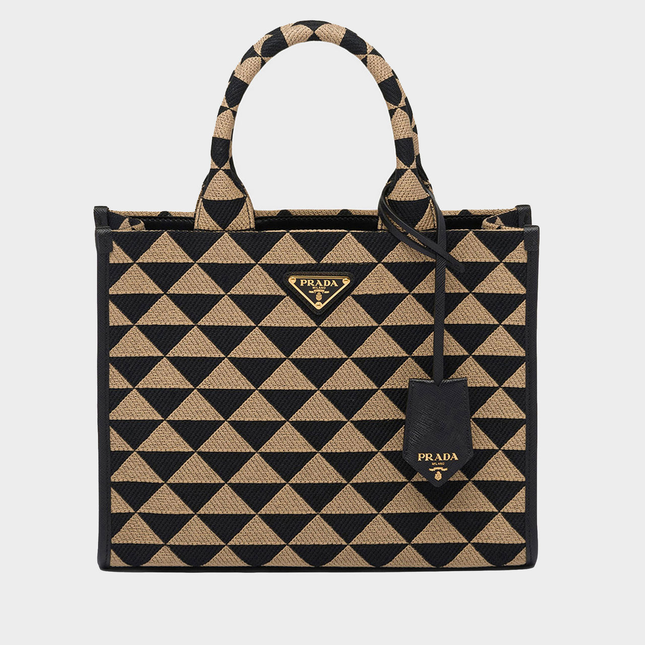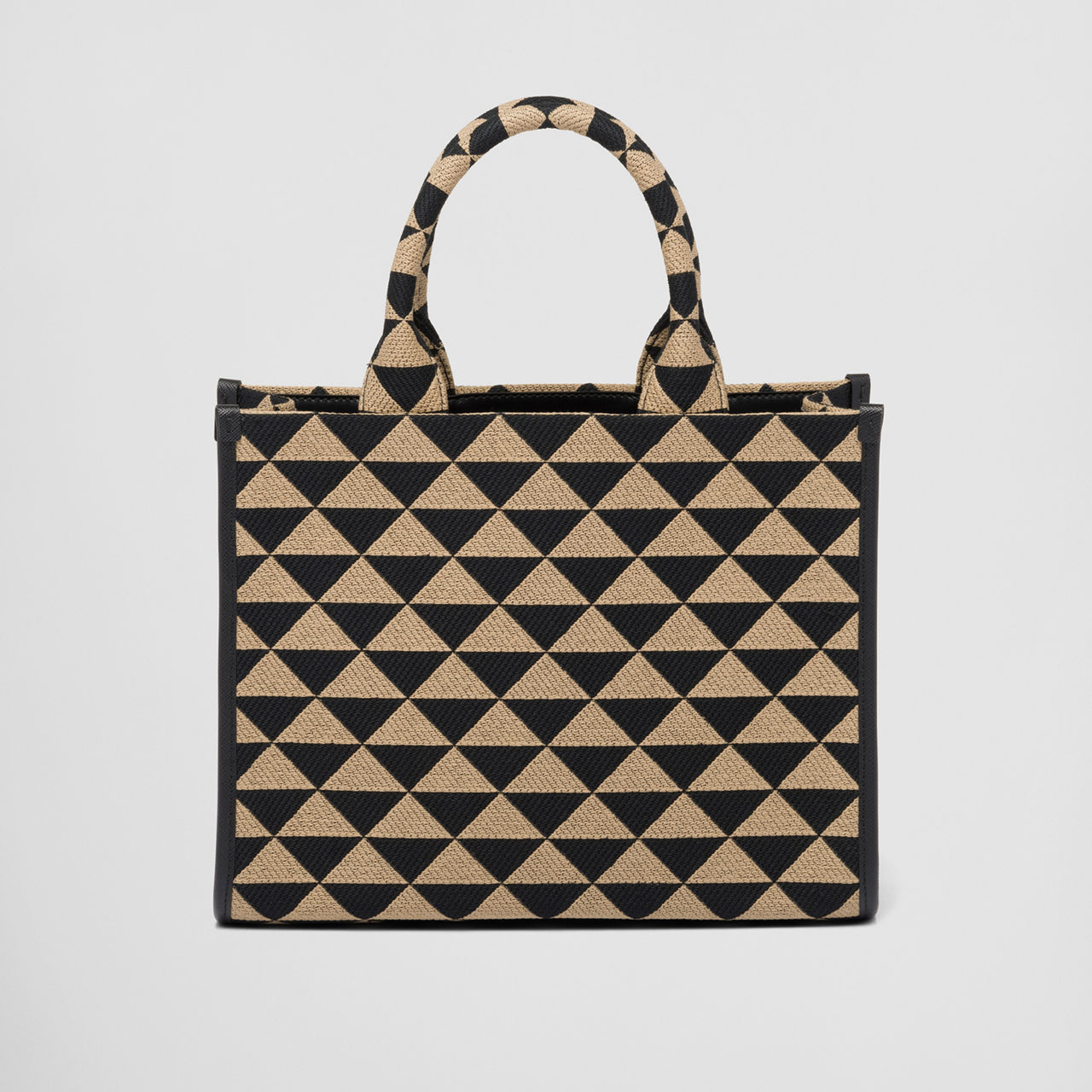The Symbole Jacquard tote bag expresses the iconic Prada triangle with a fresh, modern voice. The small tote bag is crafted from a geometric jacquard fabric that echoes the House motif, trimmed with Saffiano leather details and metallic branding that will elevate your daily accessory edit.