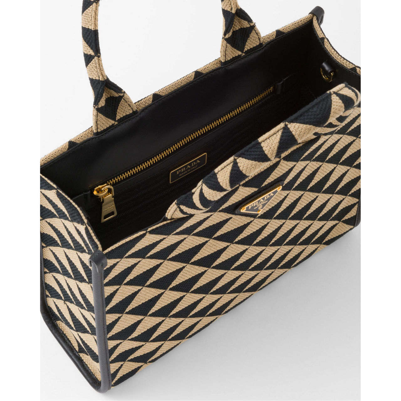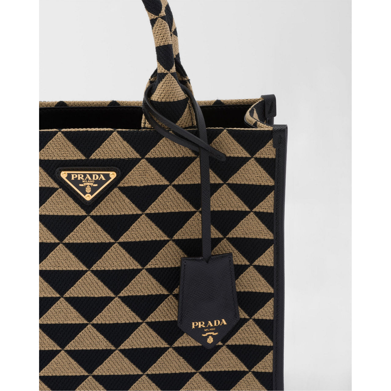 - Saffiano leather details, embroidered fabric handles, removable leather keychain, metal hardware, enamelled metal triangle logo on front