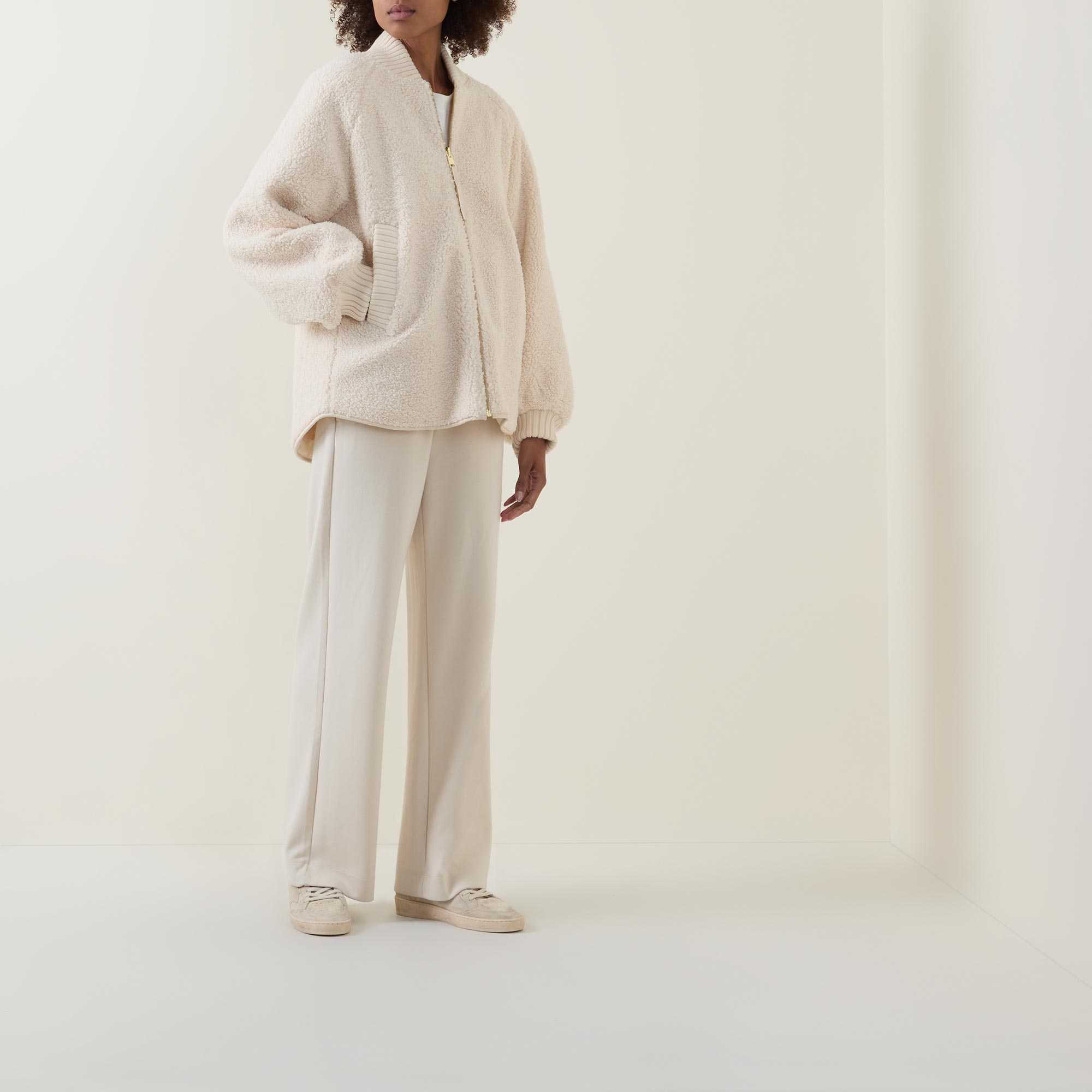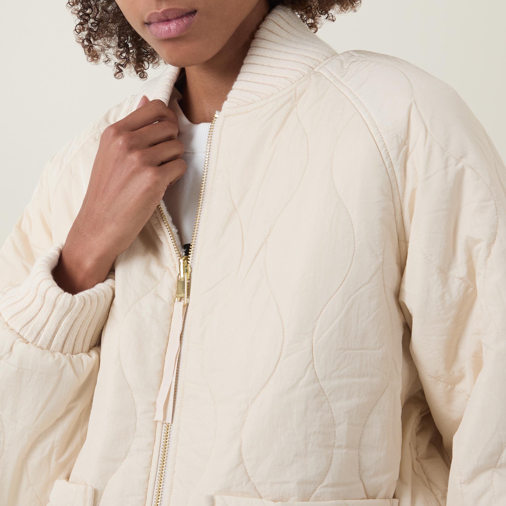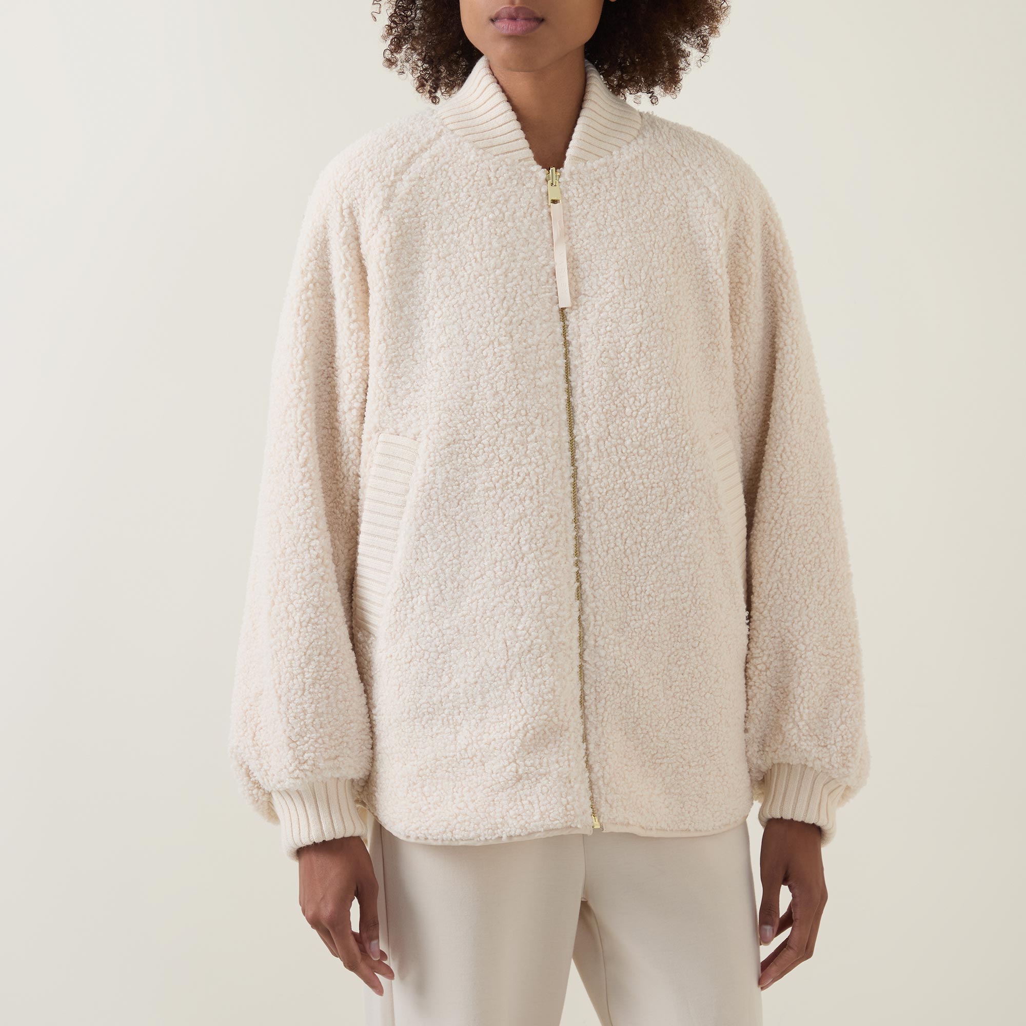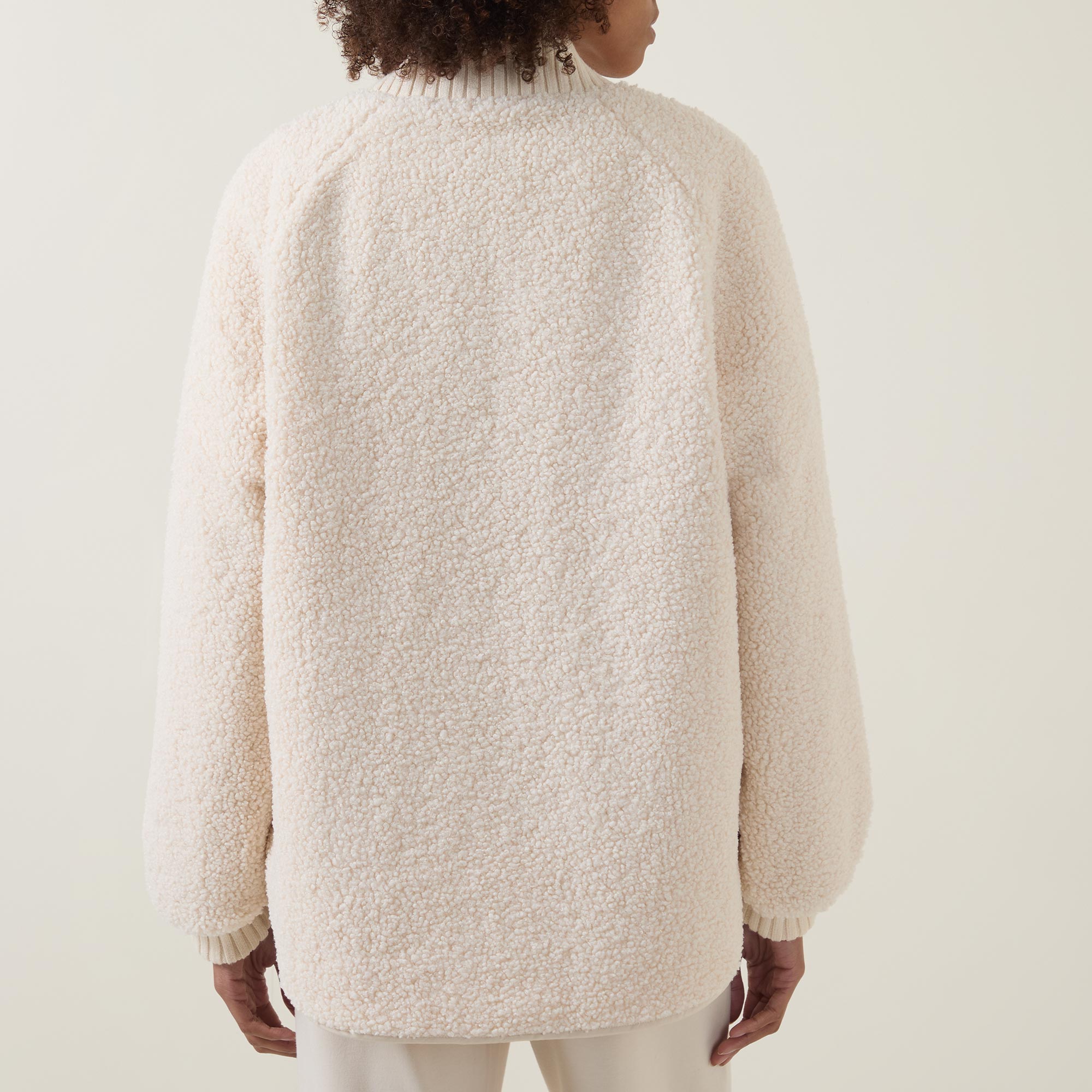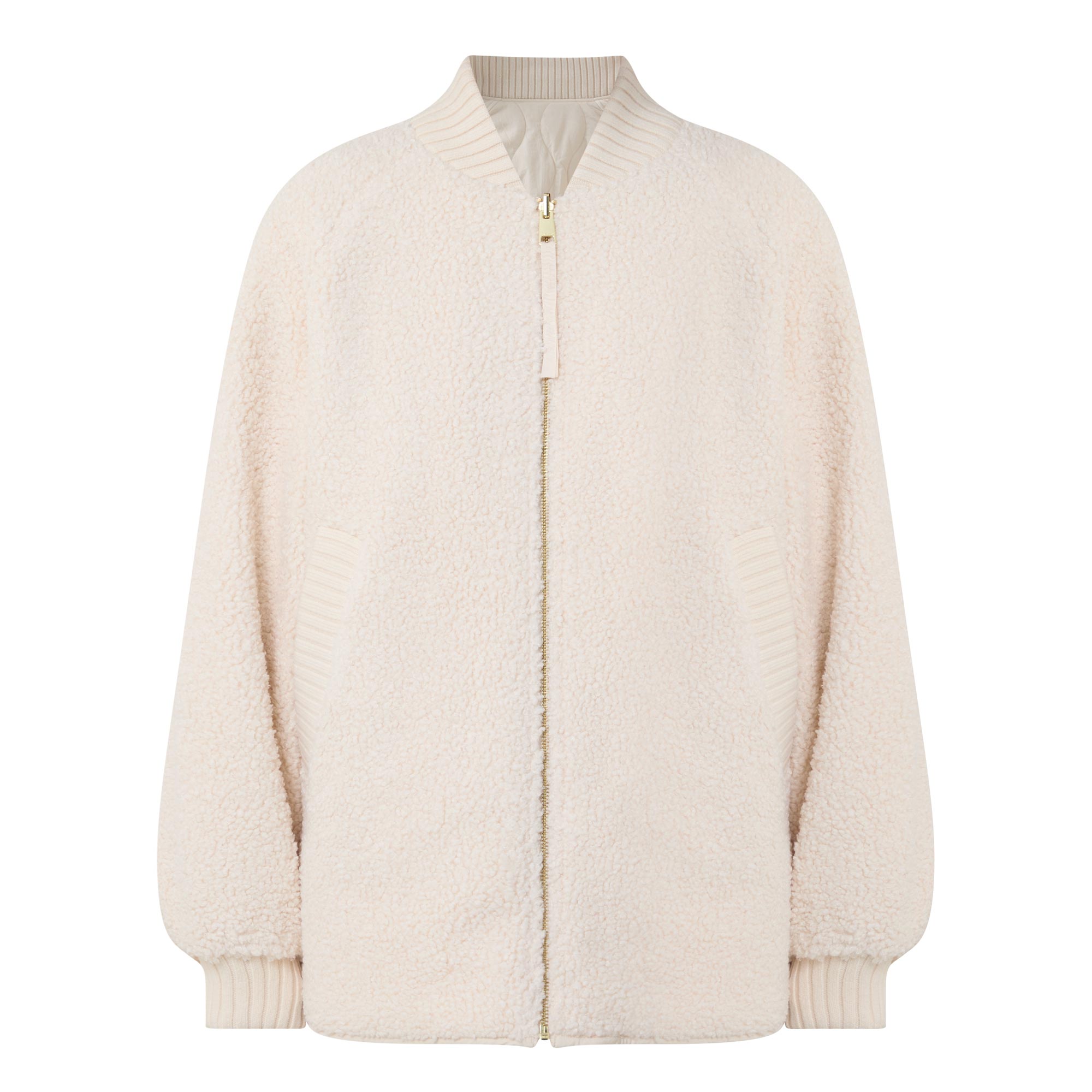 - Rib knit collar and cuffs, zip fastening, patch pockets, one bouclé sherpa fleece side, one onion quilted side, logo details, lightweight feel, Crinkle Shell fabric