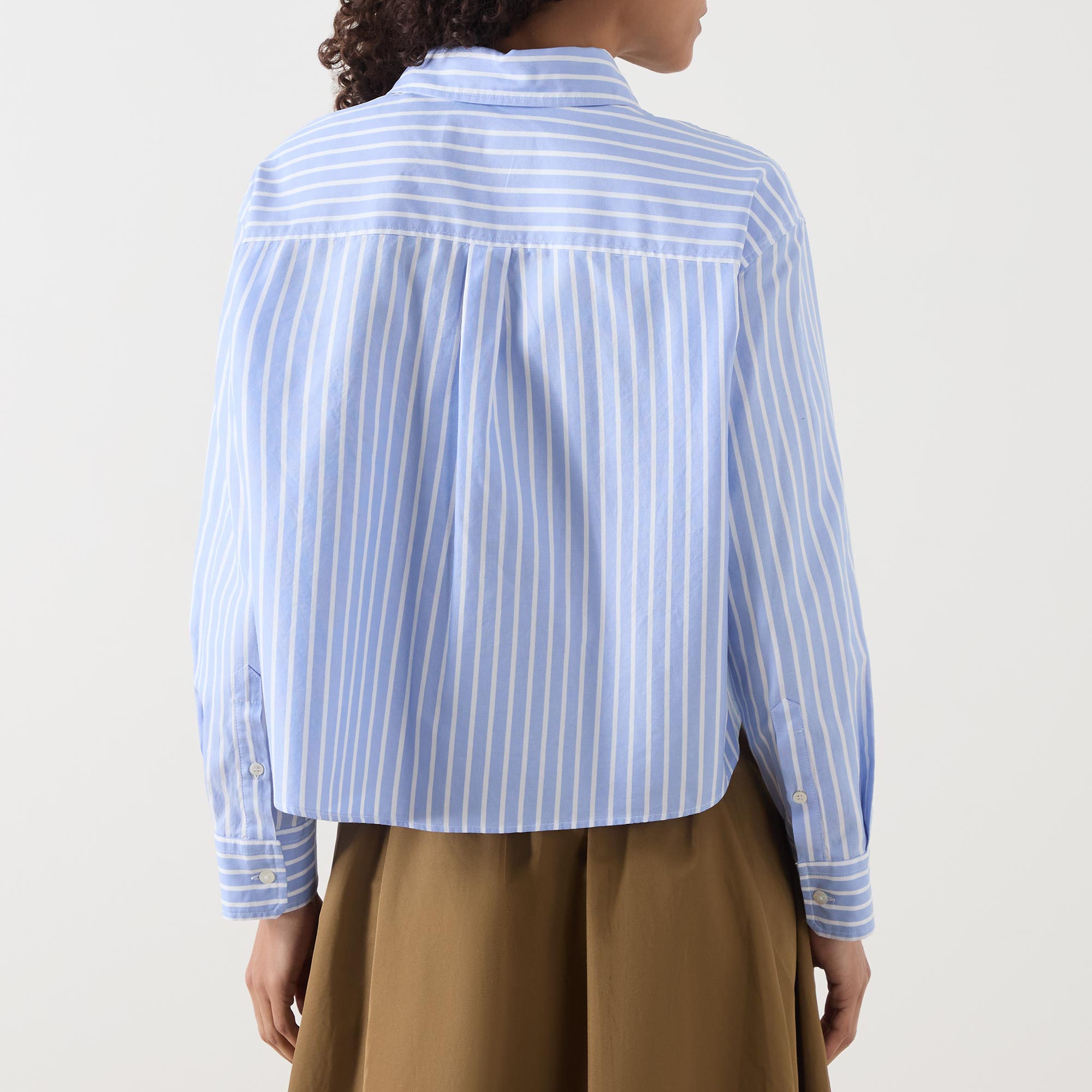 - Short length, long sleeves, pointed collar, striped, button fastenings, chest pocket