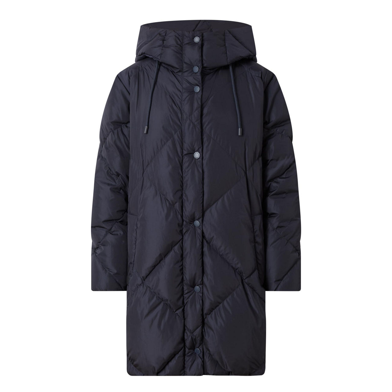 - Water-repellent fabric, goose down-filled, padded, quilted design, adjustable hood with drawstring ties, welt pockets, zip and press stud fastenings.