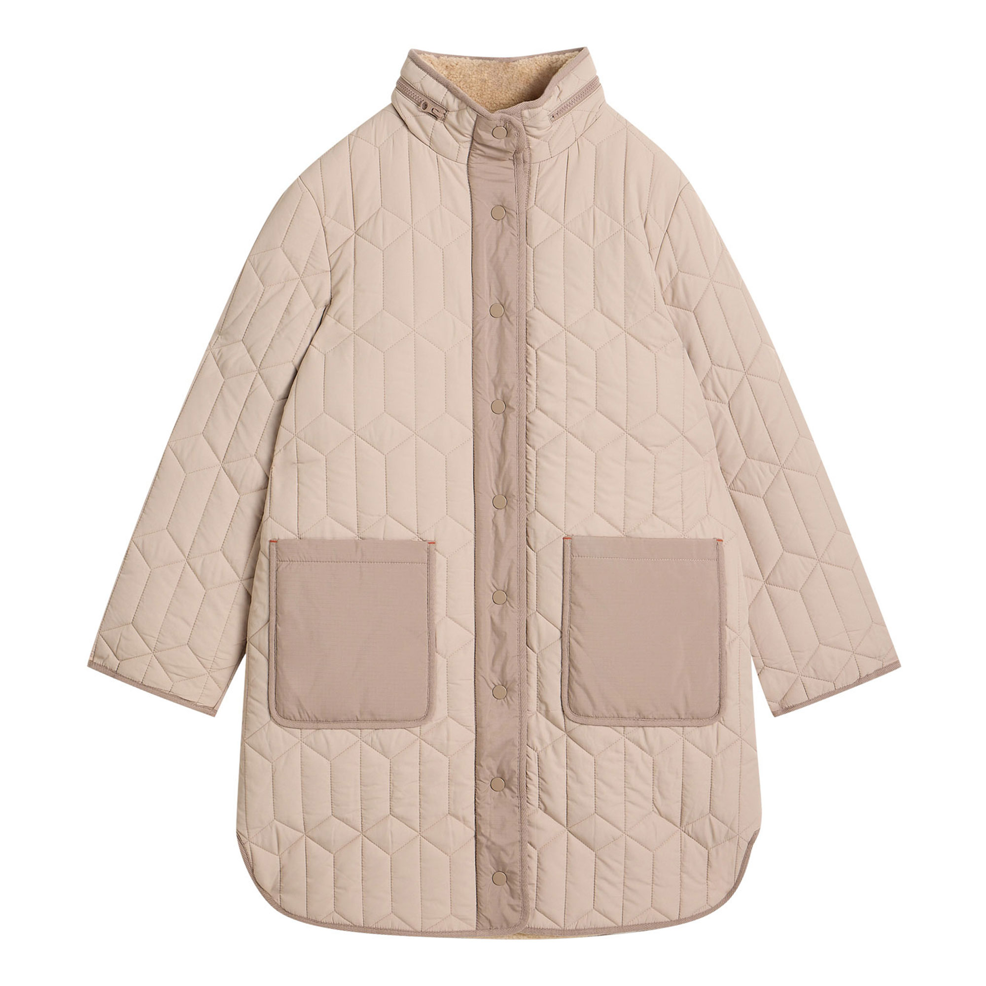 - Soft borg lining, quilted exterior, high neckline, knee-length, puffer style