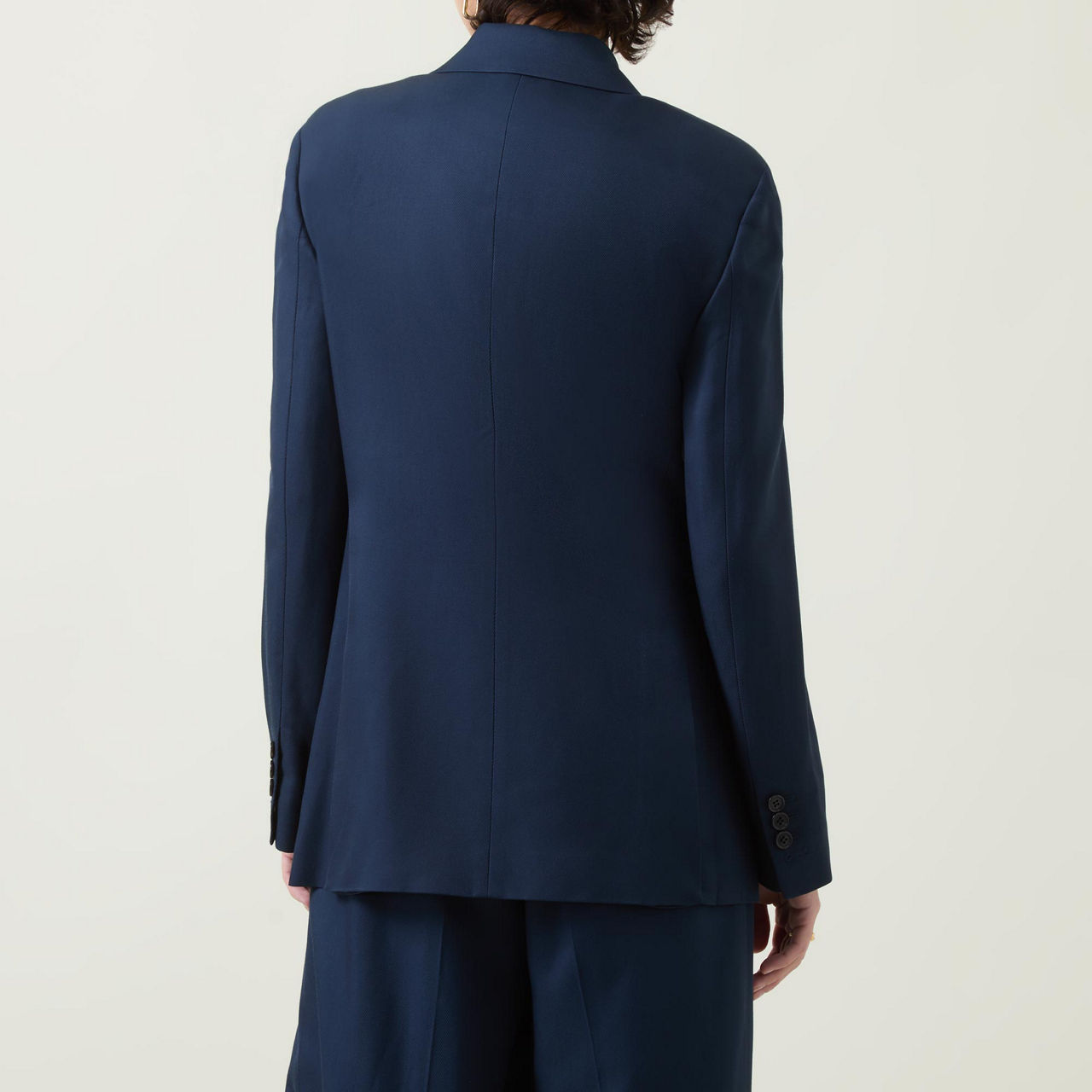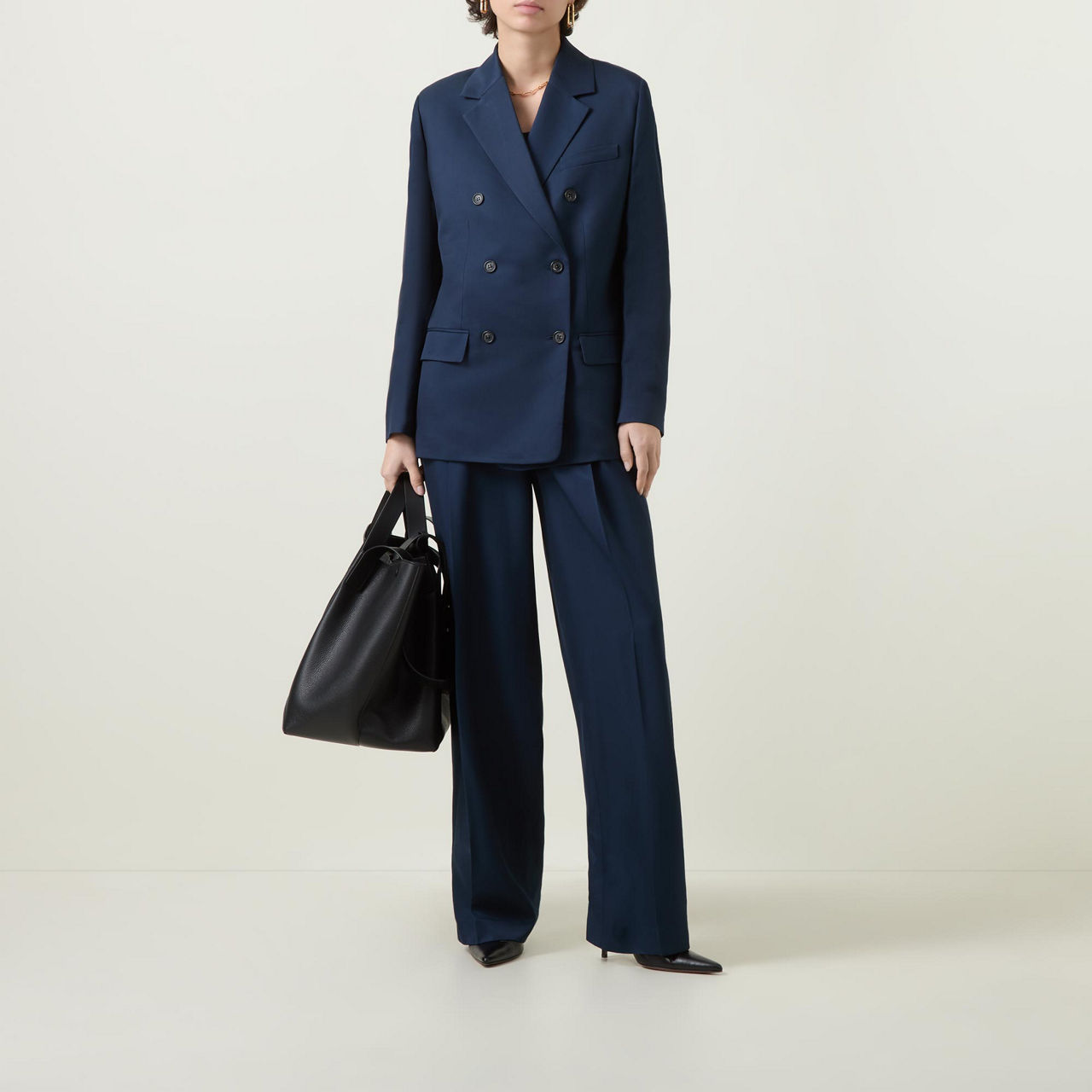 - Notched lapels, long sleeves, double-breasted, button fastenings, flap pockets