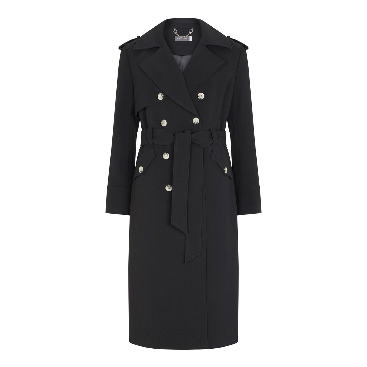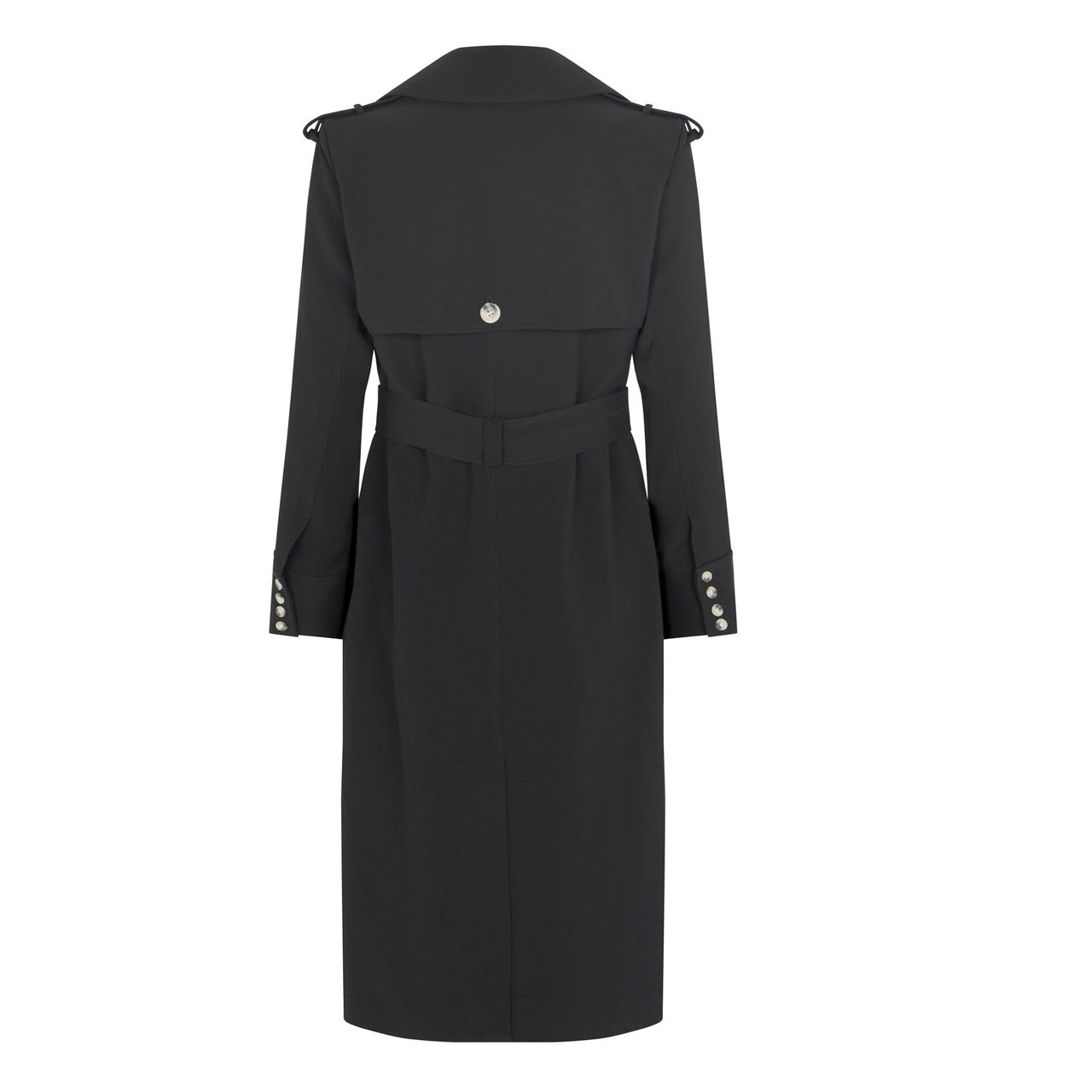- Longline double-breasted silhouette, peaked lapel, storm shield, epaulettes, contrast buttons, long sleeves with buttoned cuffs, flap pockets, tie belt and loops, back vent, fully lined, buttons through the front, midi length