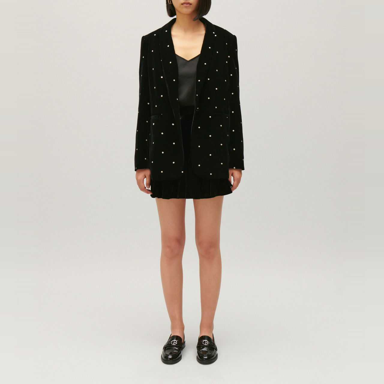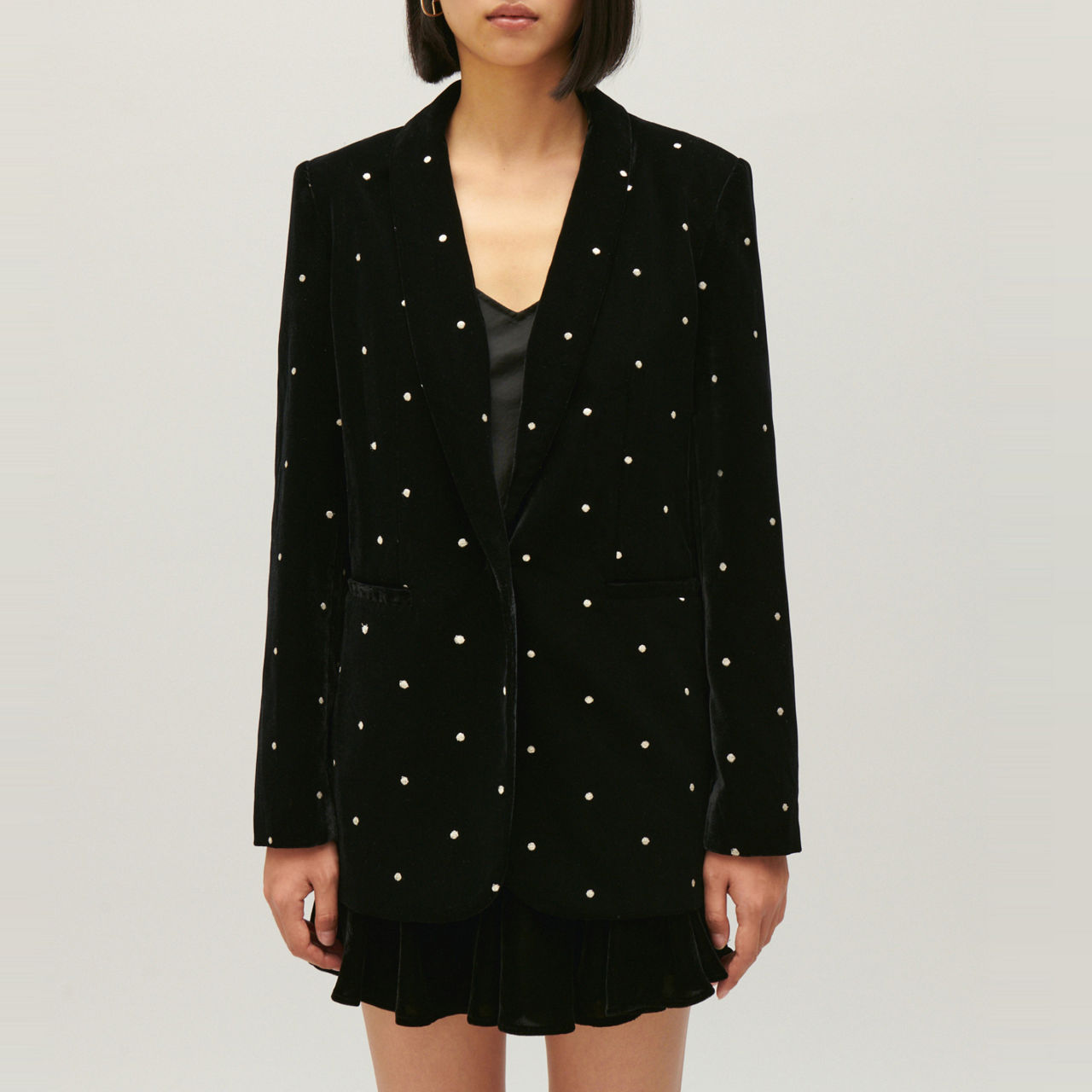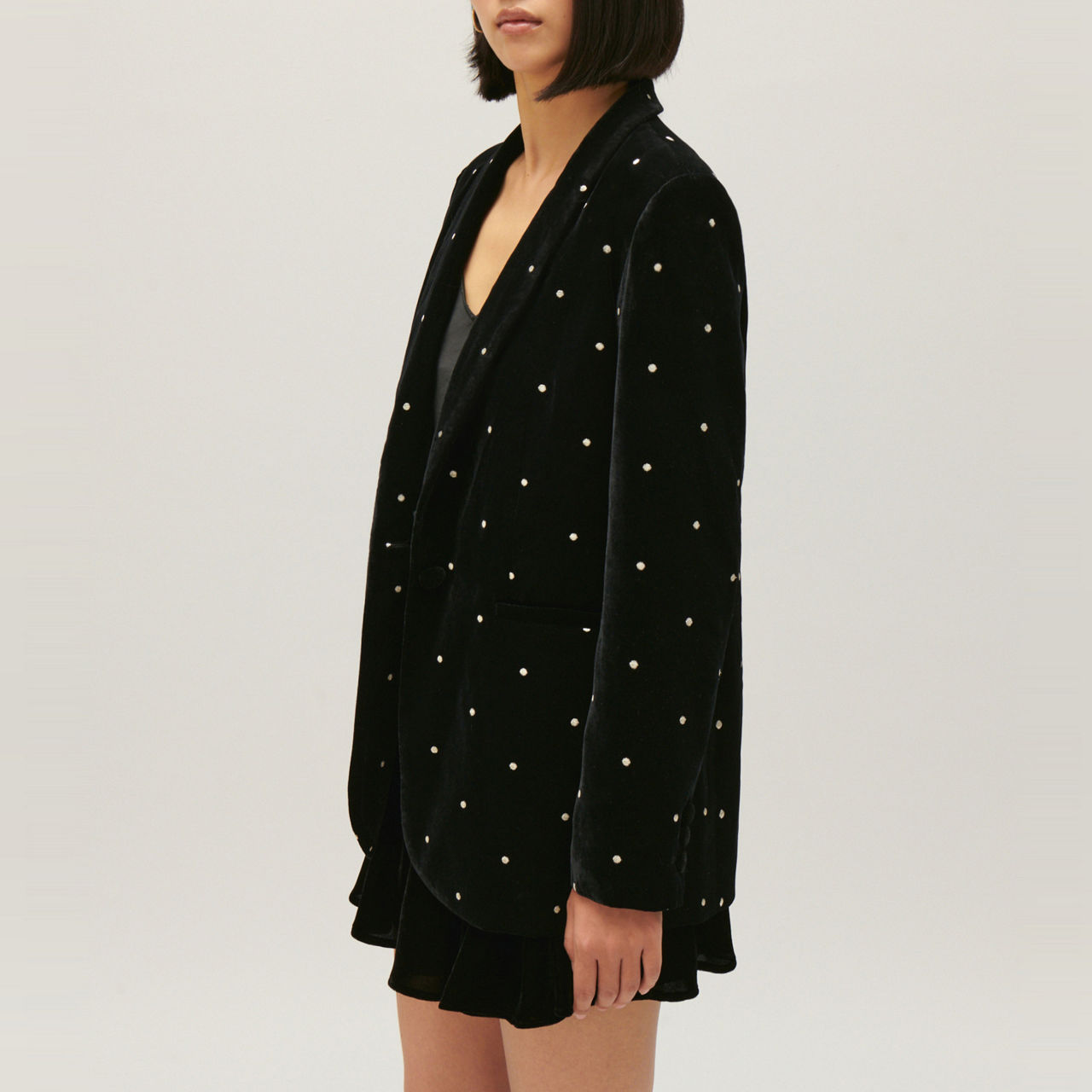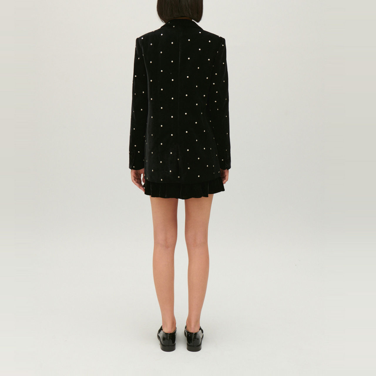 - Single-breasted front, long sleeves, lapels, concealed button fastening, embellishments, velour finish