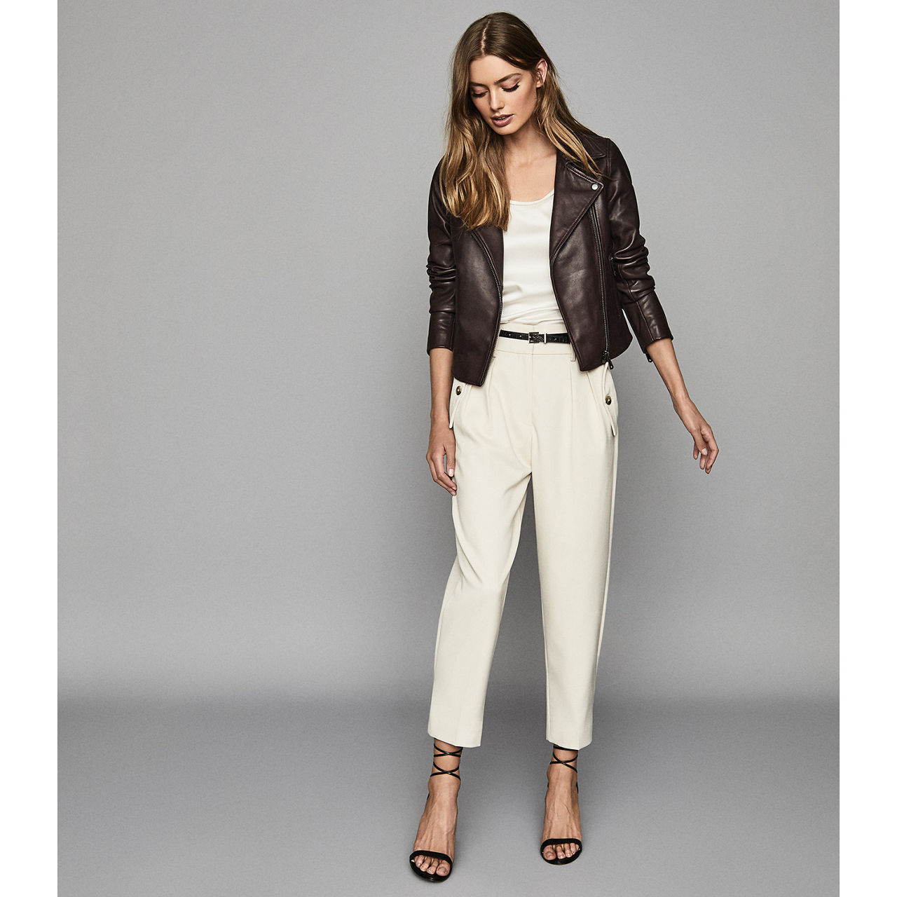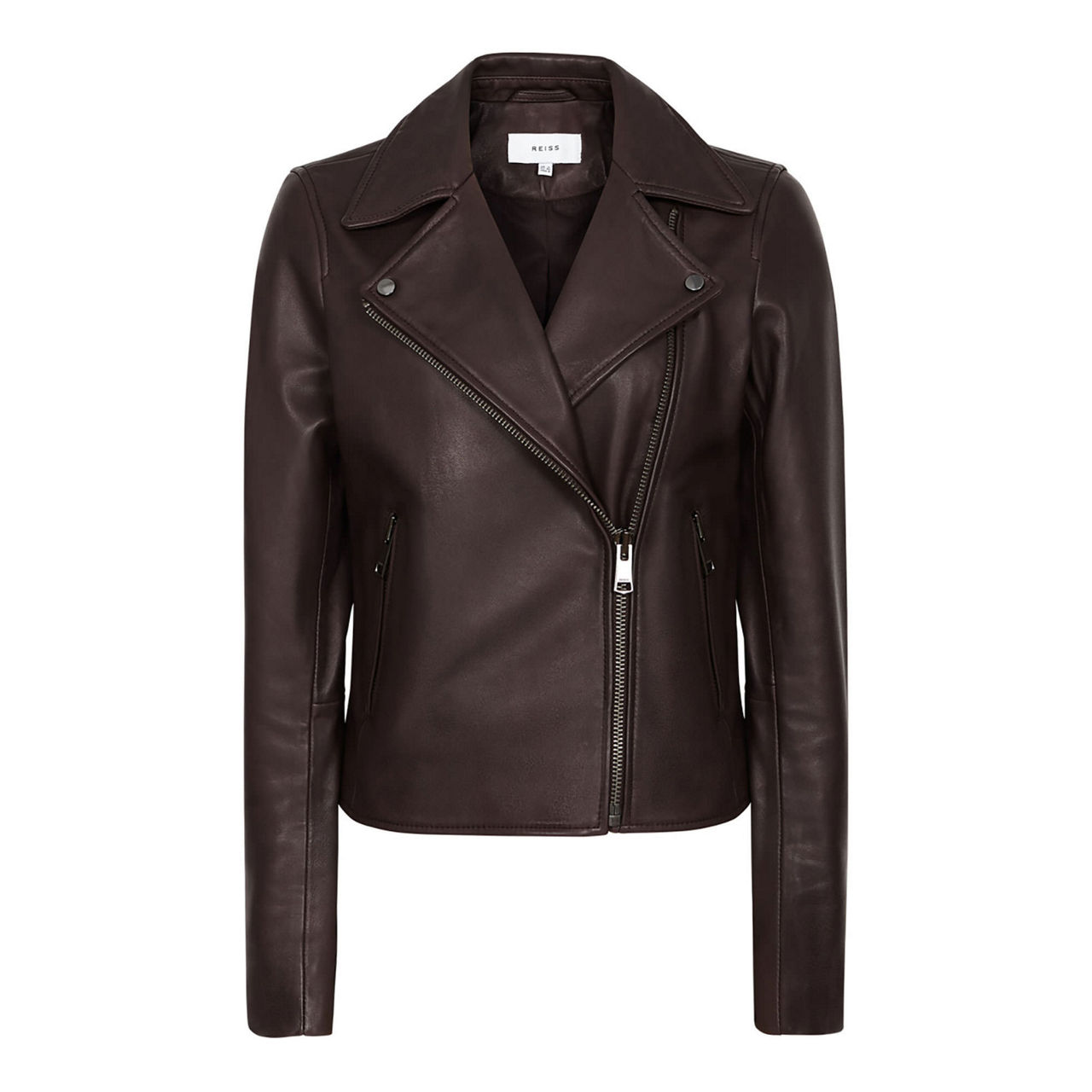 A staple of every wardrobe, the biker jacket is reimagined with a feminine fit in mind with Reiss's Geo design. A side zip and collar detail embrace a classic structure, while a form-fitting waist and sleeve ensure refinement.