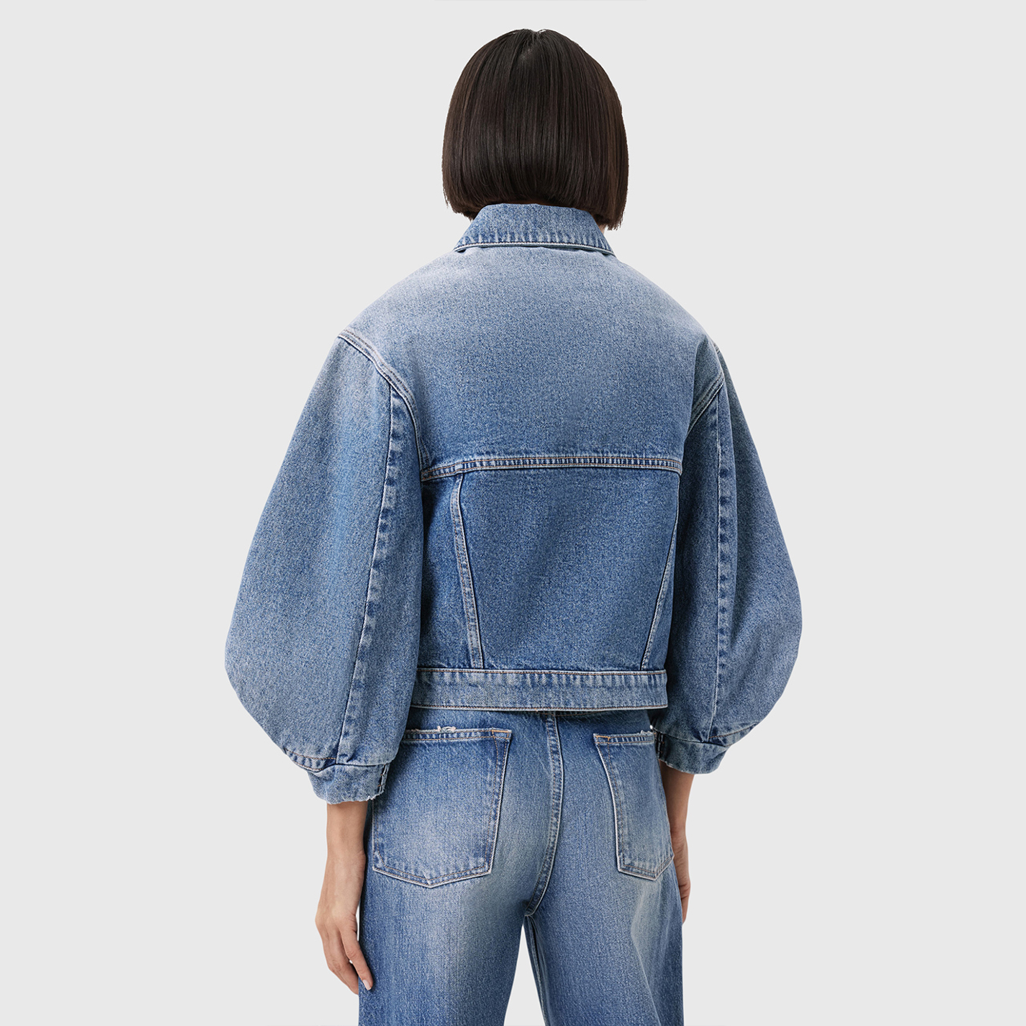 - Boxy style, dropped yoke, trucker style pockets, deep pleated voluminous sleeves, elasticated cuffs