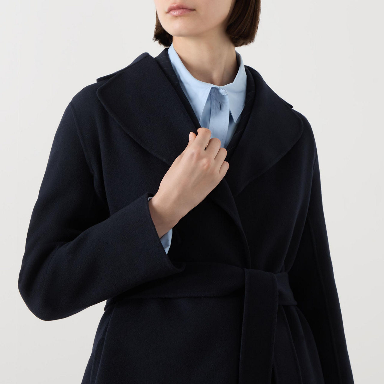 - Long sleeves, wide lapels, slit pockets, self-fabric belt, wrap design, slit to the back, smooth fabric