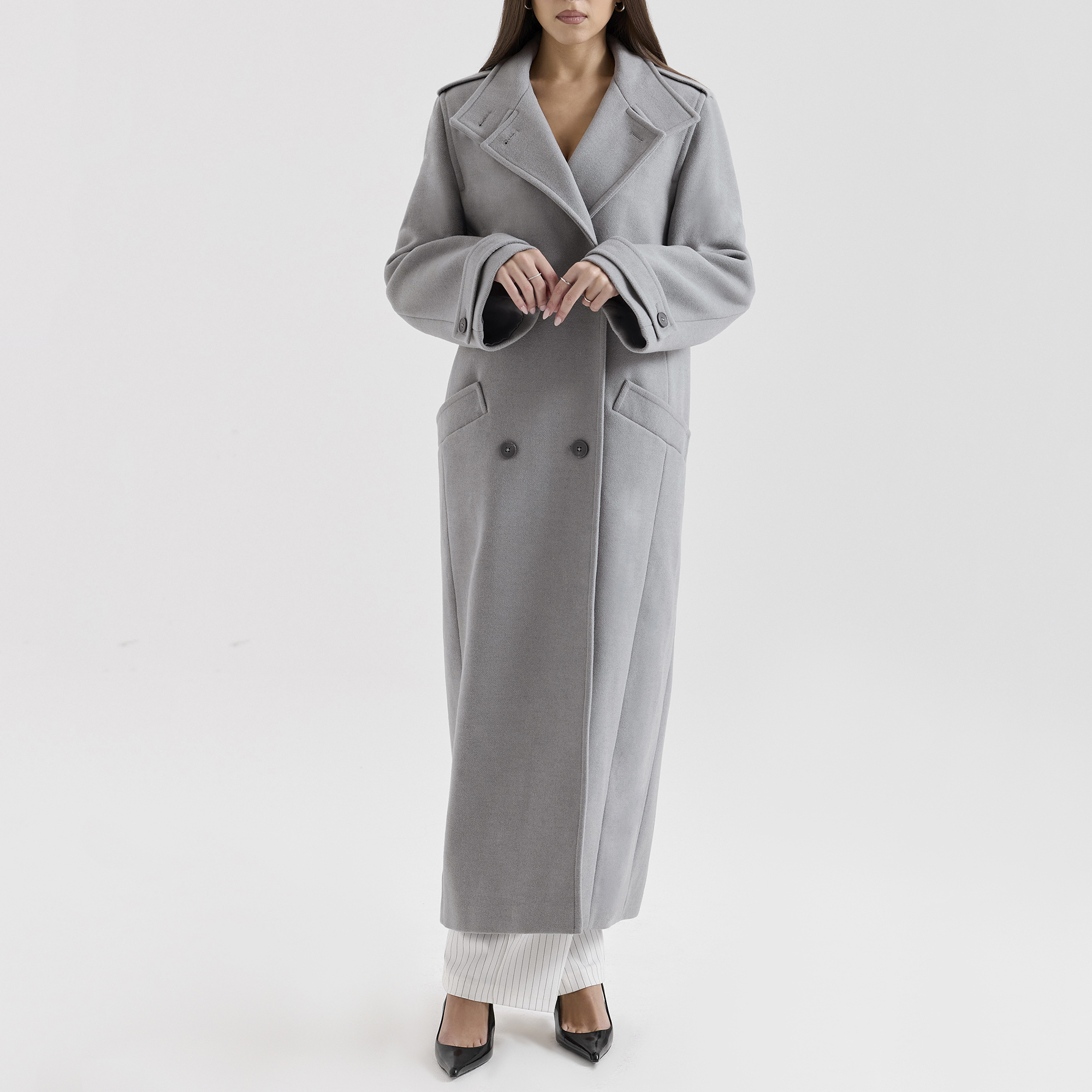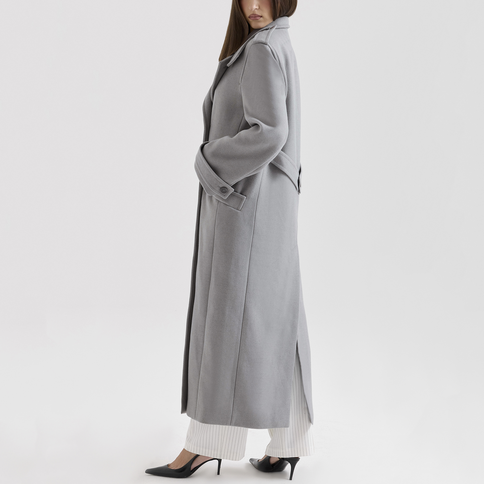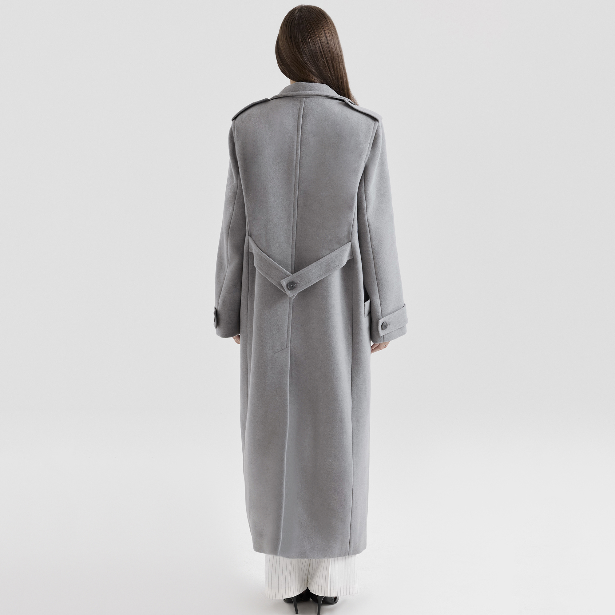 - Tailored cut, funnel neckline, double-breasted, button fastening, shoulder epaulettes, long sleeves with buttoned tabs, belt strap at the back, rear vent, side pockets, lined