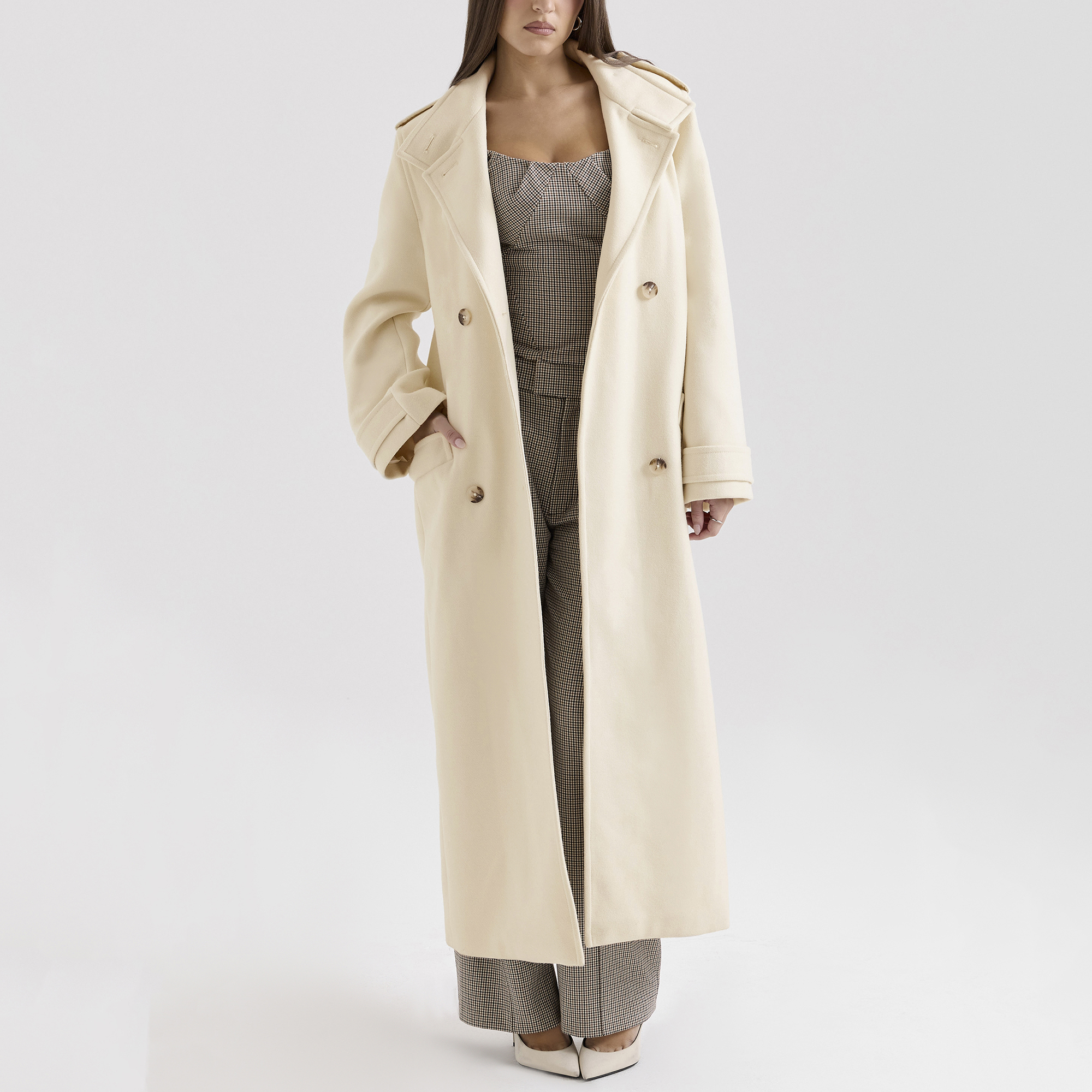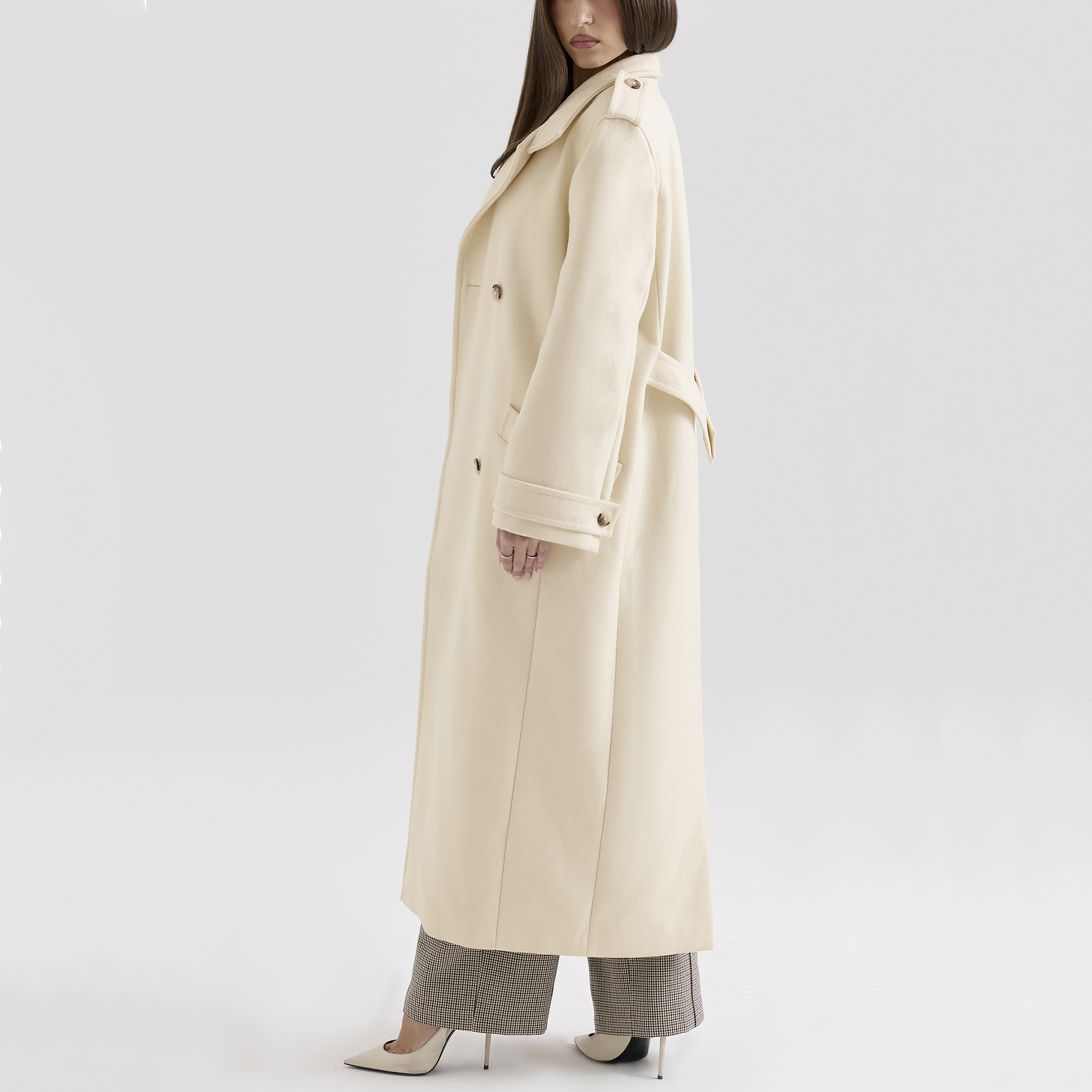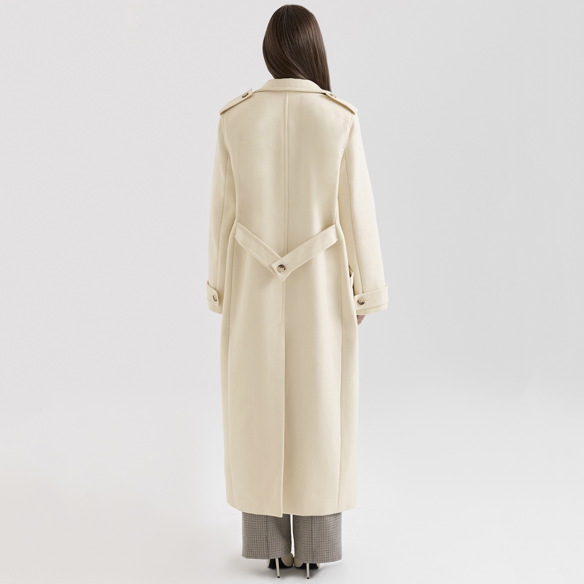 - Tailored cut, funnel neckline, double-breasted, button fastening, shoulder epaulettes, long sleeves with buttoned tabs, belt strap at the back, rear vent, side pockets, lined