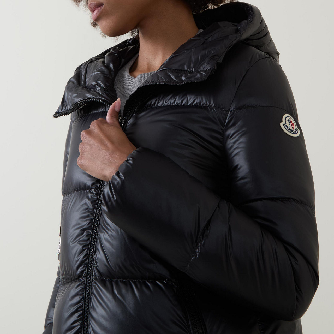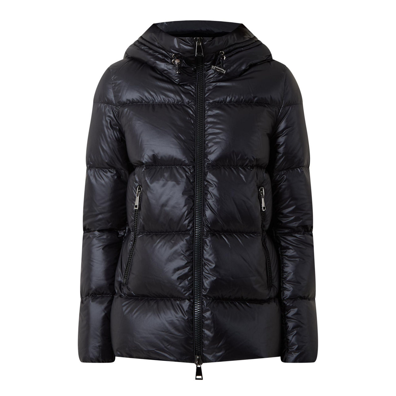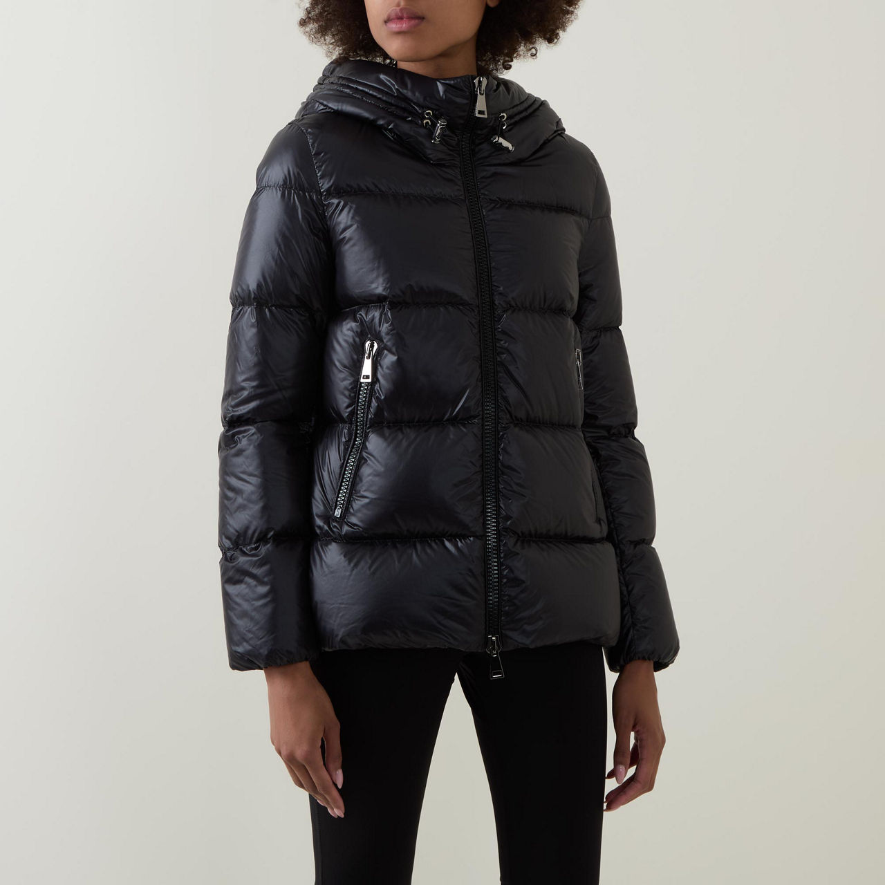 - Hood with adjustable drawstring fastening, long sleeves, elasticated cuffs, two-way front zip fastening, two side slit pockets with zip fastenings, straight hem, felt logo patch, padded, crafted from nylon léger brilliant
