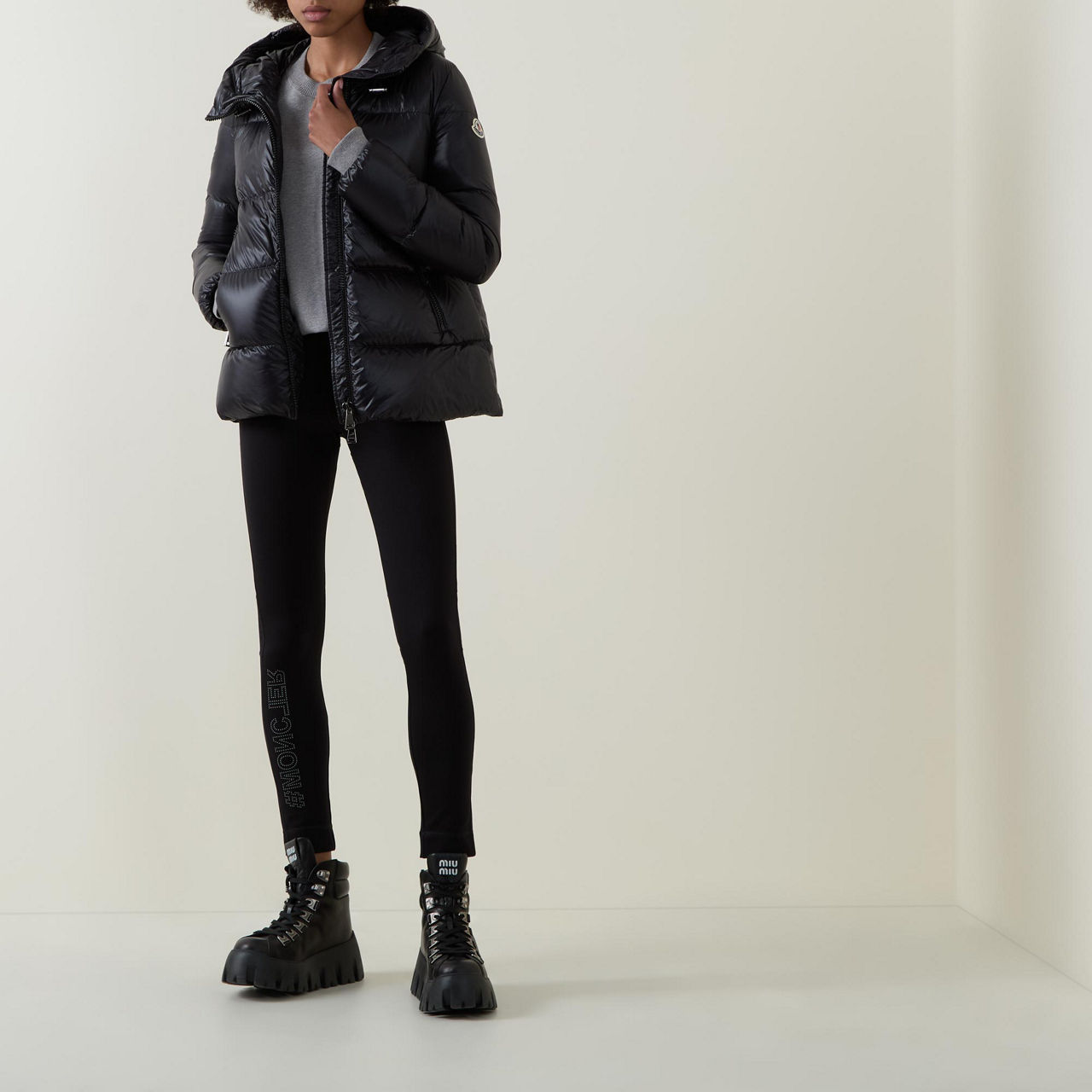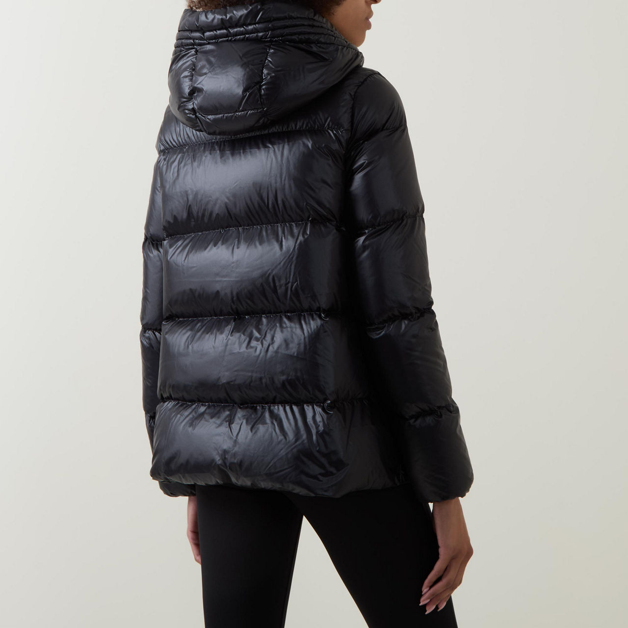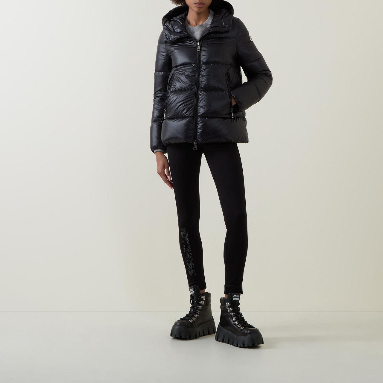 - Hood with adjustable drawstring fastening, long sleeves, elasticated cuffs, two-way front zip fastening, two side slit pockets with zip fastenings, straight hem, felt logo patch, padded, crafted from nylon léger brilliant