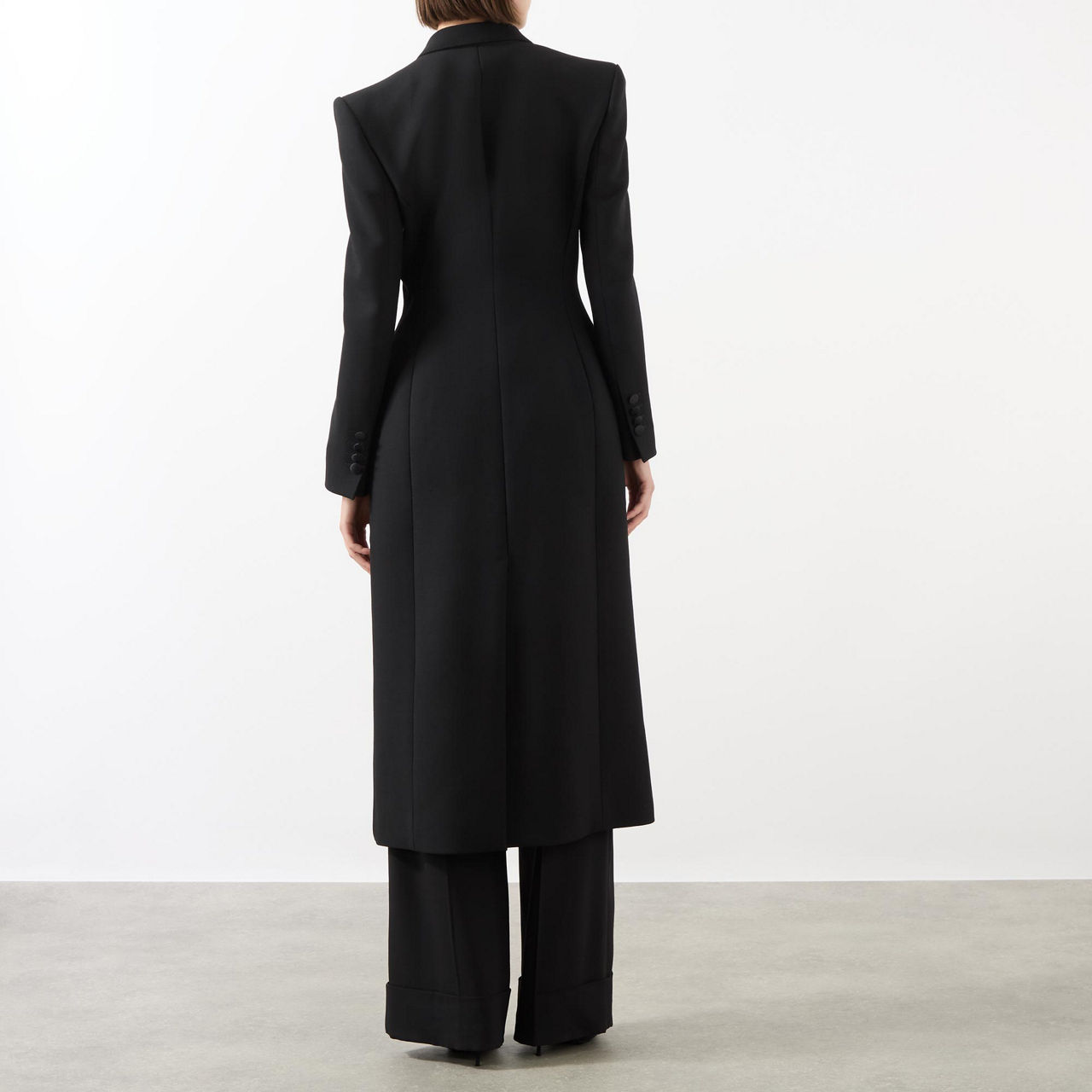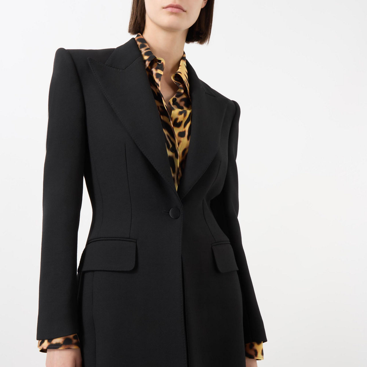 - Peaked lapels, single-breasted, button fastening, flap pockets, structured shoulders, straight hemline