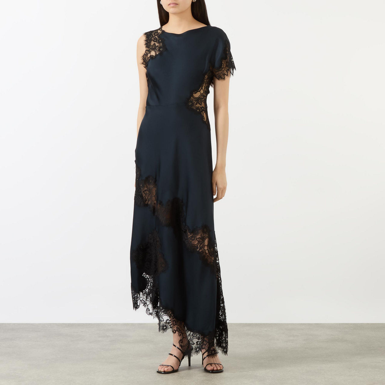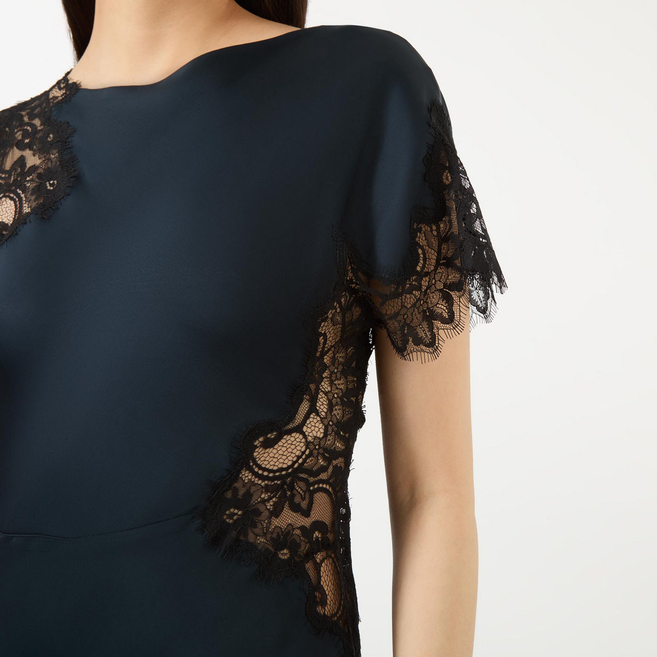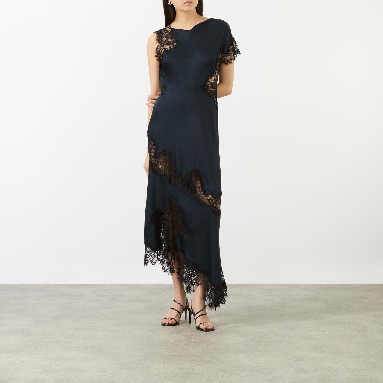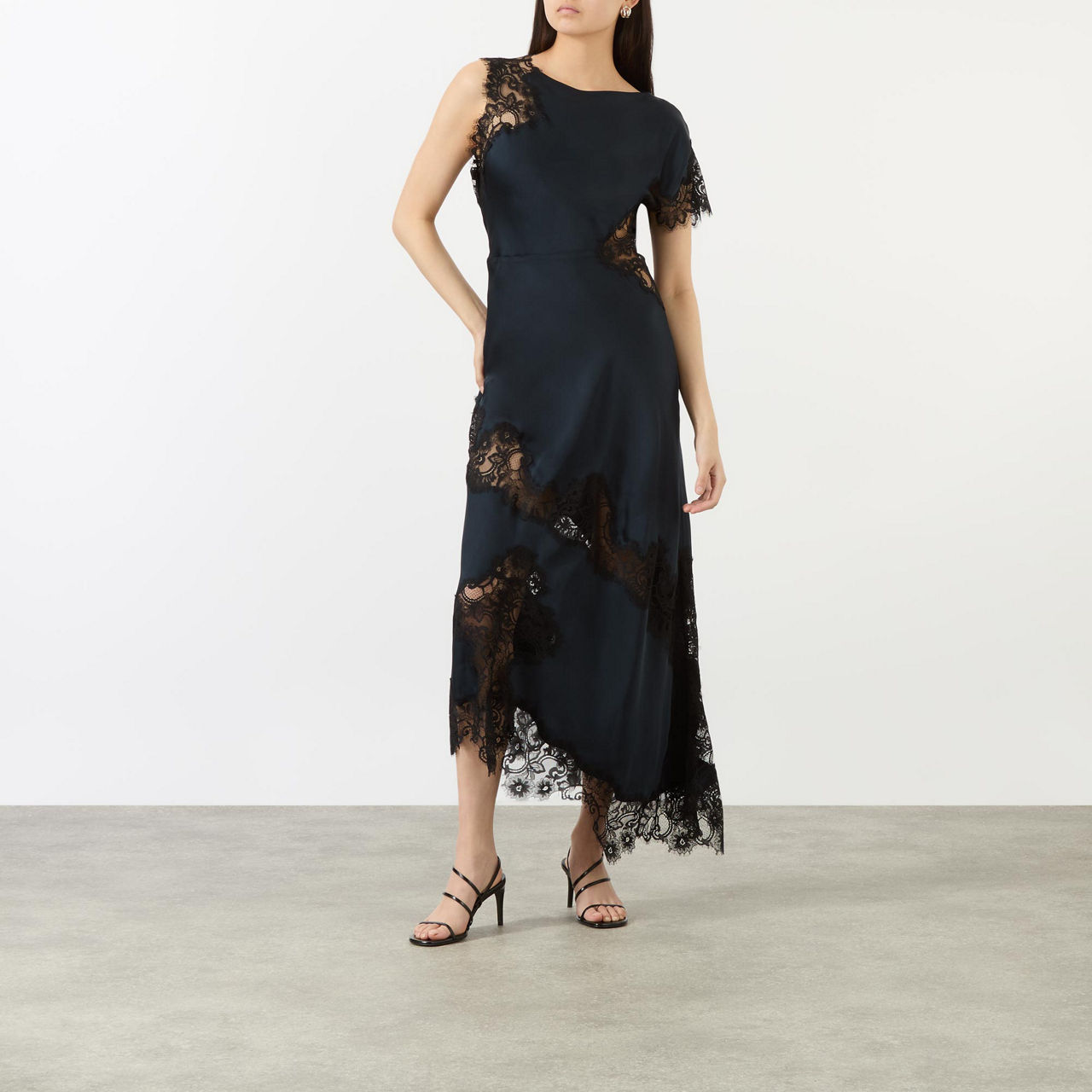- Slit neckline, asymmetric sleeves and hemline, sheer lace panels, smooth satin, midi length