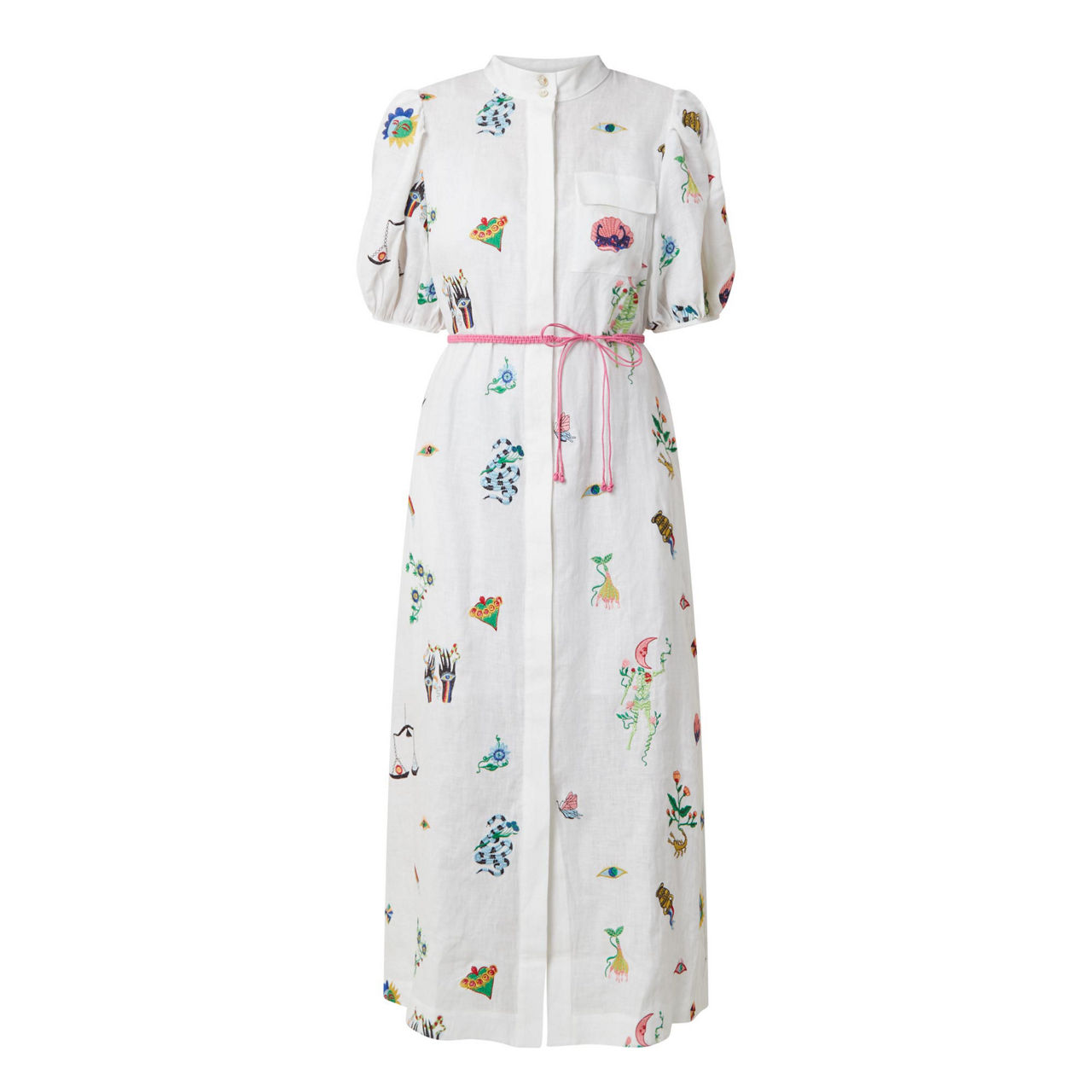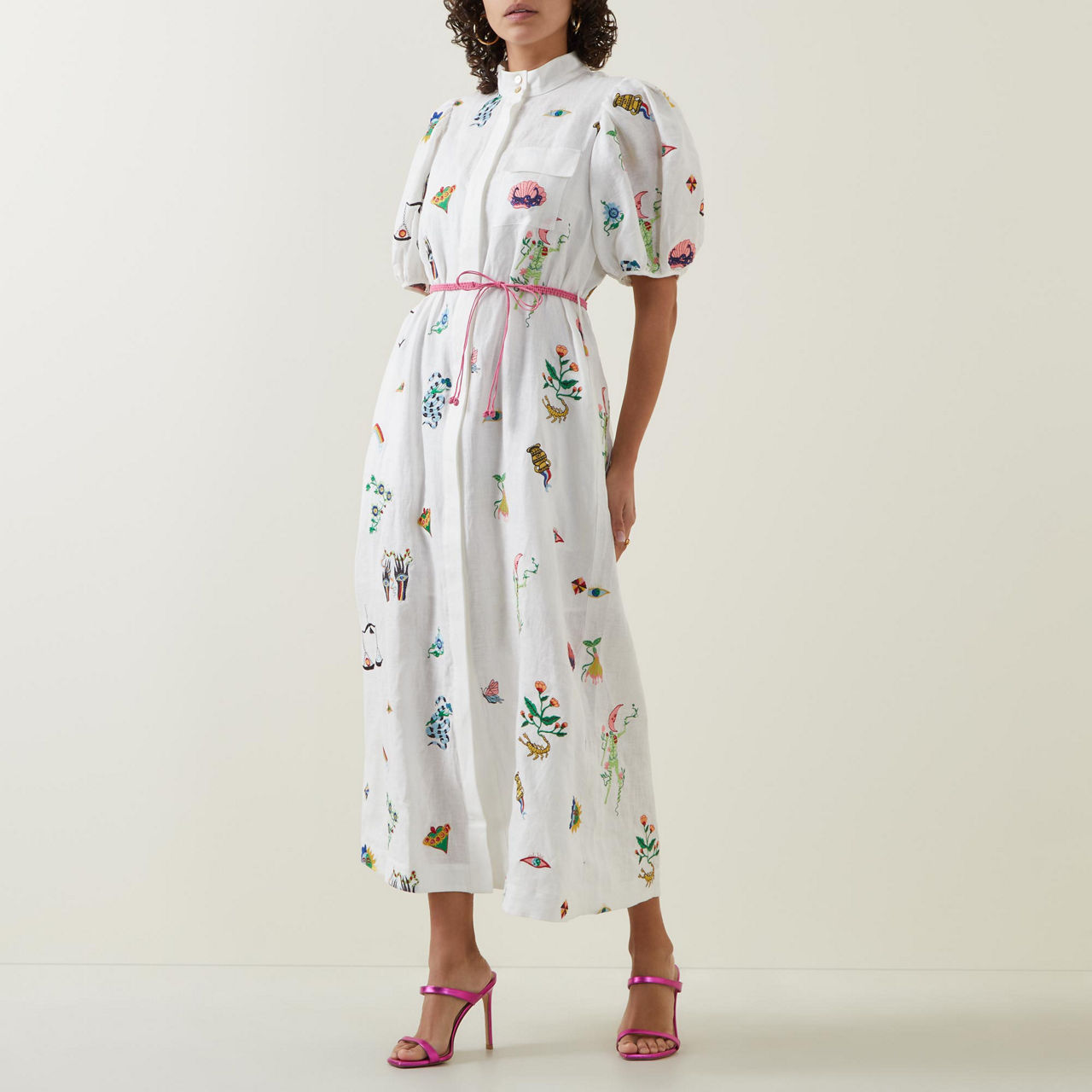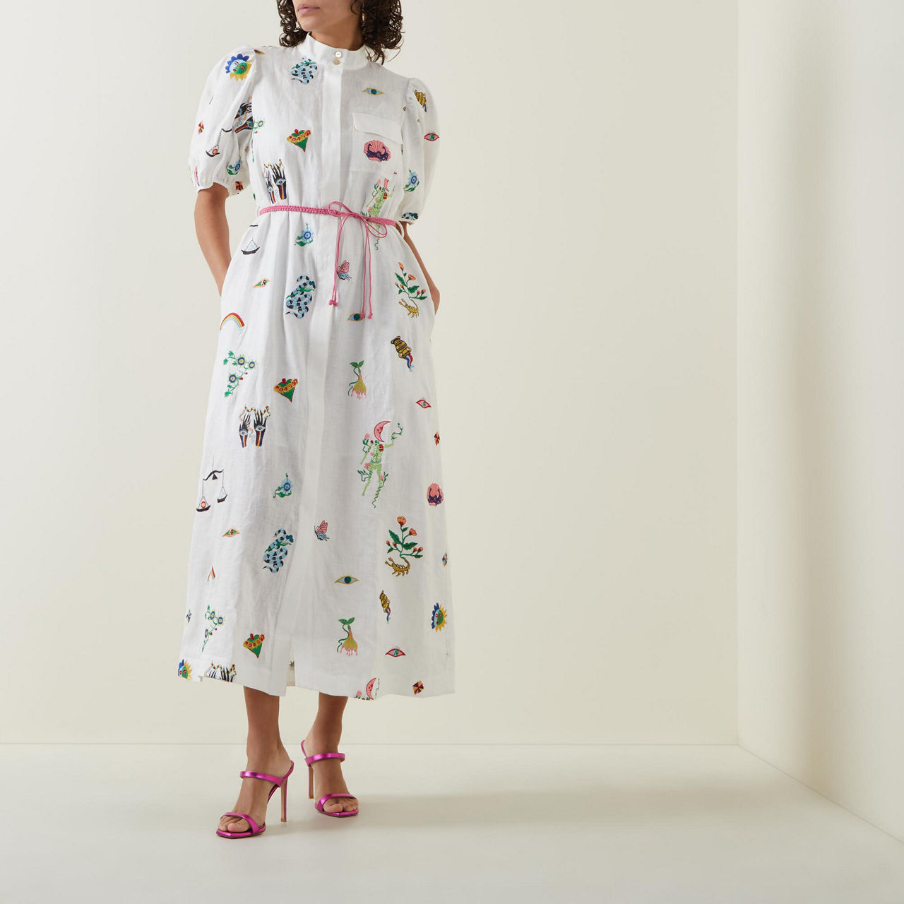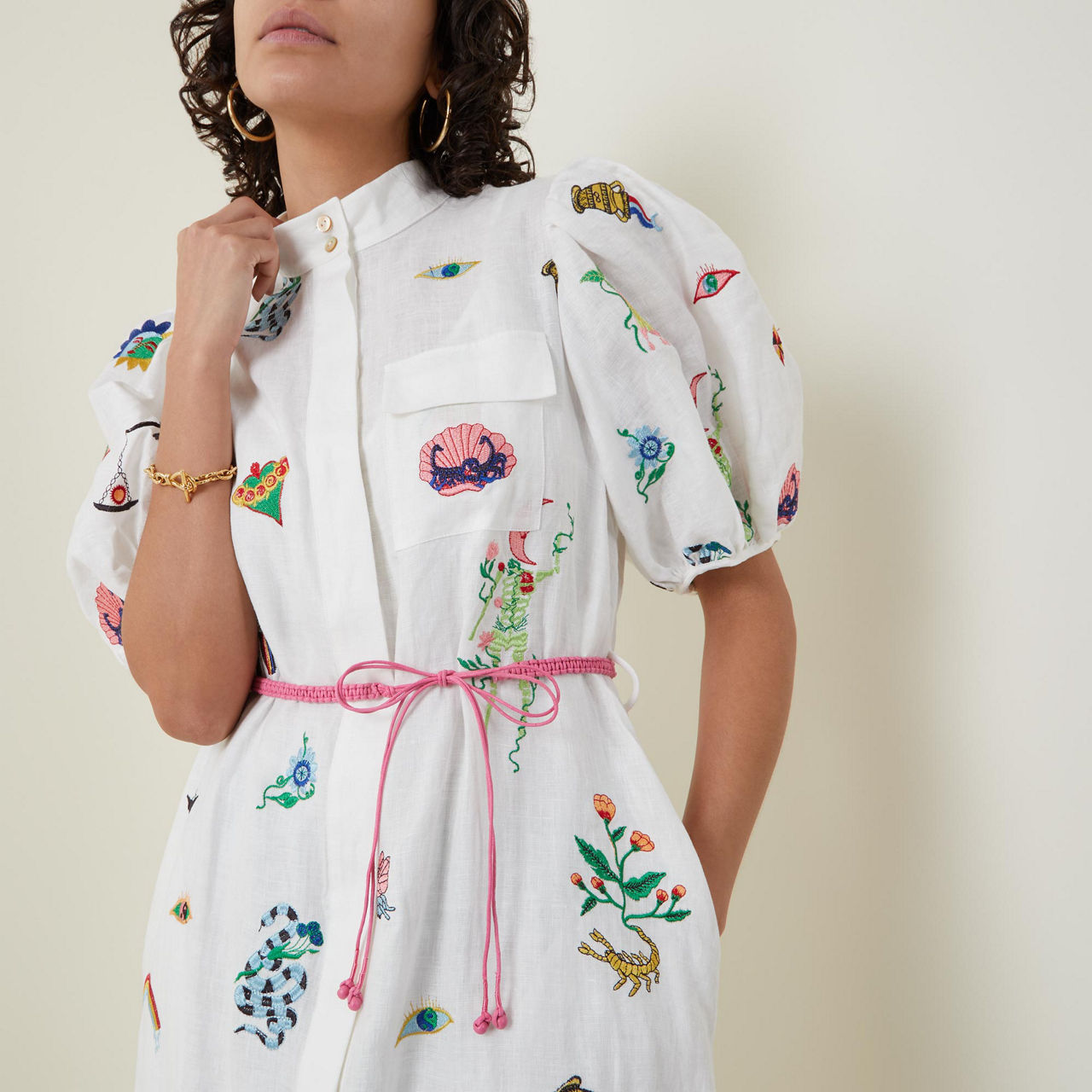 - Stand-up collar, half-length balloon sleeves with bound cuffs, back yoke with box pleat, one chest flap pocket, concealed front button placket, self-tie waist belt, all-over embroidered design, midi length