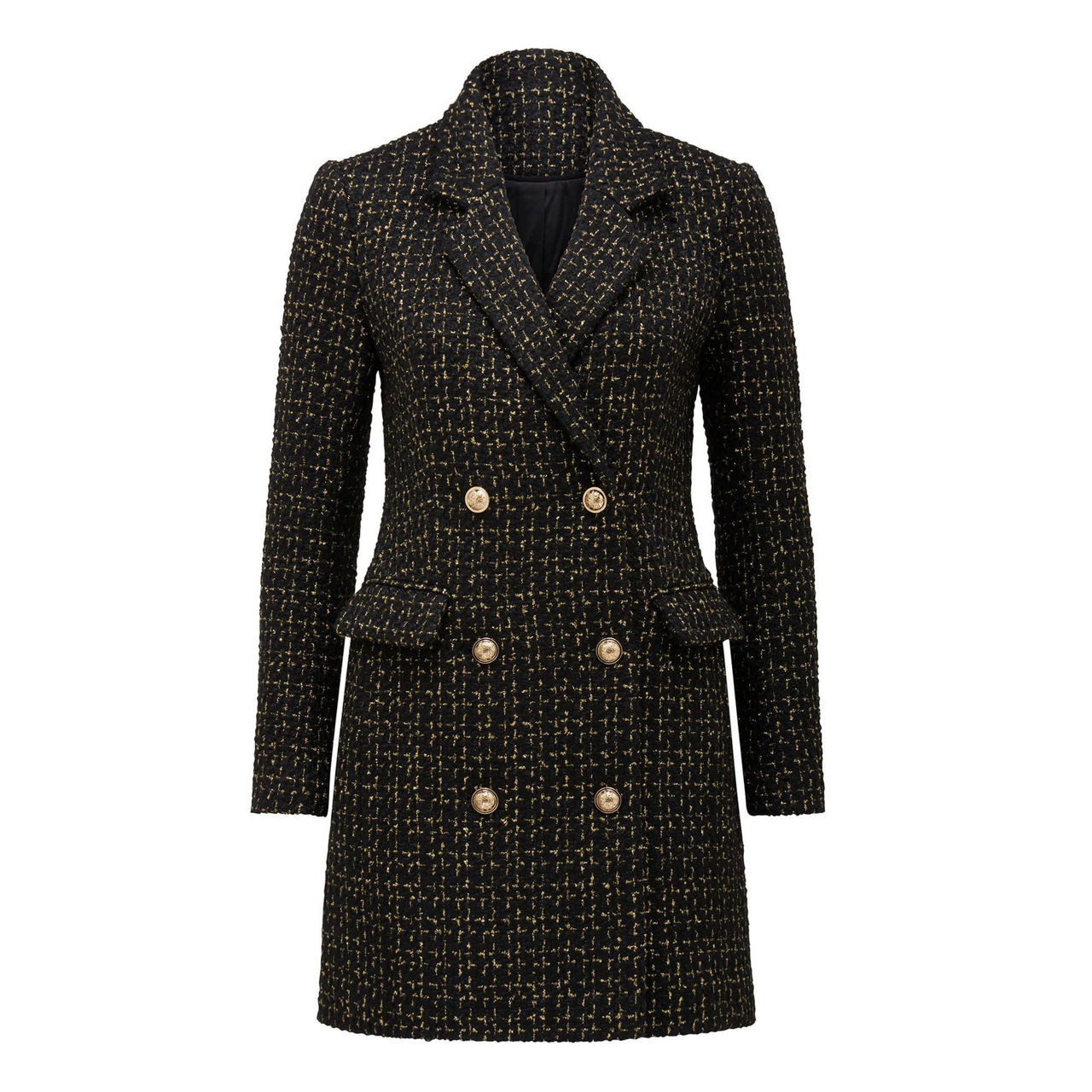 - Tailored fit, tweed, front flap pockets, front gold-tone button fastening, lined