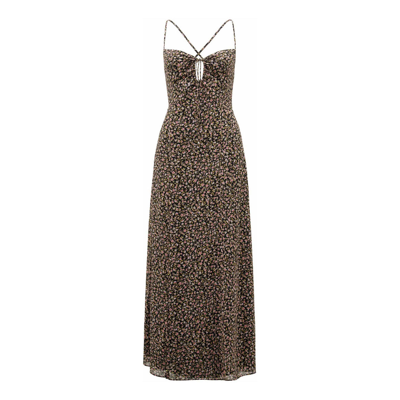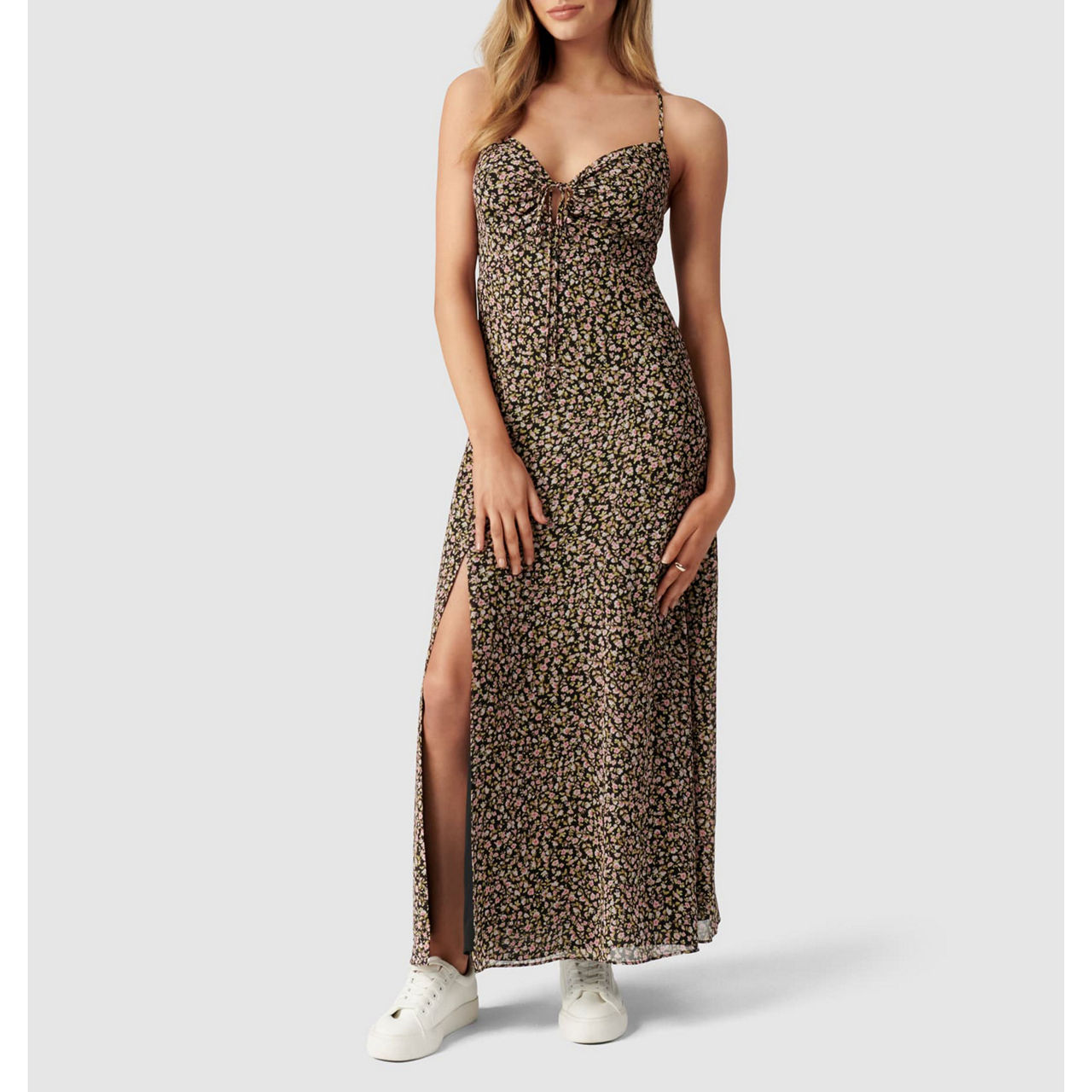- Spaghetti straps, sweetheart neckline, midi length, side slit, floral print, front tie detail.