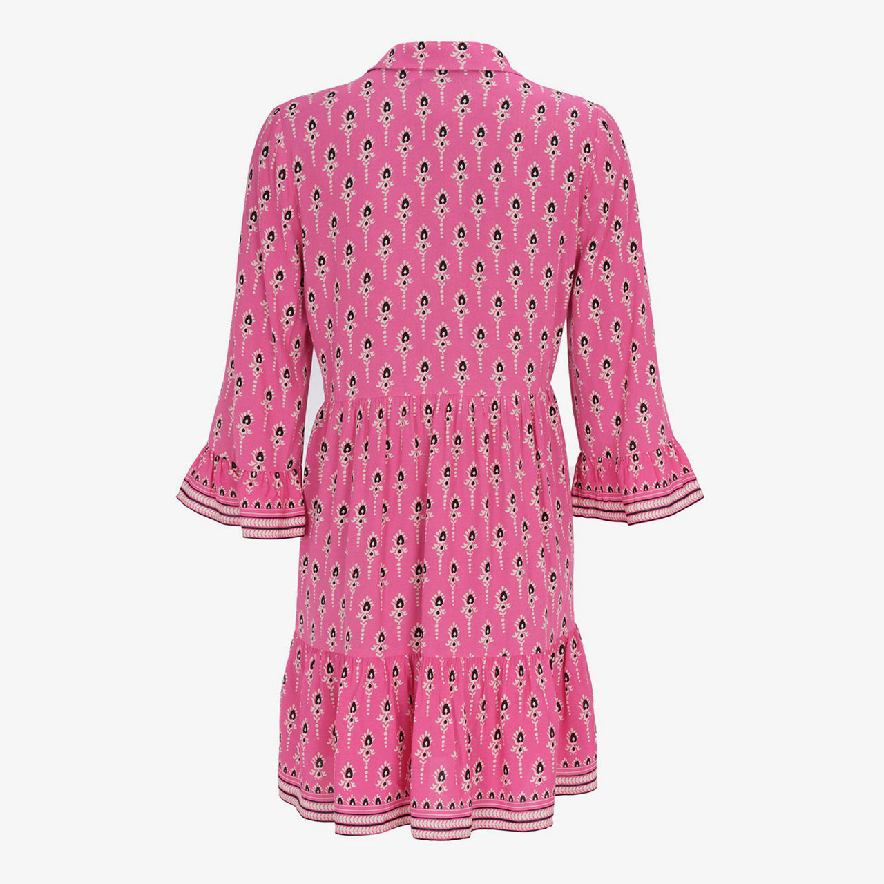 - Slip-on style, long sleeves with fluted cuffs, collared V-neckline, printed design, tiered skirt, smooth fabric