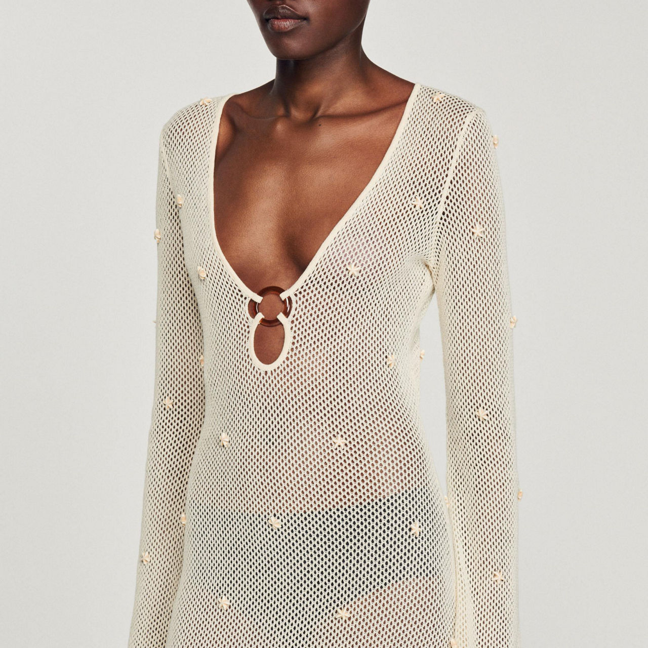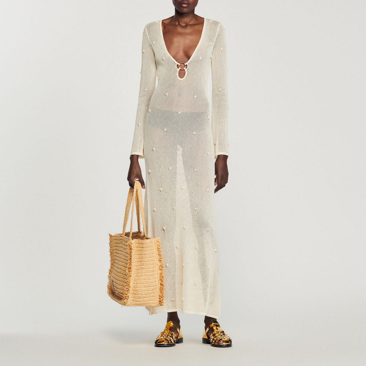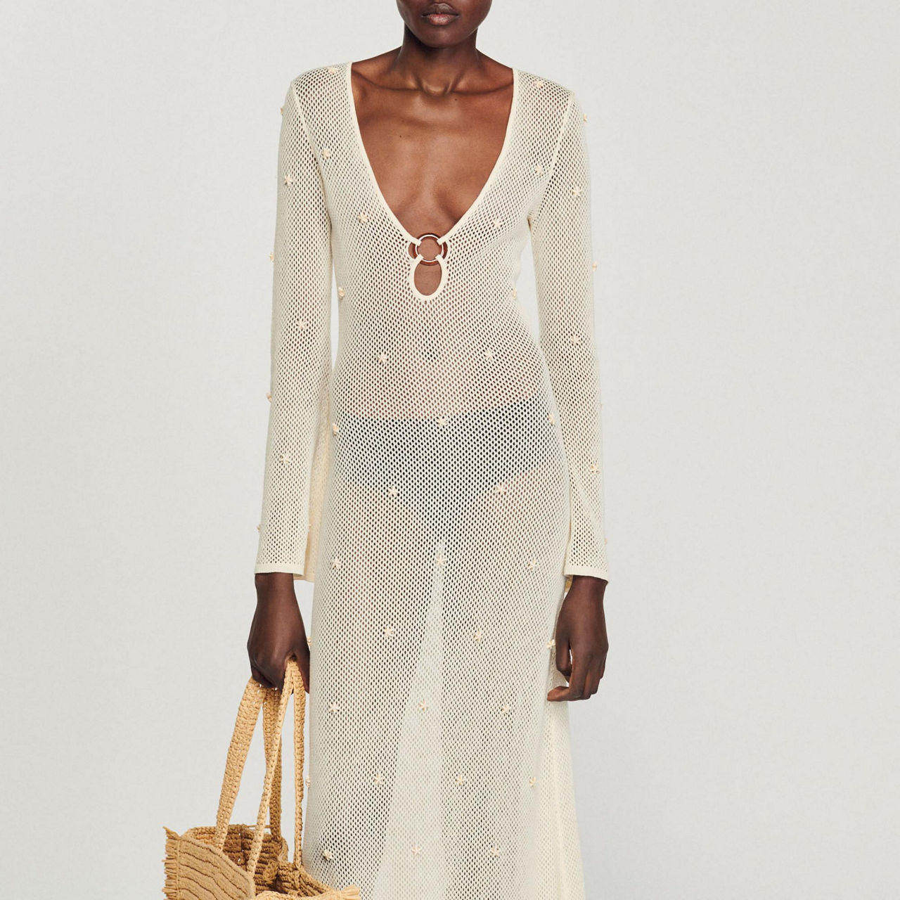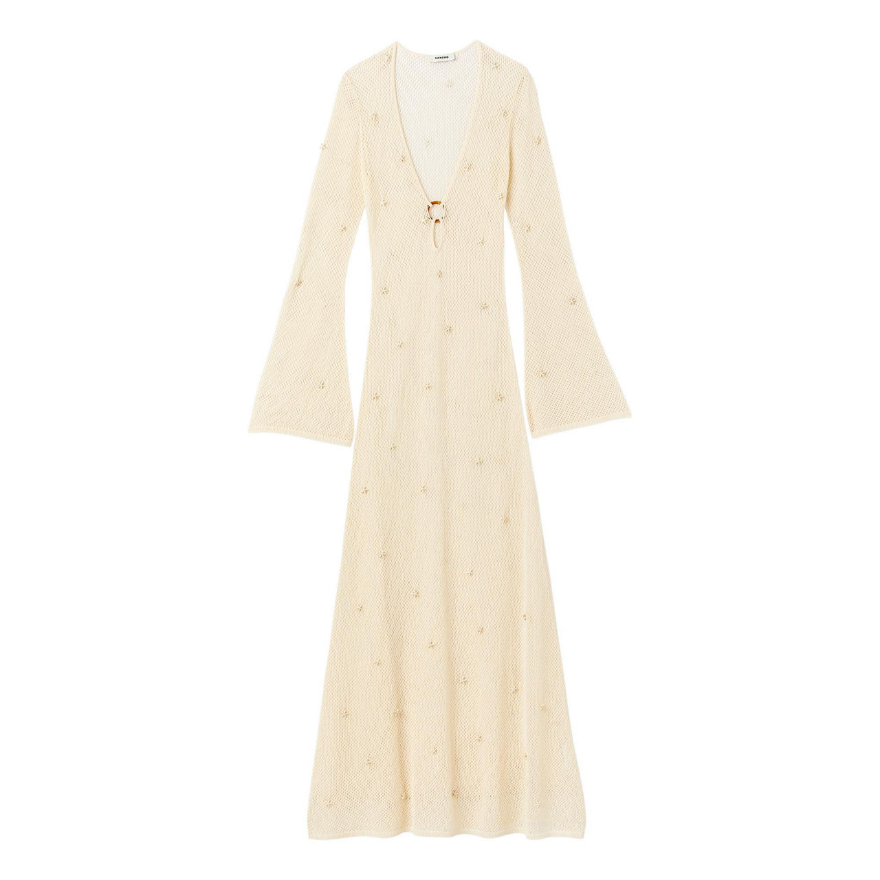 The Coquillage dress from Sandro's SS23 collection is sure to have you beach or poolside ready. Spun from a cotton-paper blend, it is framed with a plunging neckline with a ring detail and long sleeves, while the mesh structure is embellished with star-shaped beaded detailing. Style with flat sandals or wedges to complete the look.