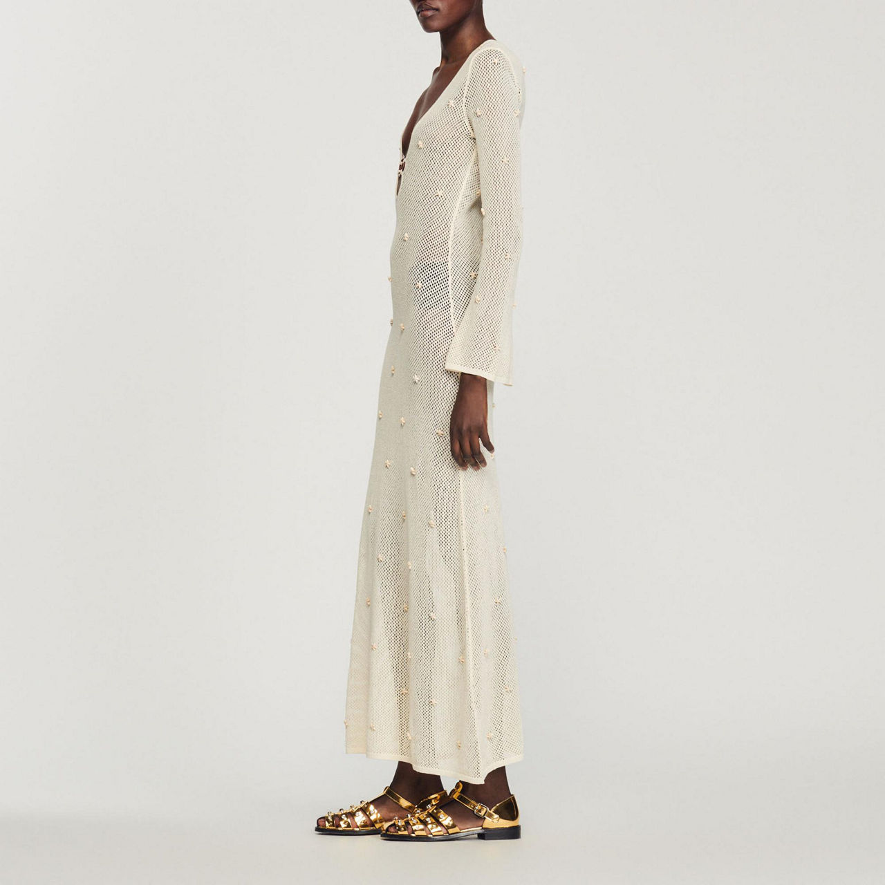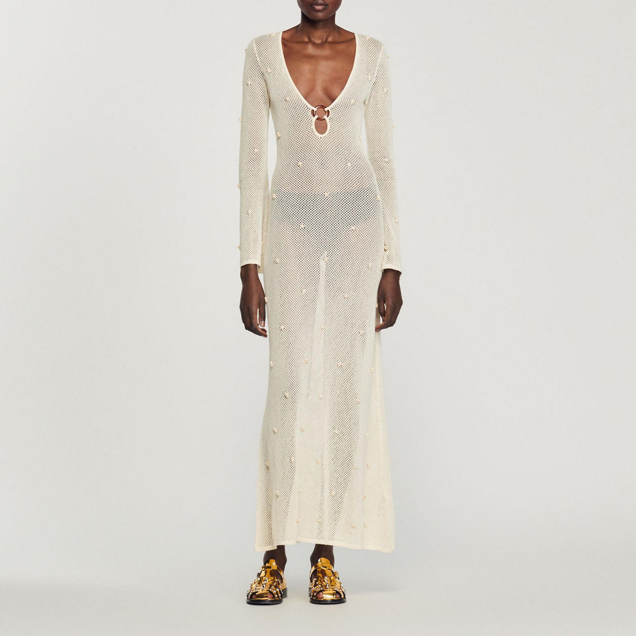 - Maxi, long sleeve, mesh structure, plunging neckline, ring detail, bead embellishment