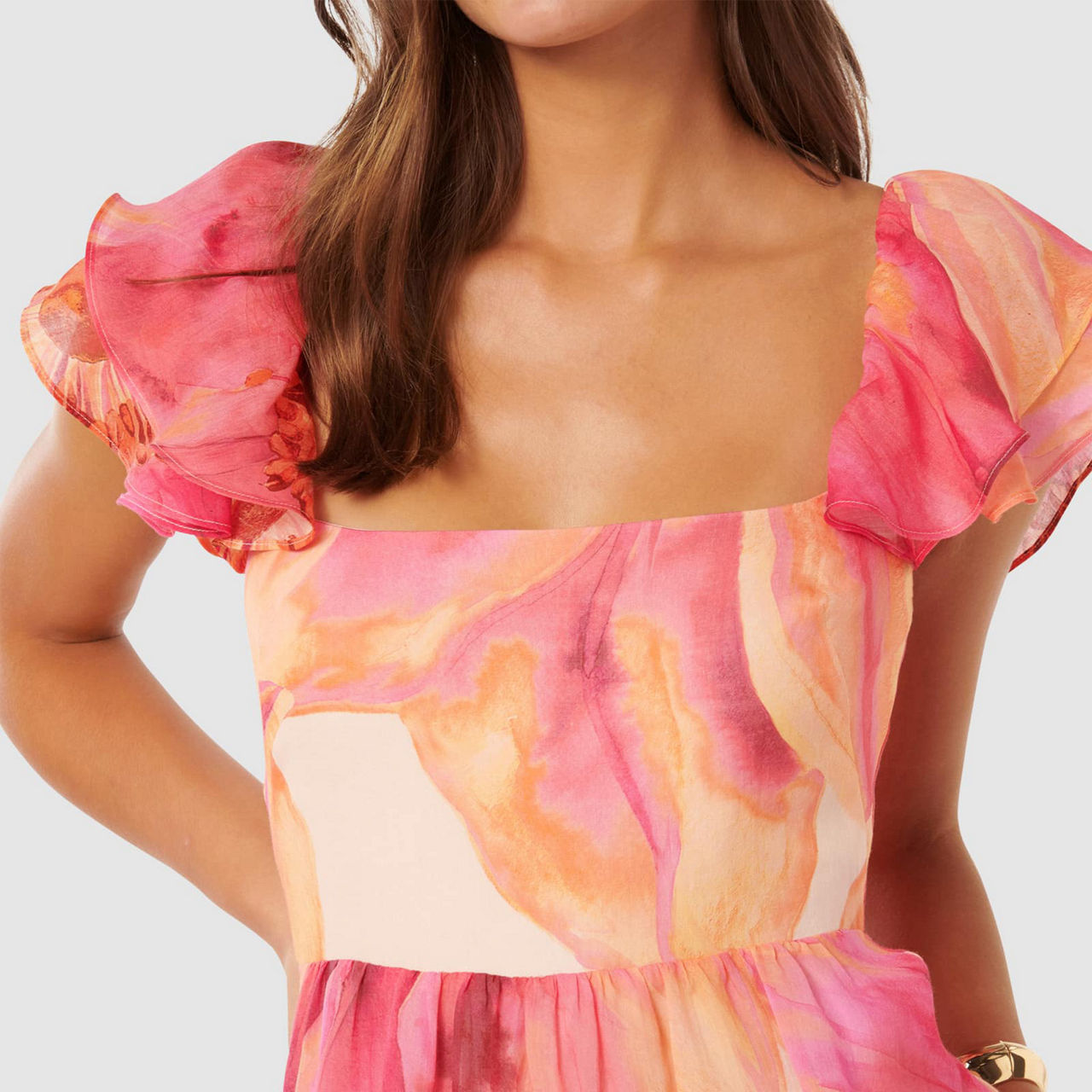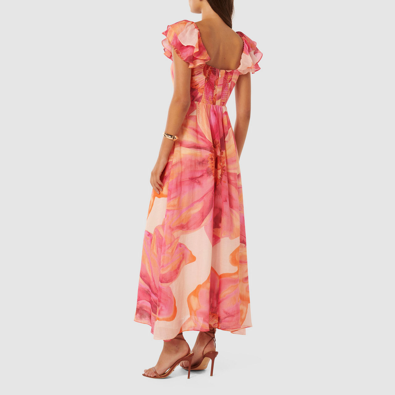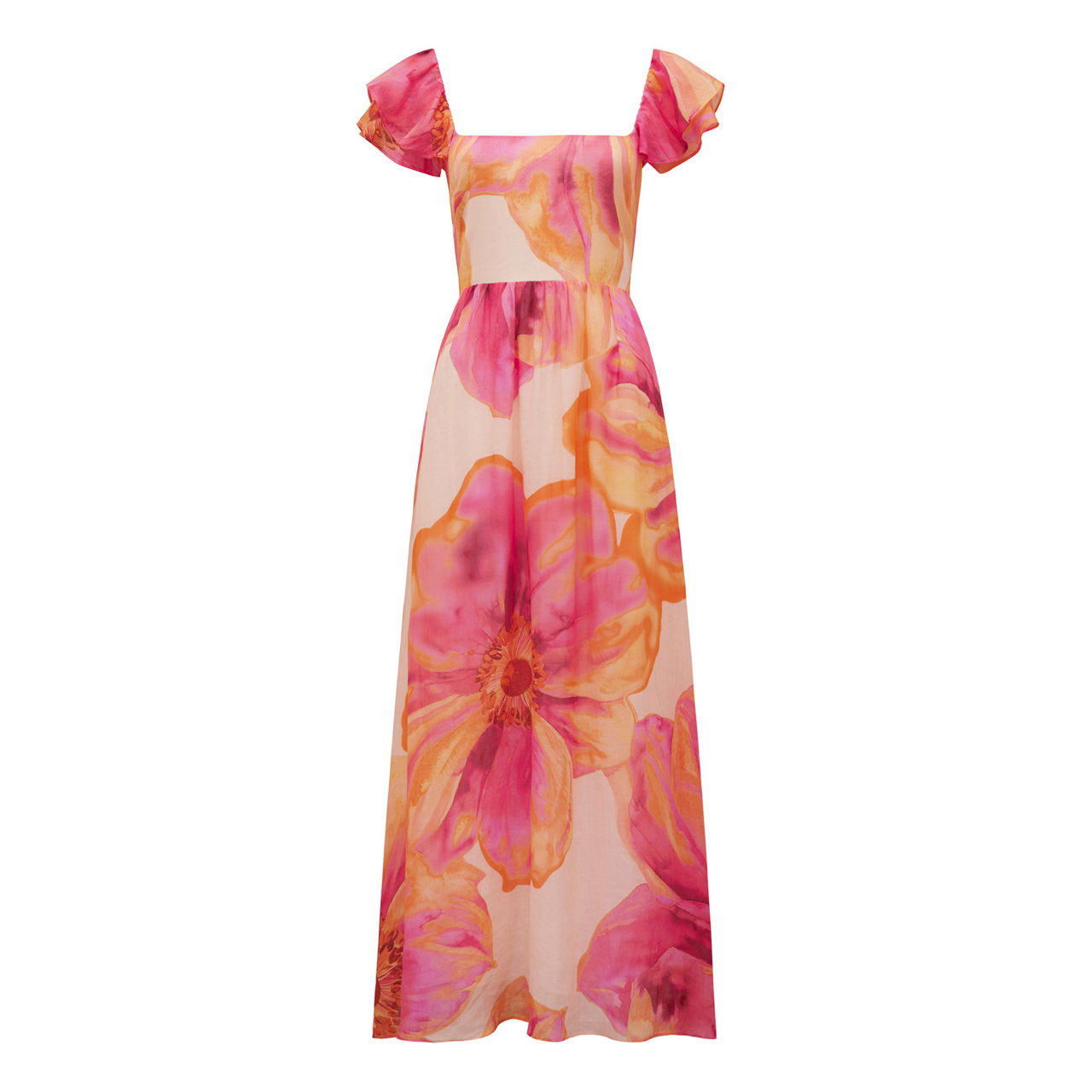 - Midi length, scoop back, square neckline, short flutter sleeves, floral print, rear ruched detailing, zip fastening, lined