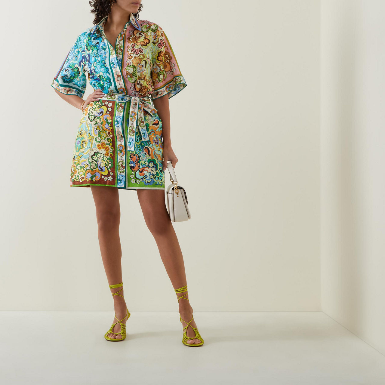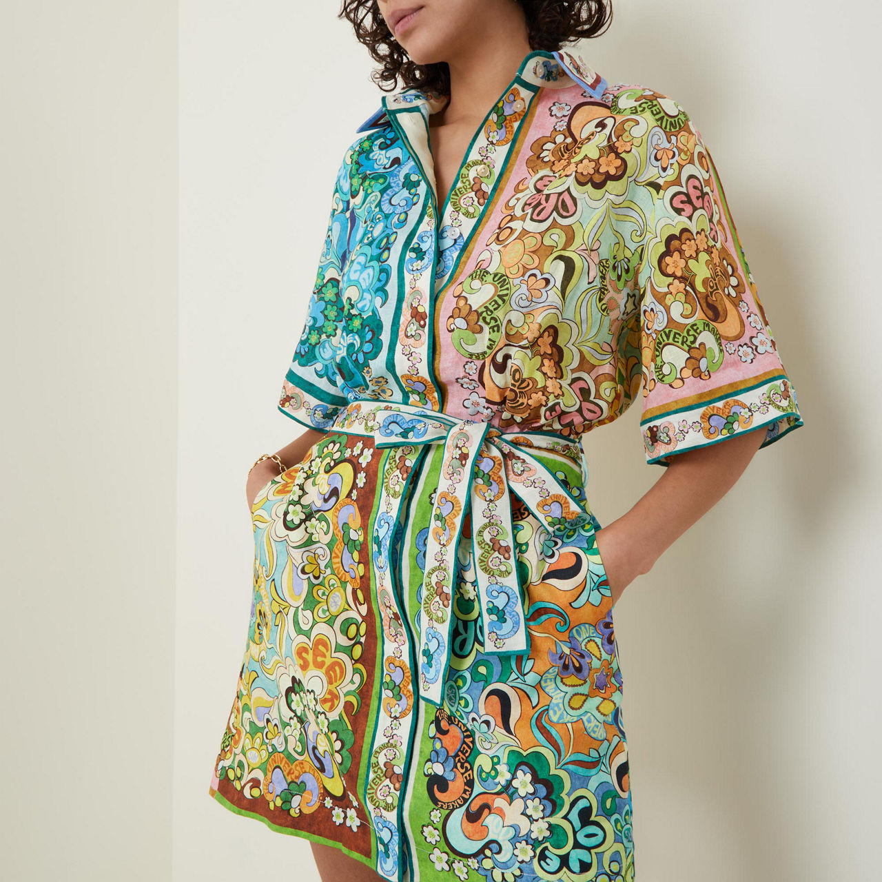 - Classic point collar, dropped shoulders, half-length sleeves, concealed front button placket, self-tie waist belt, two side slit pockets, all-over printed design, mini length